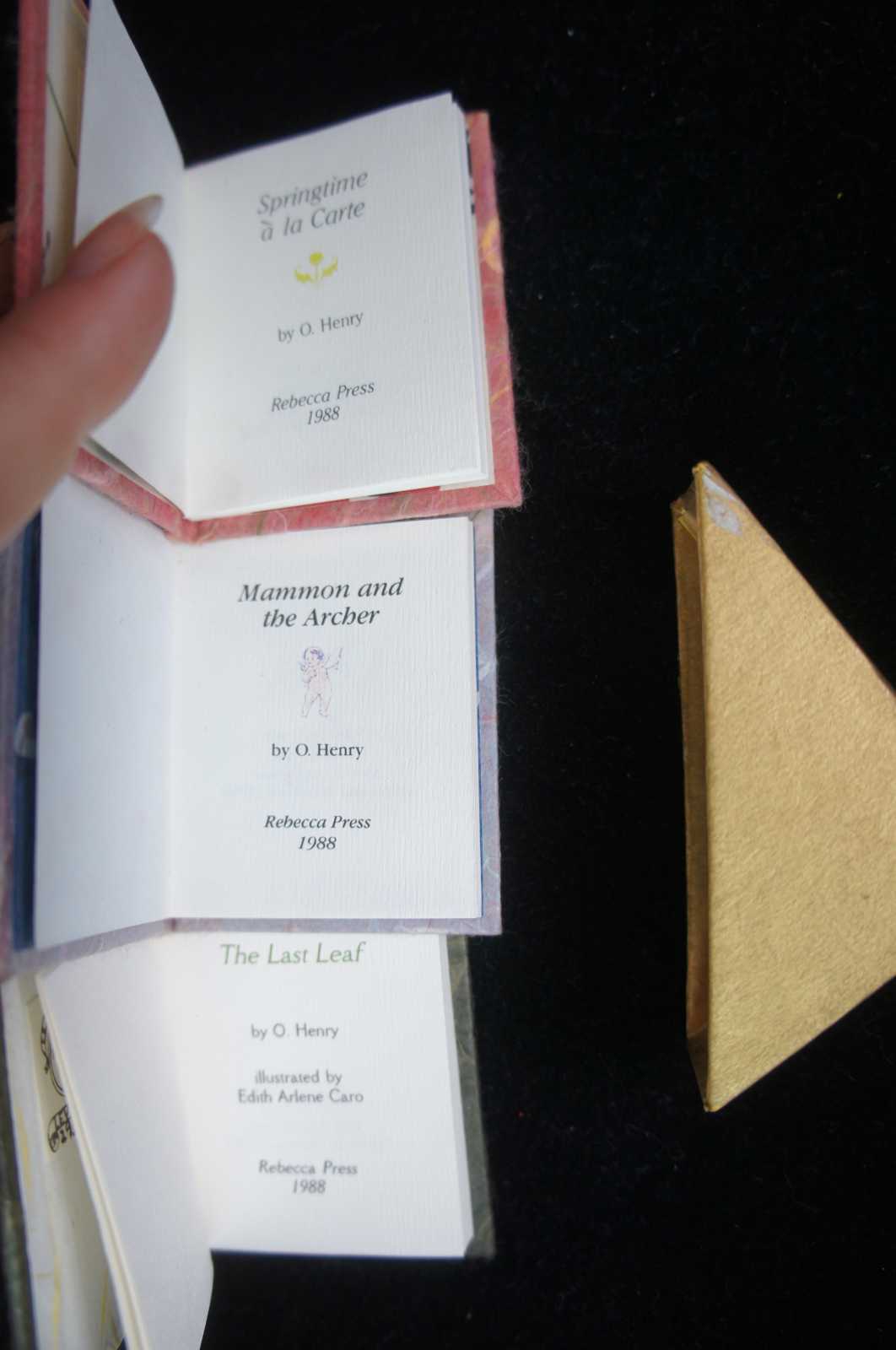 Springtime a la Carte, Mammon and the Archer, The Last Leaf by O. Henry, Rebecca Press 1988 (Hyattsville, MD: Rebecca Press, 1988. 3 volumes, each 2 x 2 9/16"". Textured homemade paper over boards (mauve, purple, dark green), beautiful endpapers, metallic slipcase, title on cover and spine, photocomposed, small illustrations, handsomely bound by Donald Brady, illustrated by Edith Caro, Limited edition of 200 copies, each volume numbered and signed by publisher Rebecca Bingham, in fine condition. (Bradbury, Rebecca Press 17-19)Rebecca Saady Bingham has been designing and publishing miniature books since 1983. Her beautiful books are best known for their artistic details in the illustrations and bindings. She has complete control over the whole process, from choice of subject, to book design and types of materials used. These delightful books tell three short stories by O. Henry, a pseudonym of William Sydney Porter (1962 - 1910), an American author whose tales romanticize the commonplace, often set in New York City.)