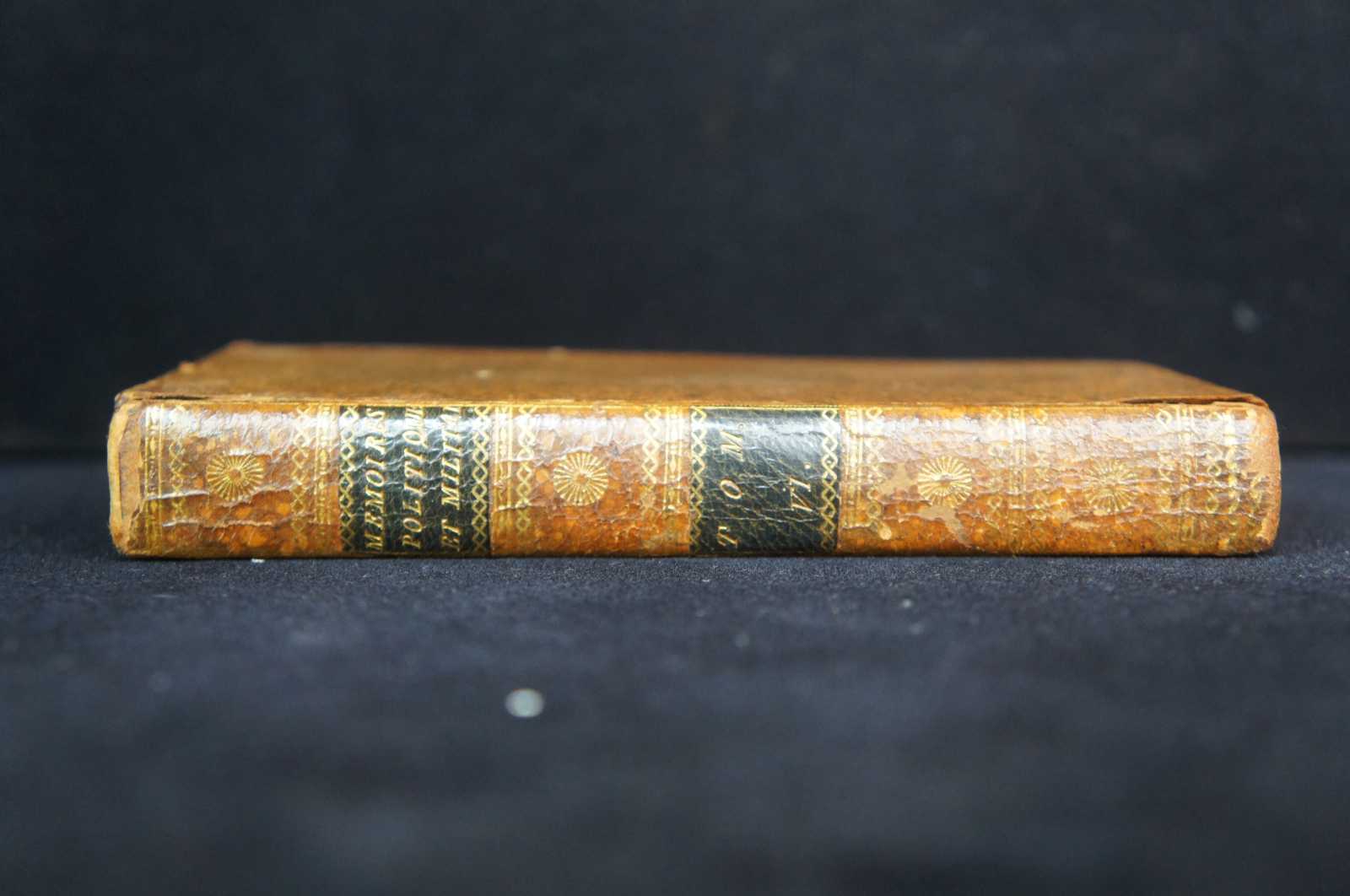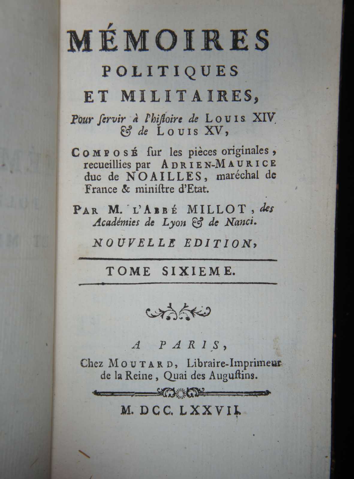 Antique French leather bound book titled Memoires Politique et Militaires, sixth edition, date 1776.