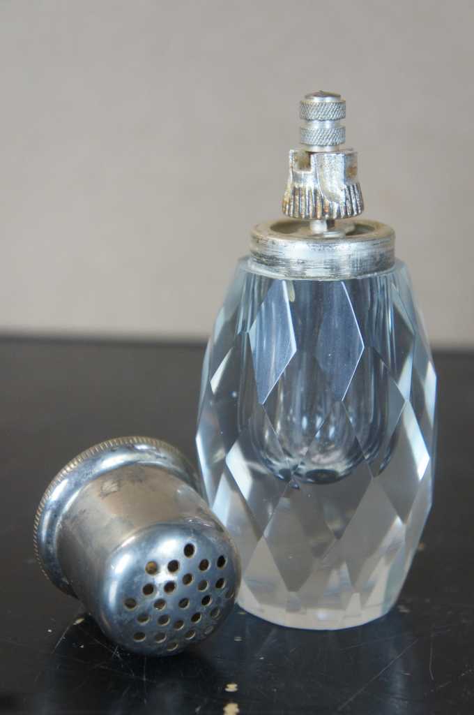 Gently used - tarnish to lids; some tiny chips on large bottle; small bottle lid does not stay on securely; medium bottle tube broke apart during photographing/bulb rubber hardened with age; see pictures