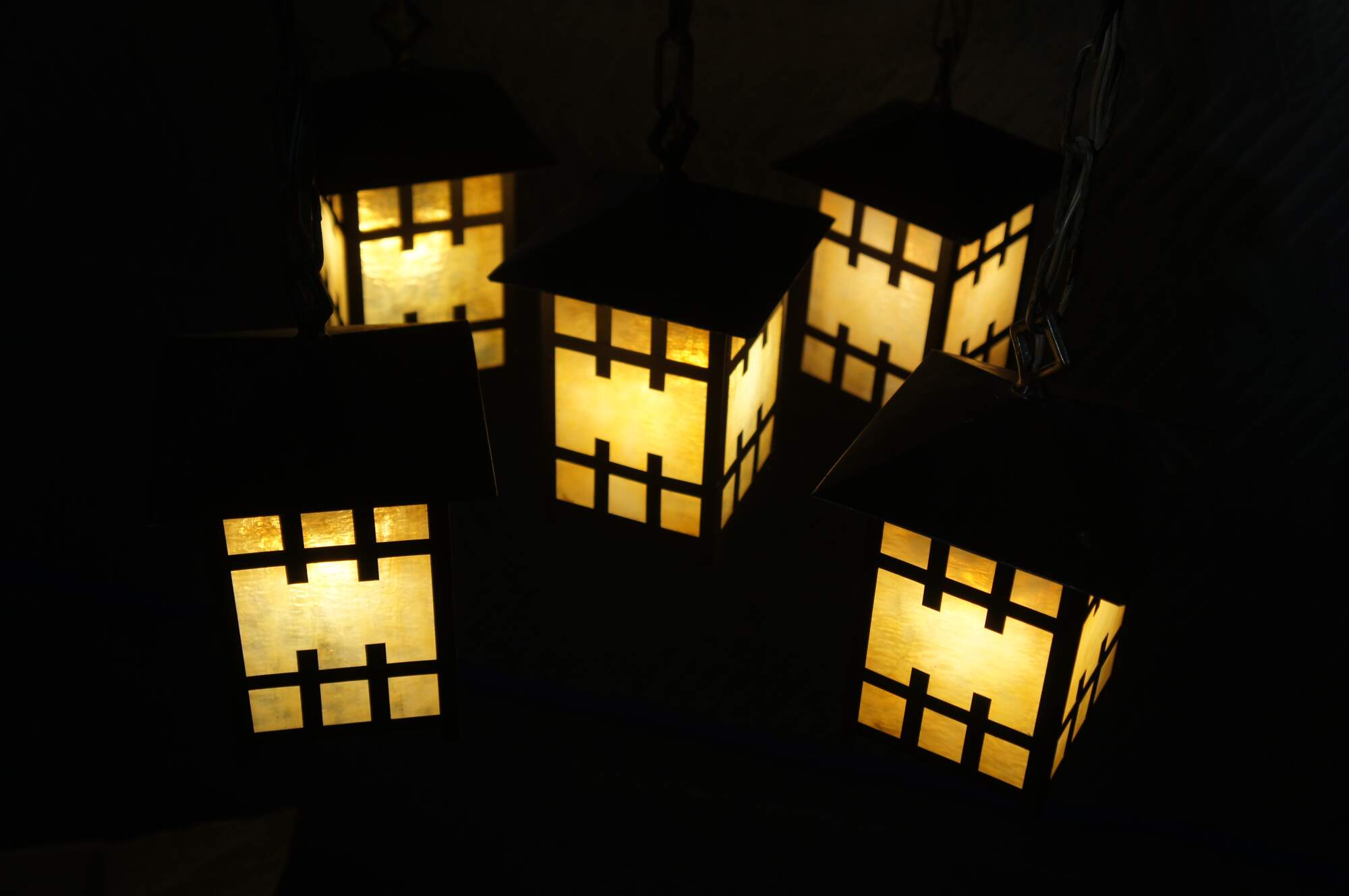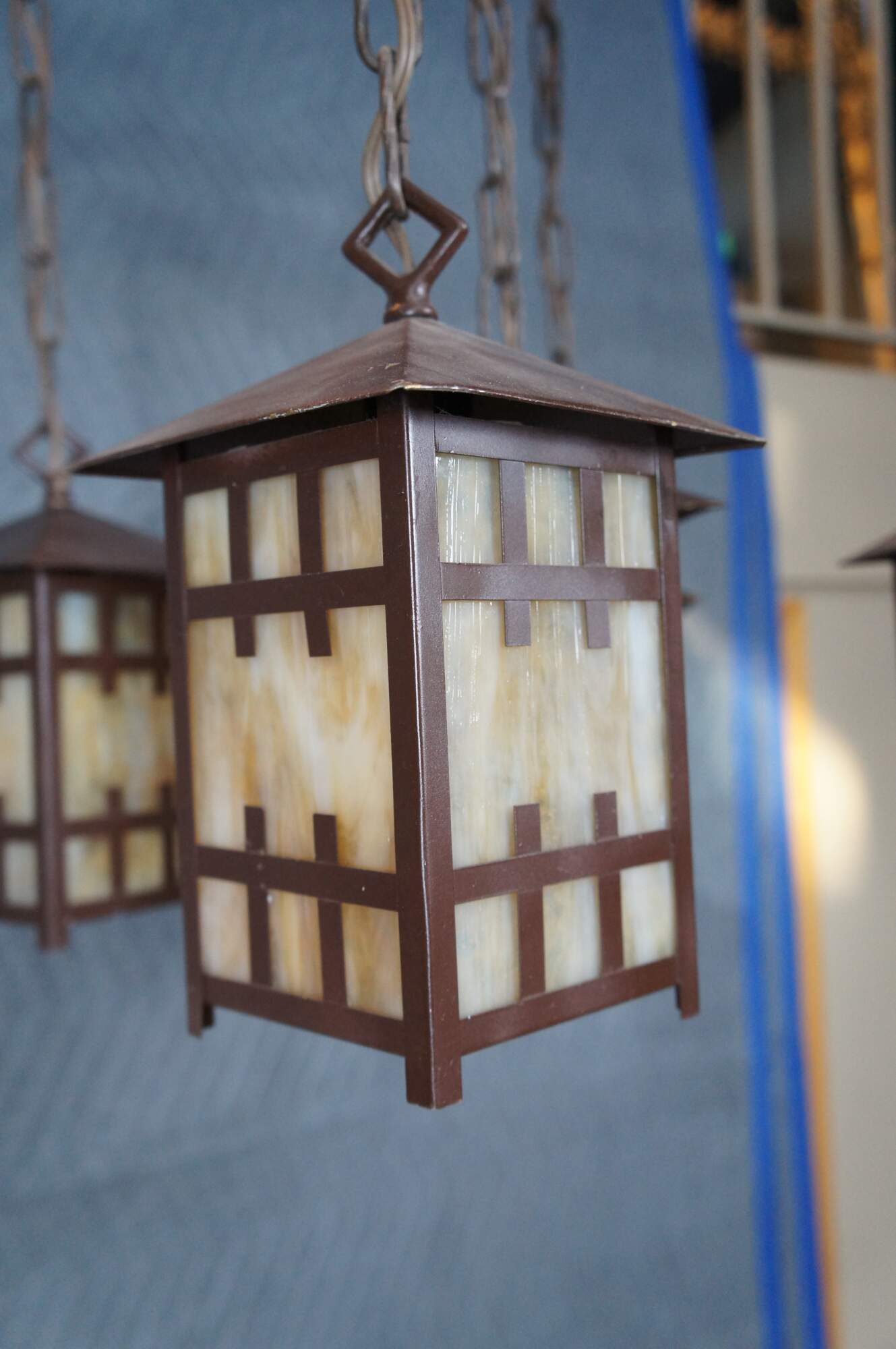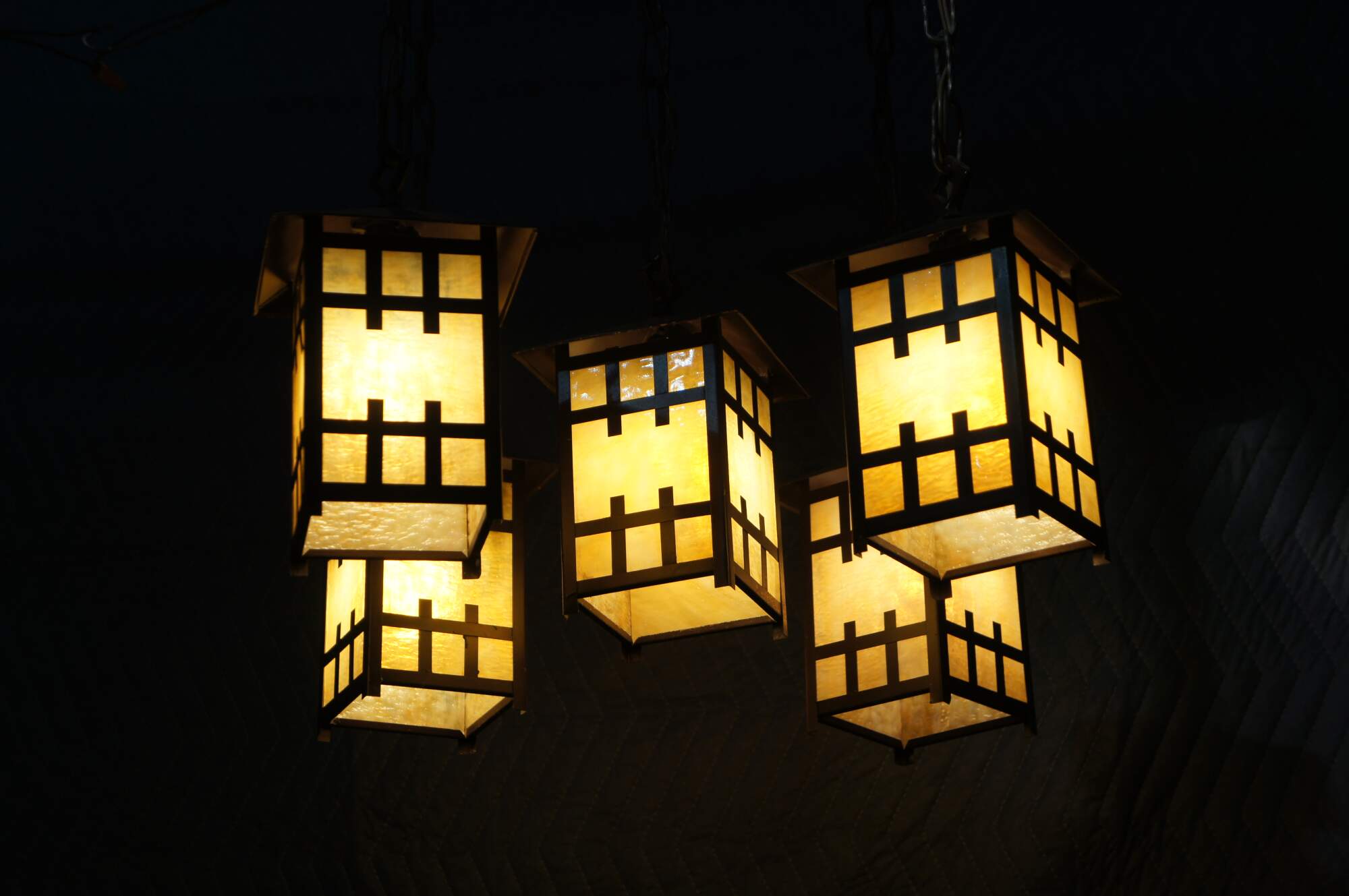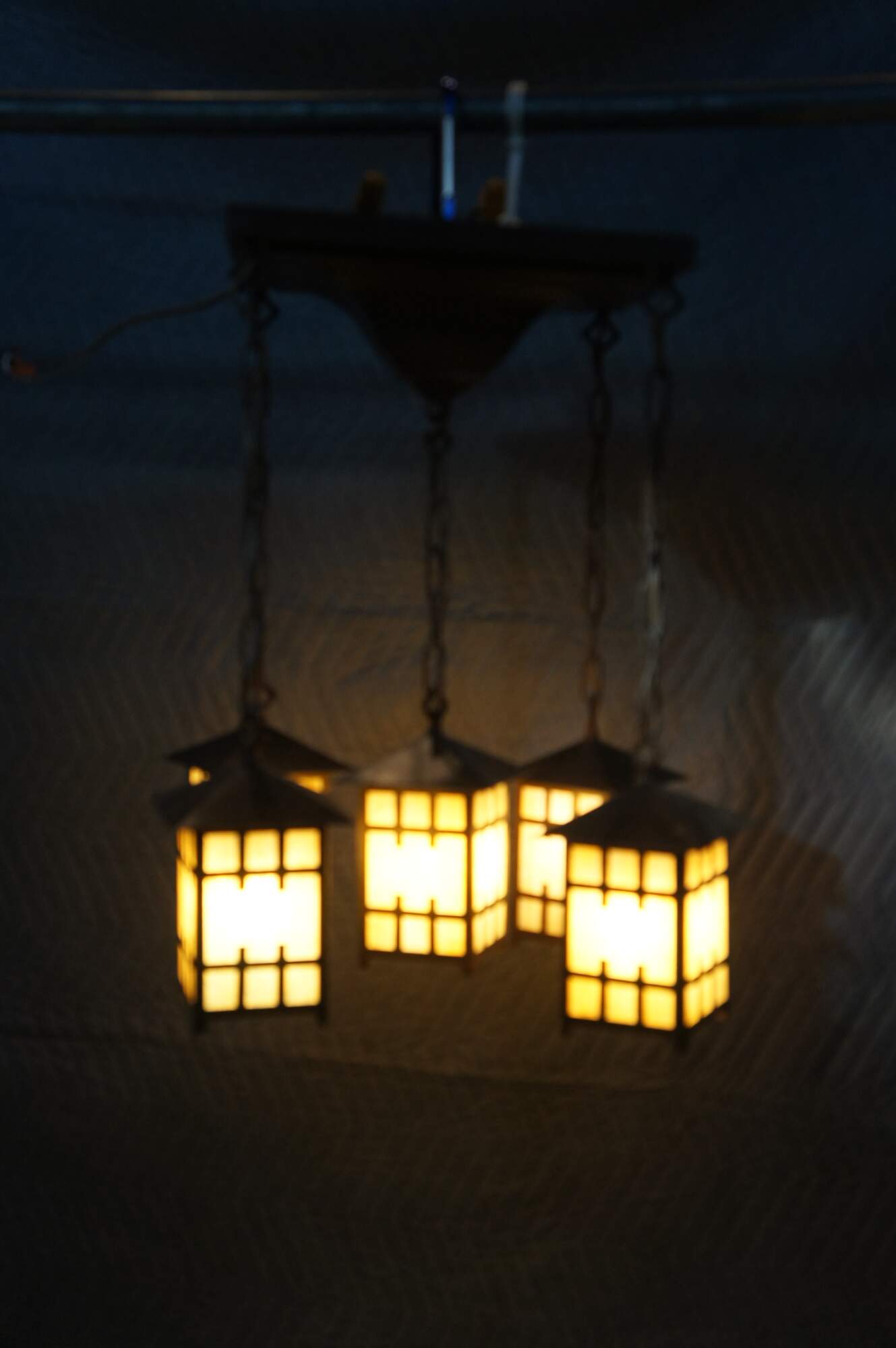 A beautiful Mission style chandelier designed in the manner of the originals built by Stickley in the early 1900s. Features a central ceiling mount made from metal with 5 chains leading to caged lanterns with lattice design and slag glass coverings. A warm addition to any space.