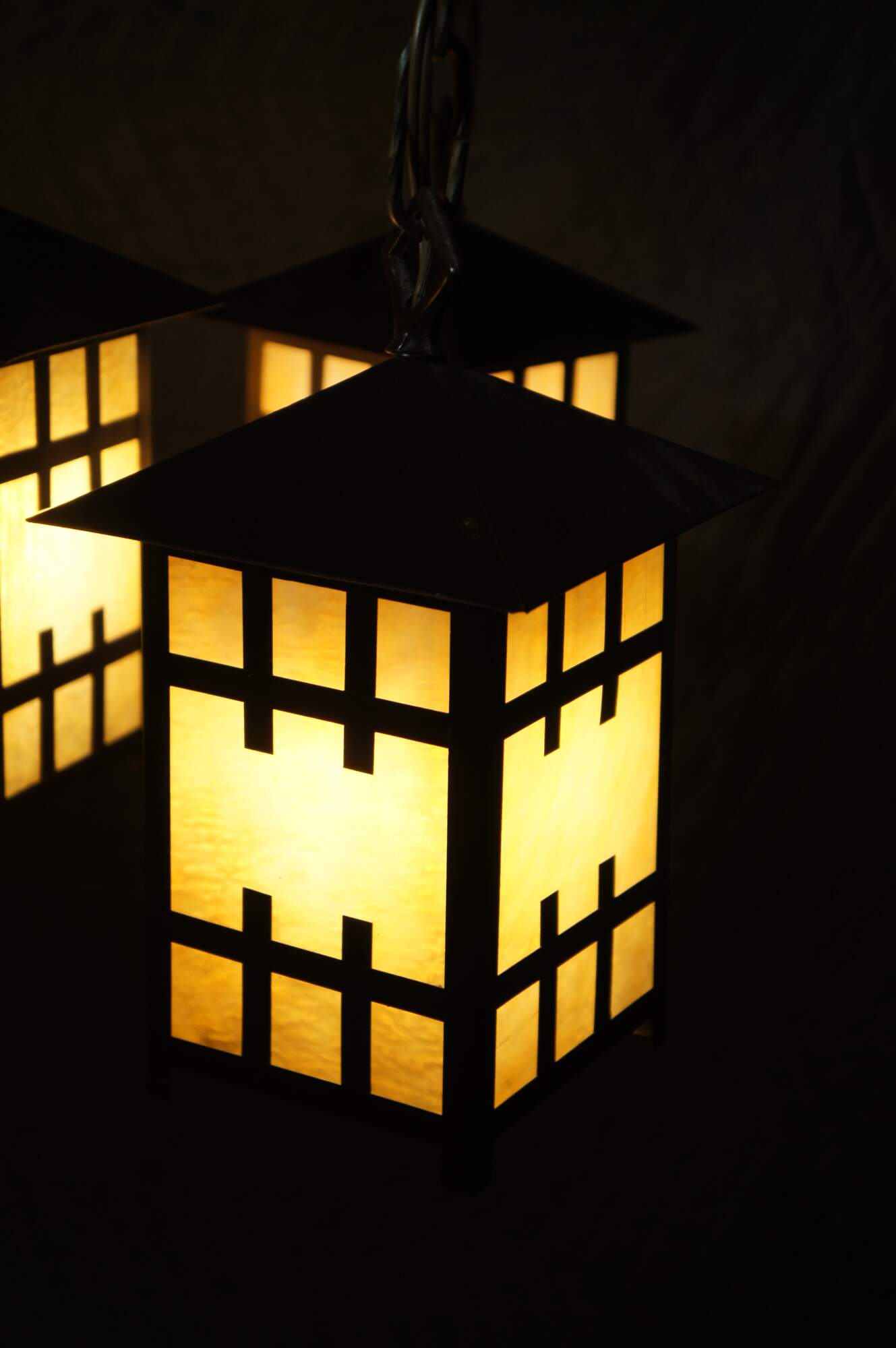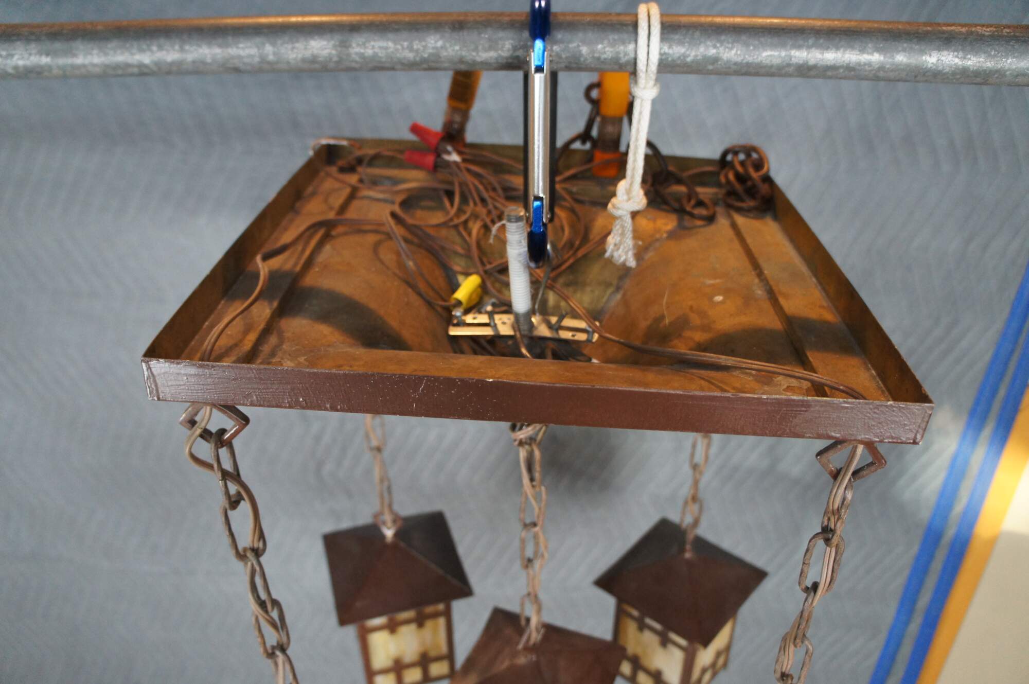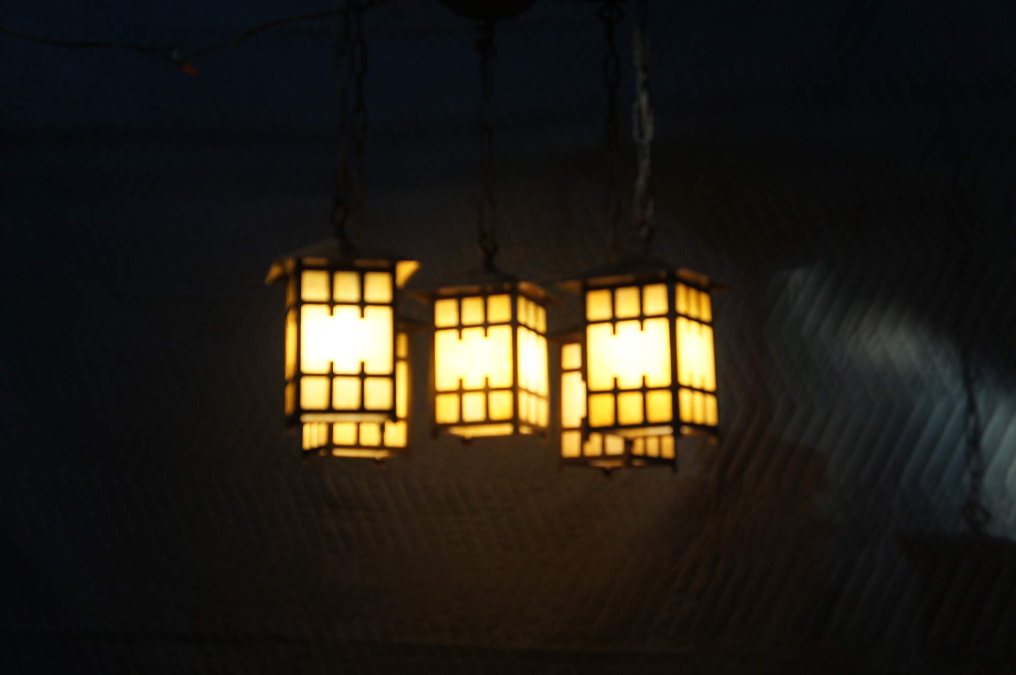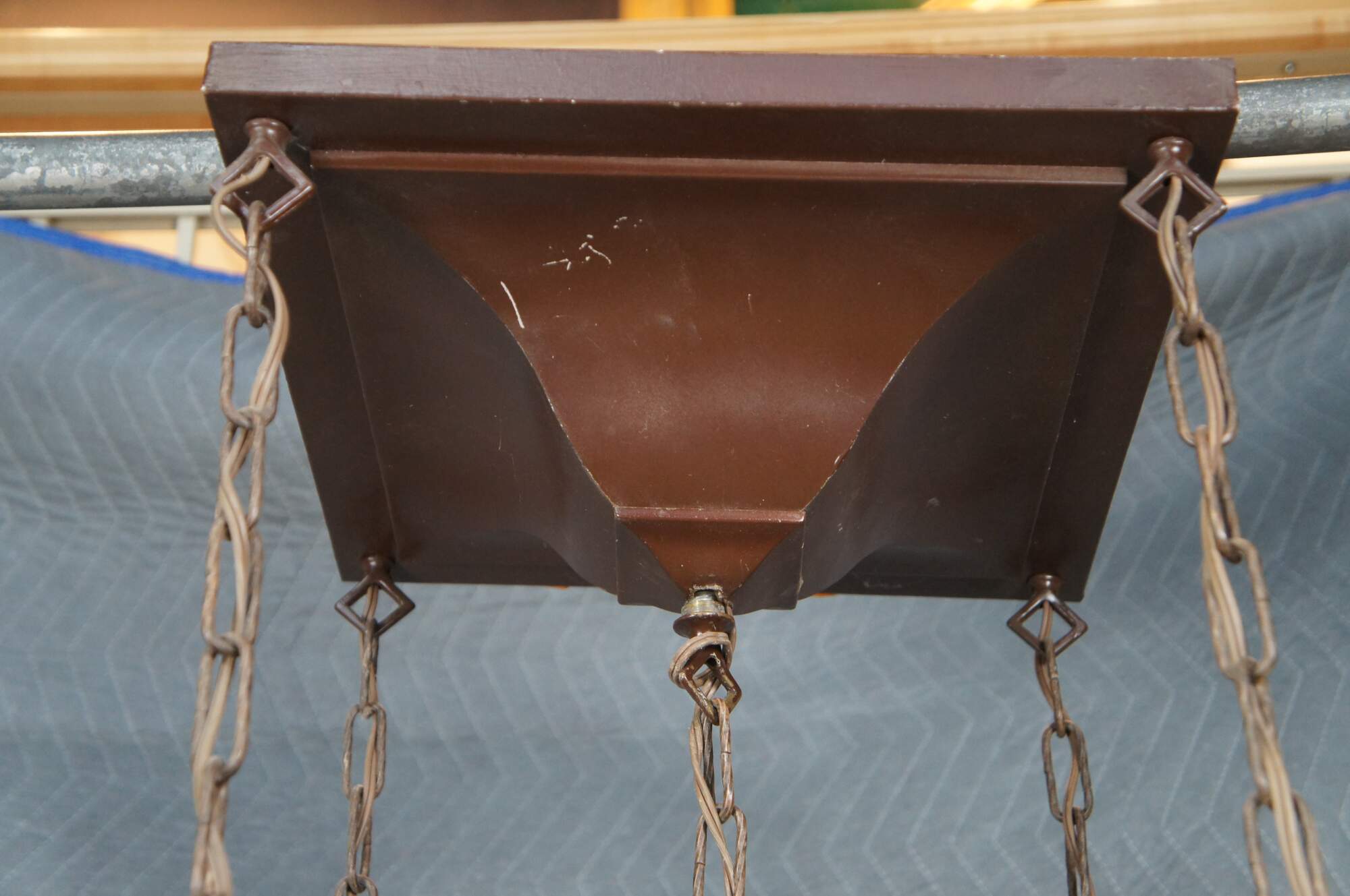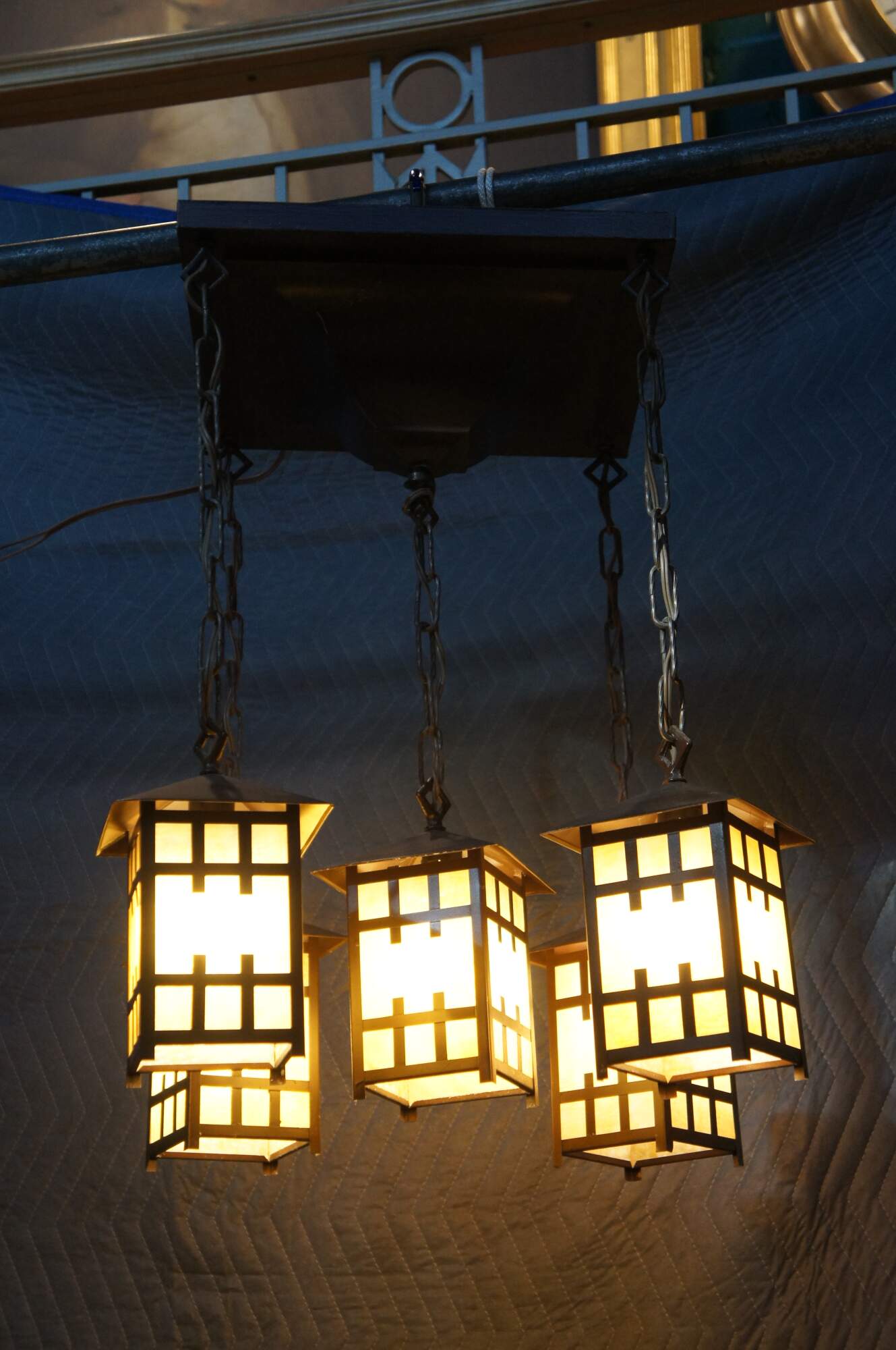 A beautiful Mission style chandelier designed in the manner of the originals built by Stickley in the early 1900s. Features a central ceiling mount made from metal with 5 chains leading to caged lanterns with lattice design and slag glass coverings. A warm addition to any space.