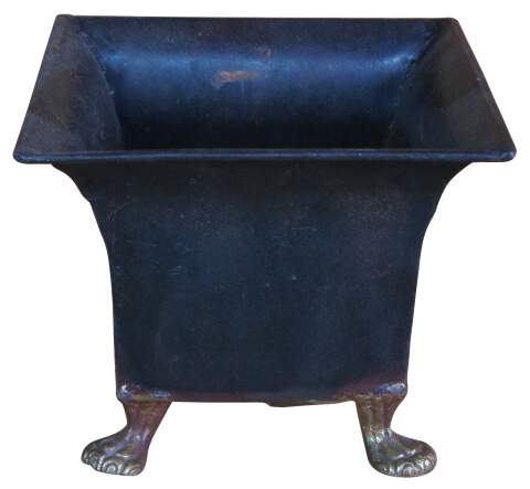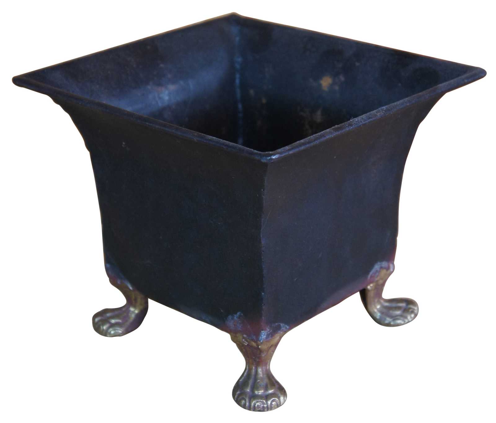French Empire style metal toleware cachepot, circa first half 20th century. Rectangular form with flare mouth and brass claw feet.