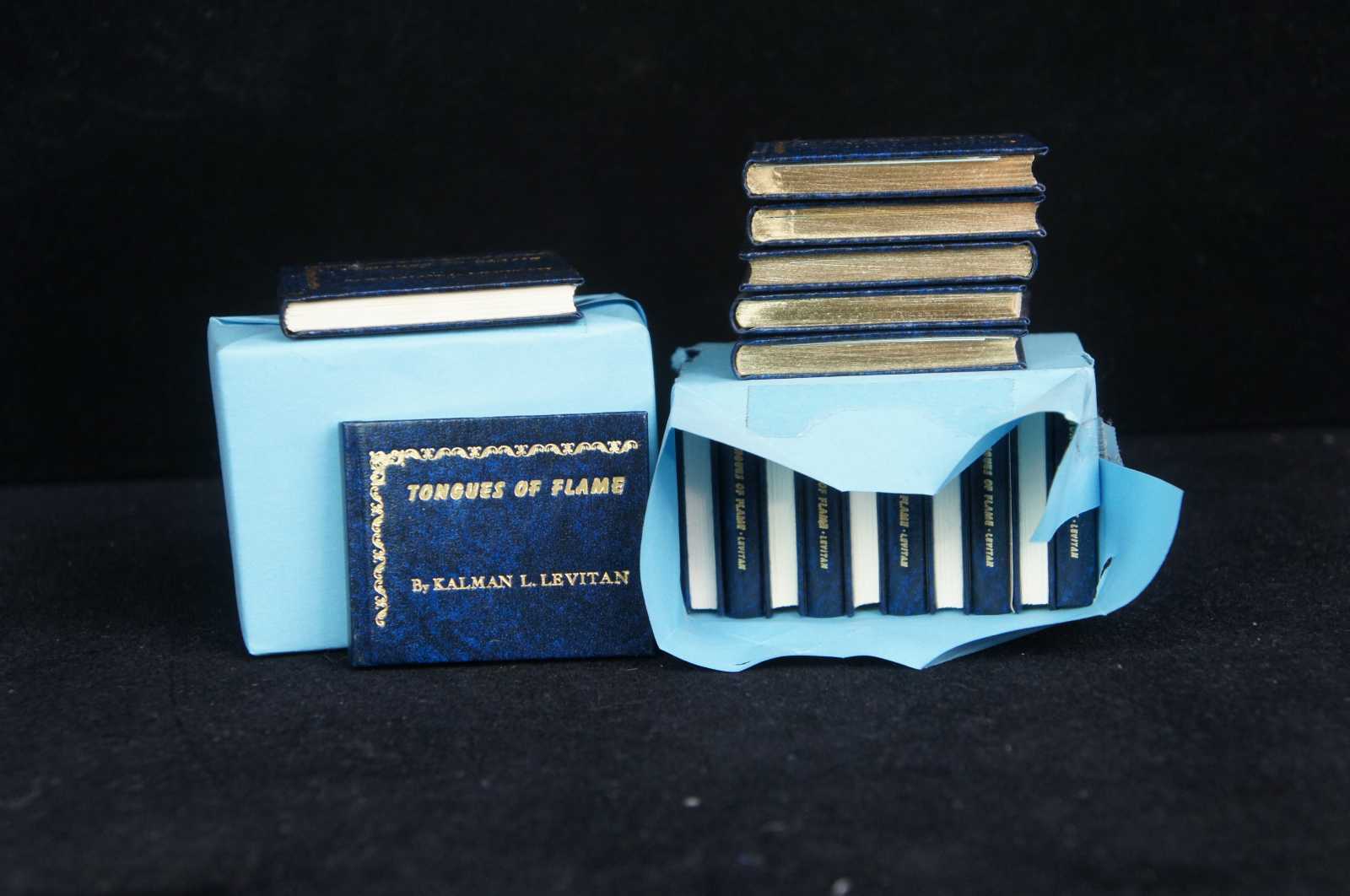 lot of tiny books: 10 postage stamp, 9 'people of the little book', 5 gilded 'tongues of flame' 22 regular 'tongues of flame', MBS award, 1995 Levitan collection, 'in search of miniature books'