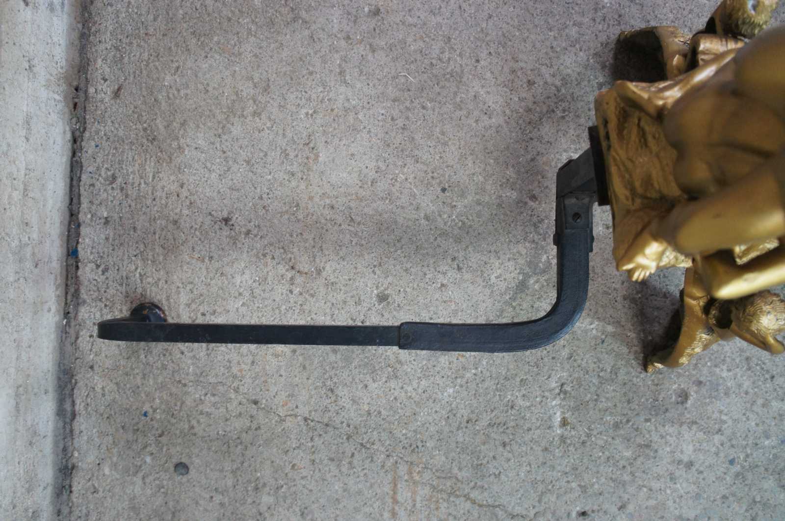 An elegant and rare set of figural Renaissance Revival andirons, chestnuts or firedogs. A depiction of Giambologna's Abduction of a Sabine Woman. Made from Bronze and finished in Gold. Features 3 outstretched figures above an ornate base of caryatids and cherubs centered by a lion crest. Log holder is made from iron.