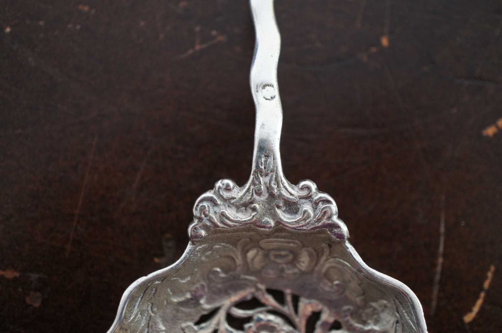 Antique Danish ornate repousse high relief sterling silver berry or caddy spoon, topped with a crown and the image of the Virgin Mary holding the baby Jesus, enthroned as the Queen of Heaven. Below her is a bow with the name Drenthe (a province in the Netherlands). The pierced bowl features scrolled leaves and flowers around a figure fishing. Monogrammed F. 43.