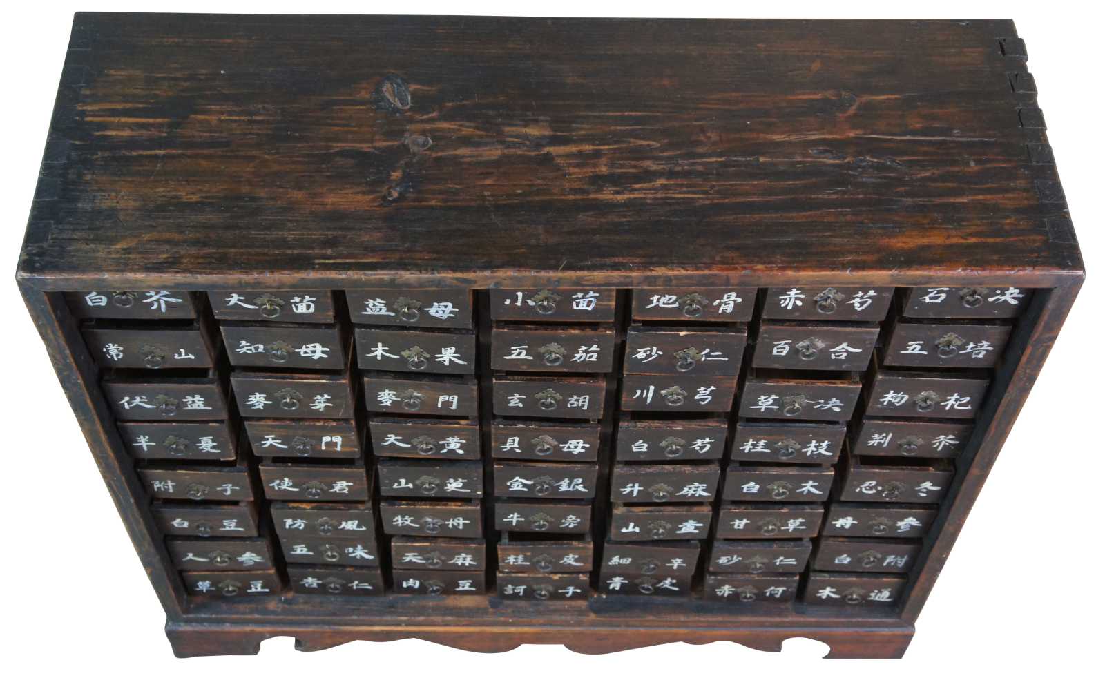 A rare early 19th century Chinese medical or apothecary chest. Made of dense Chinese hardwood with dovetailed and serpentine accents featuring 56 calligraphy drawers with dividers and brass hardware.