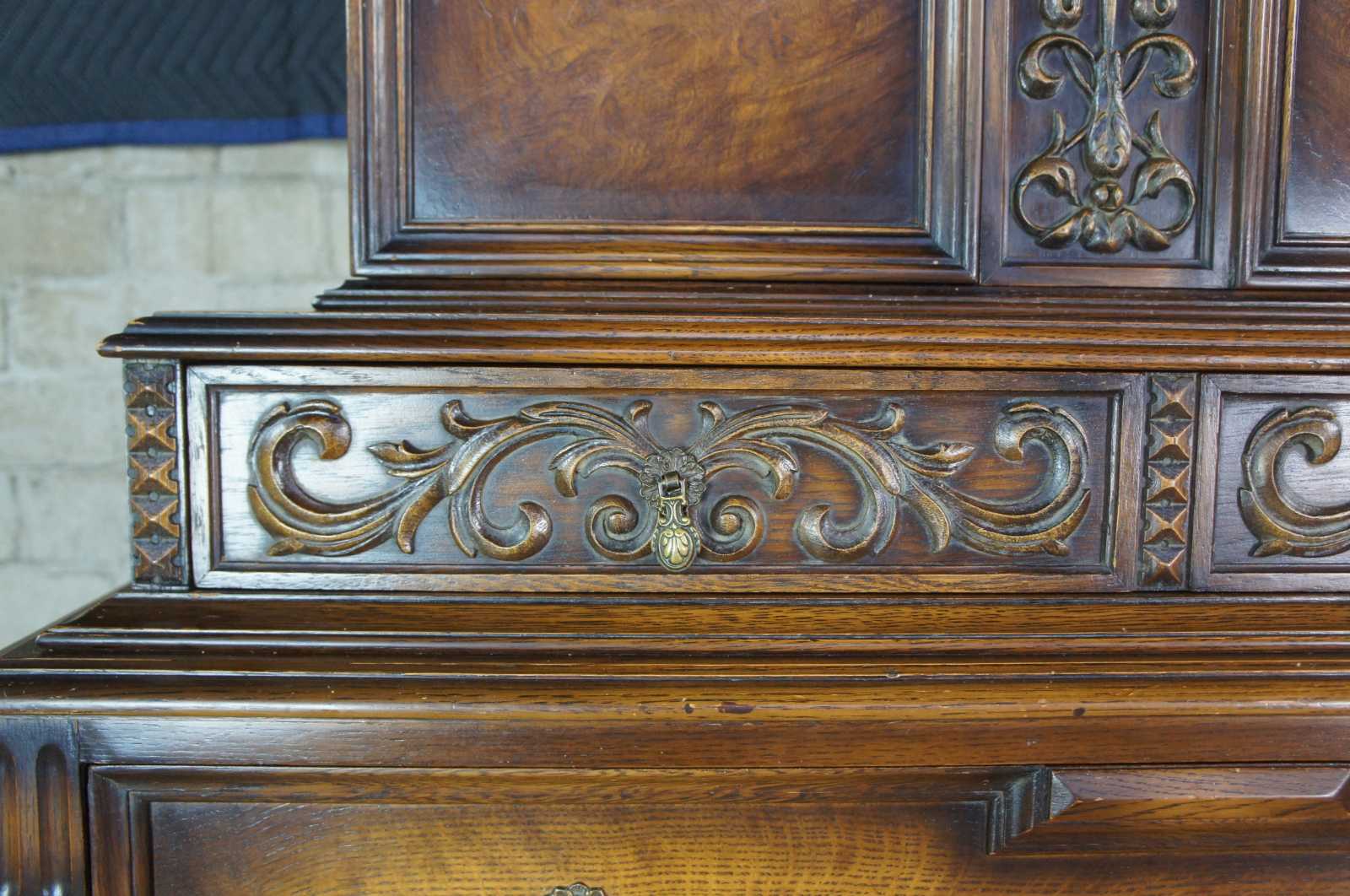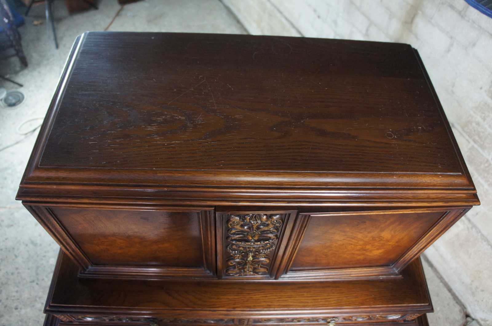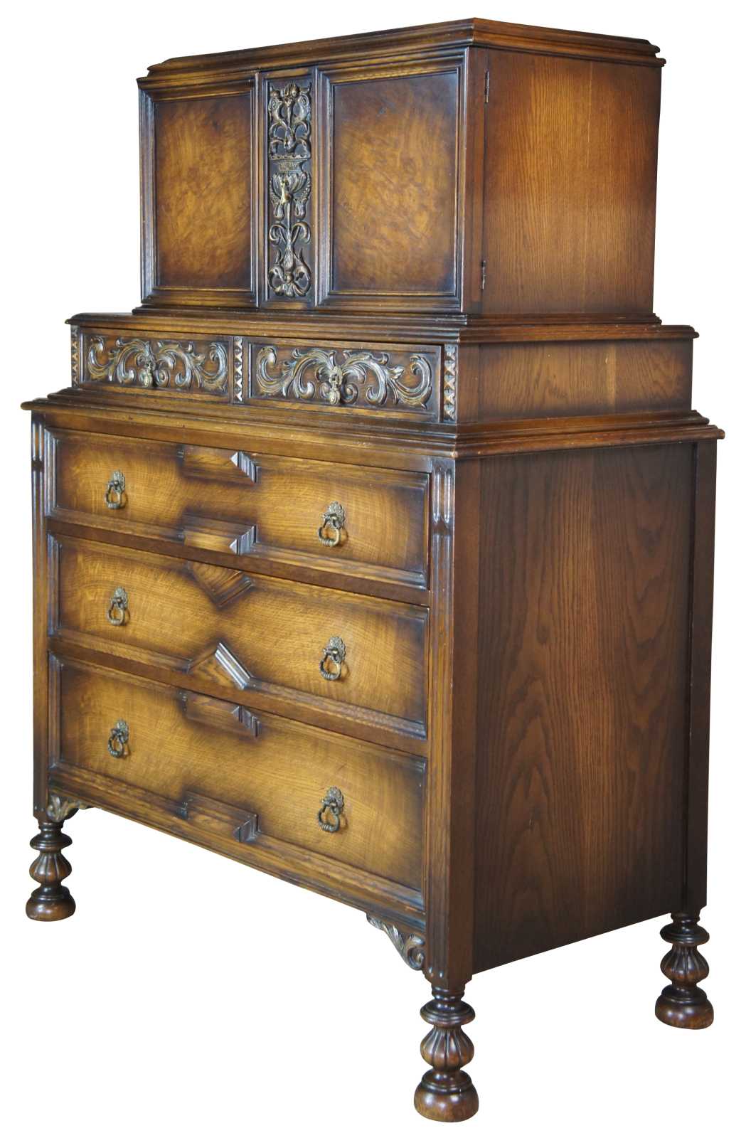 American Furniture Company Gothic or Spanish Renaissance Revival tallboy dresser, Circa 1930s. Operating out of Batesville Indiana since 1899, they worked closely and collaborated in part with Romweber. Specializing in high grade bedroom suites & furniture. Made from American Oak with low relief floral carvings and brutalist shaped lower drawers. Reminiscent of a chifferobe with upper cabinet topper. The cabinet is supported by turned bun feet.