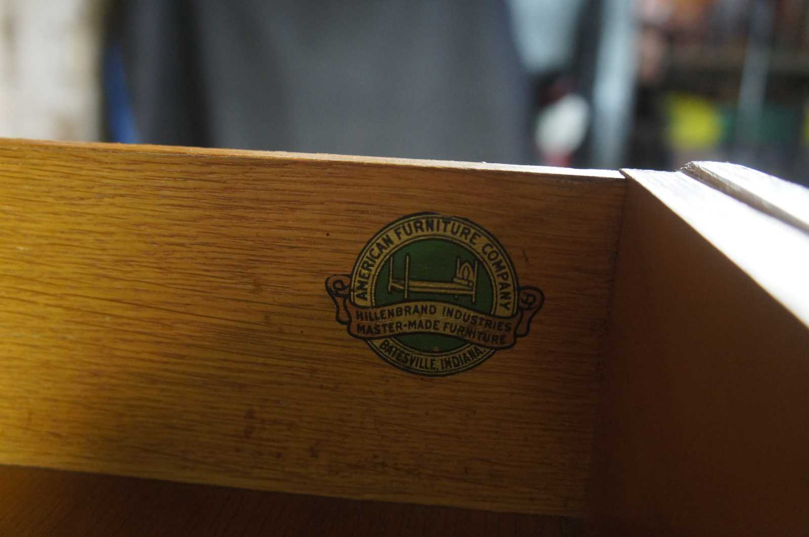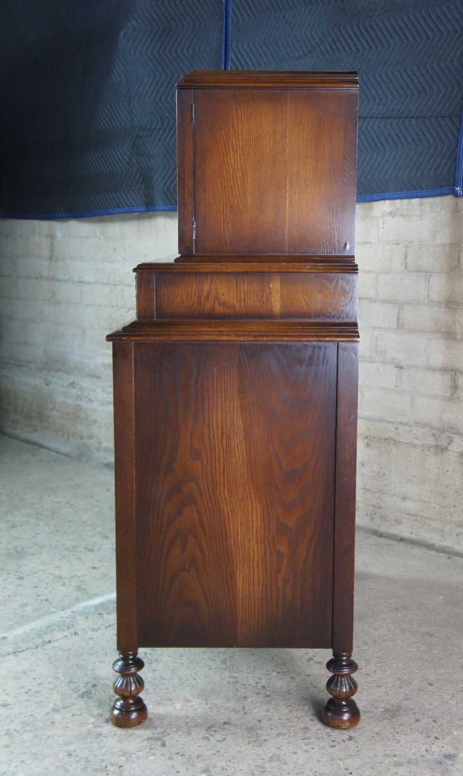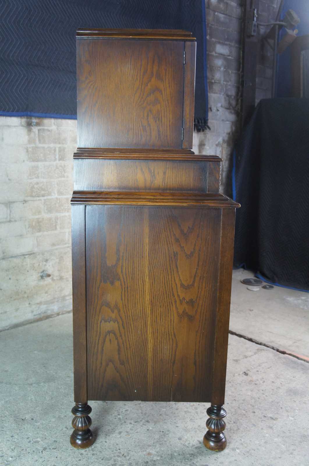 American Furniture Company Gothic or Spanish Renaissance Revival tallboy dresser, Circa 1930s. Operating out of Batesville Indiana since 1899, they worked closely and collaborated in part with Romweber. Specializing in high grade bedroom suites & furniture. Made from American Oak with low relief floral carvings and brutalist shaped lower drawers. Reminiscent of a chifferobe with upper cabinet topper. The cabinet is supported by turned bun feet.
