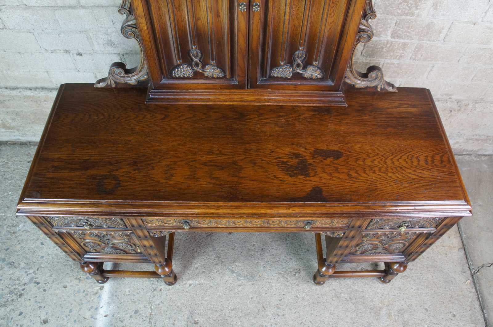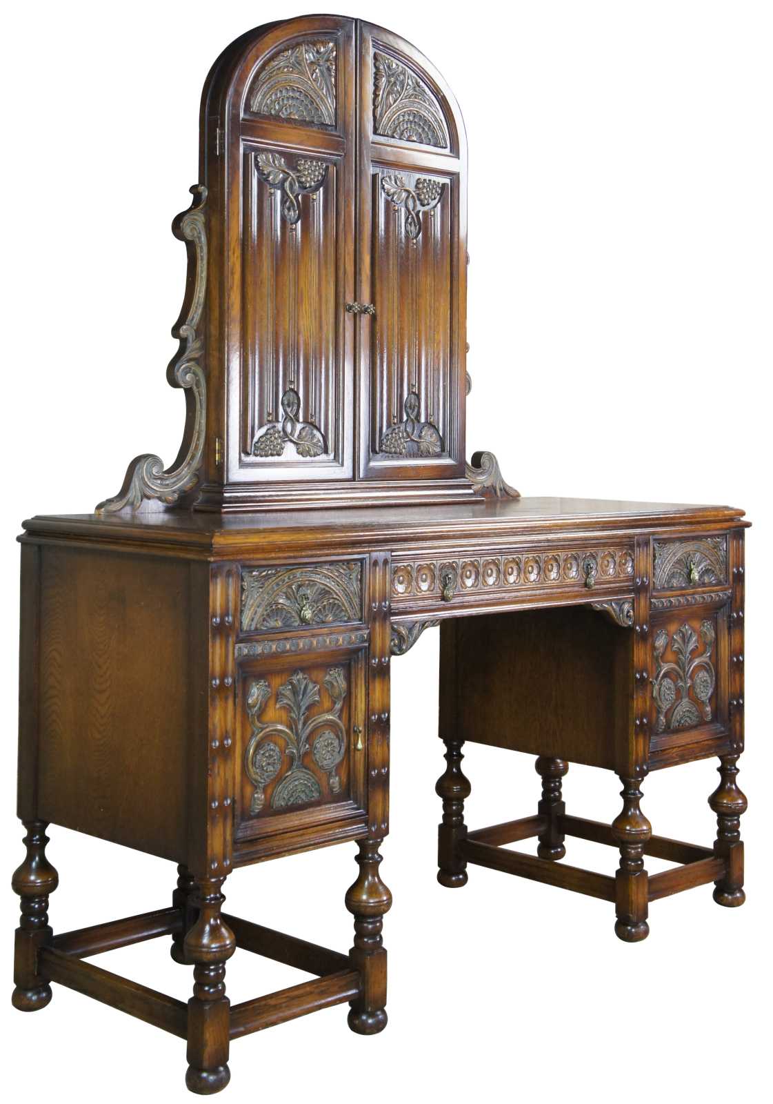 American Furniture Company Gothic or Spanish Renaissance Revival vanity desk and mirror. Operating out of Batesville Indiana since 1899, they worked closely and collaborated in part with Romweber. Specializing in high grade bedroom suites & furniture. Made from American Oak with low relief floral carvings, an arched trifold mirror, twisted balusters posts, turned legs and bun feet. Includes three drawers over lower cabinets. Circa 1930s.