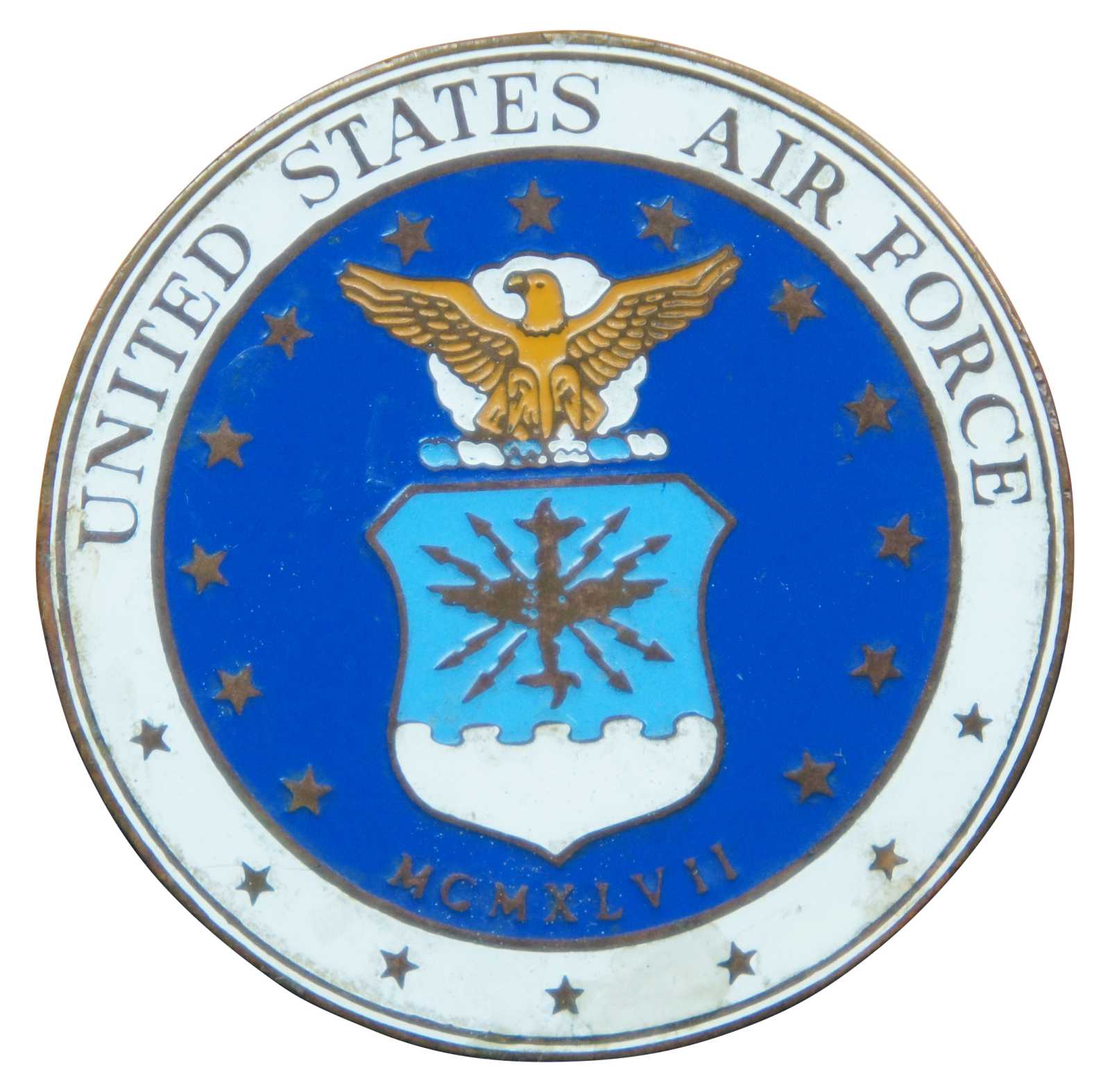 Mid century United States Air Force masterpiece medallion paperweight trinket. Made of brass featuring enameled top displaying the USAF logo of eagle and sheild. Circa 1947.