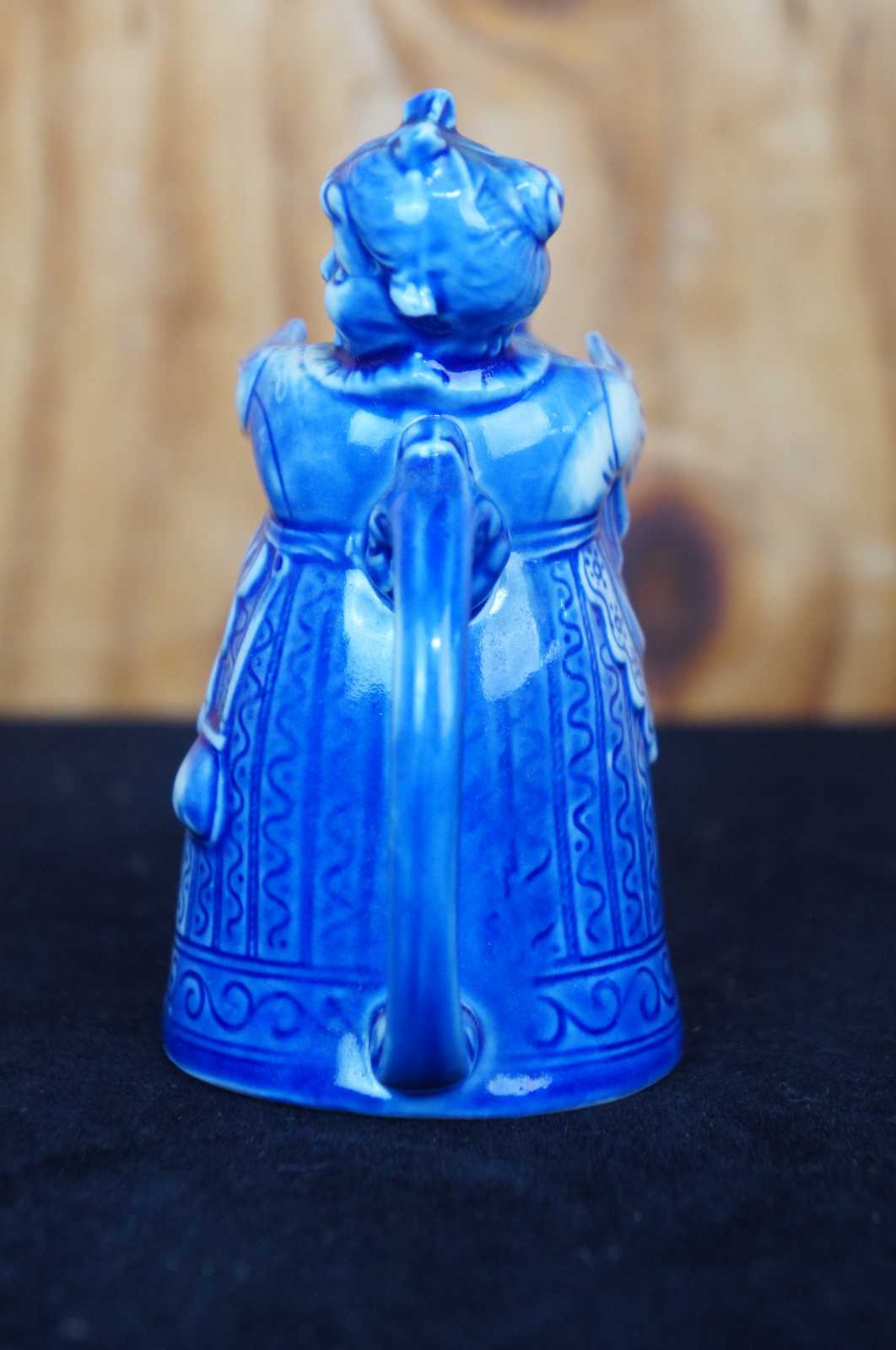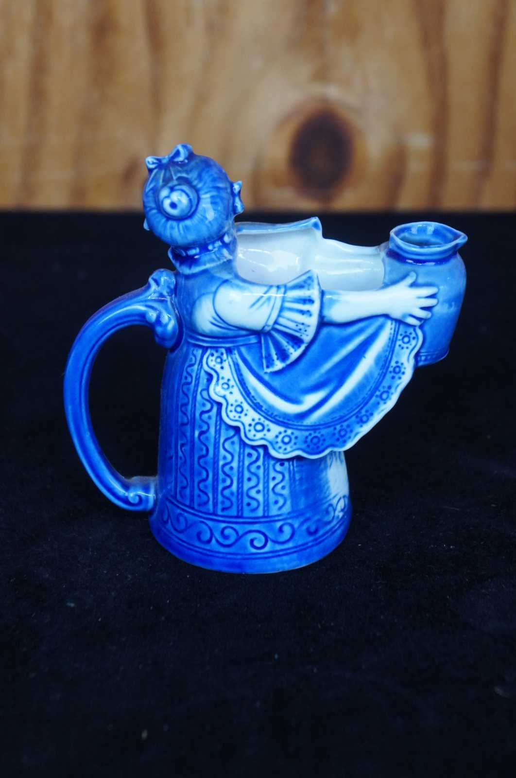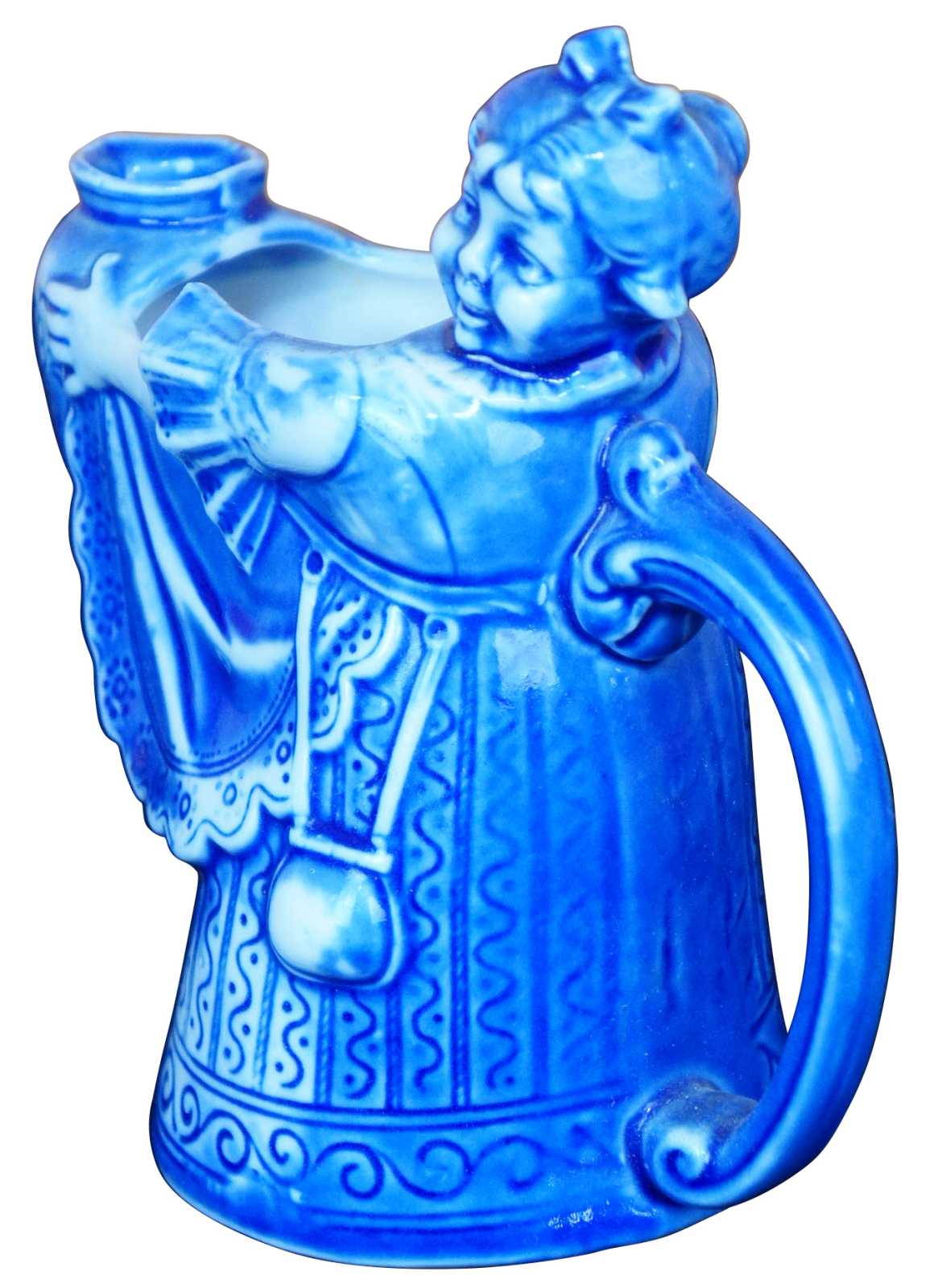 Vintage milk maiden pitcher in blue porcelain featuring a woman in a dress holding a jug.