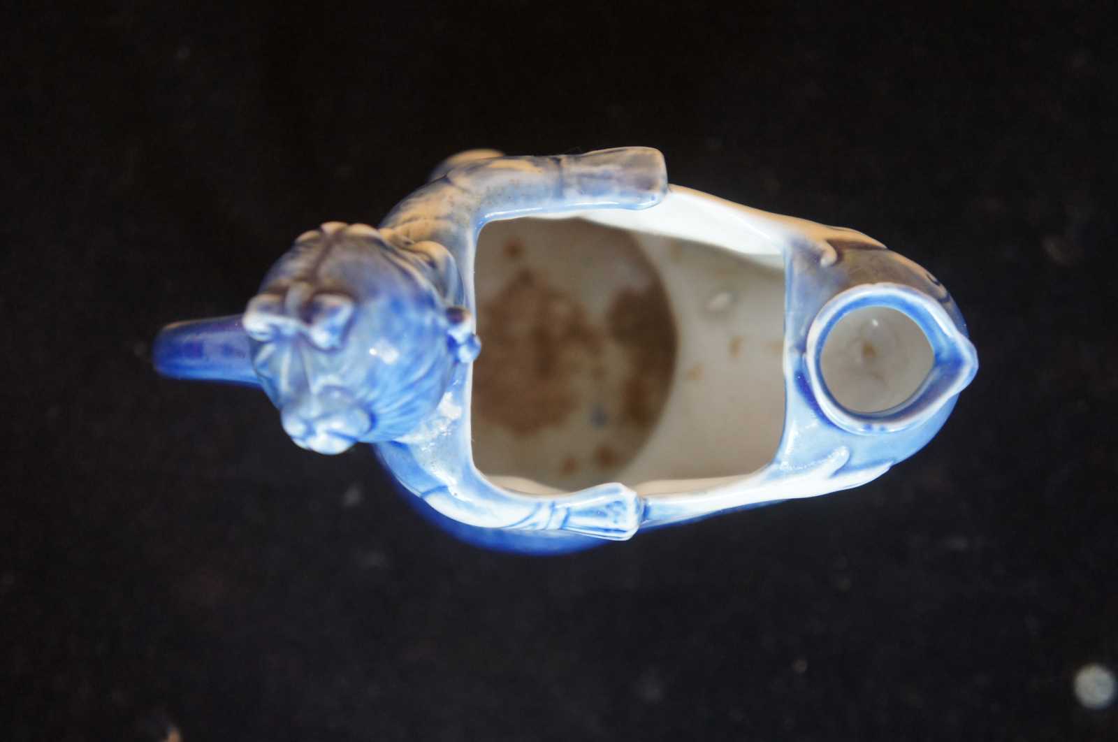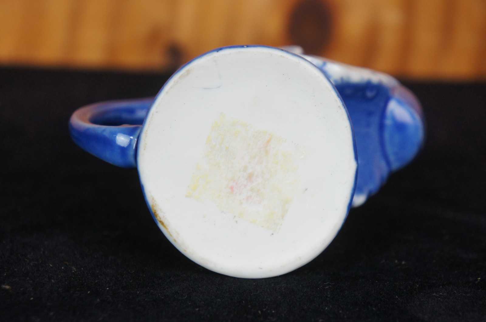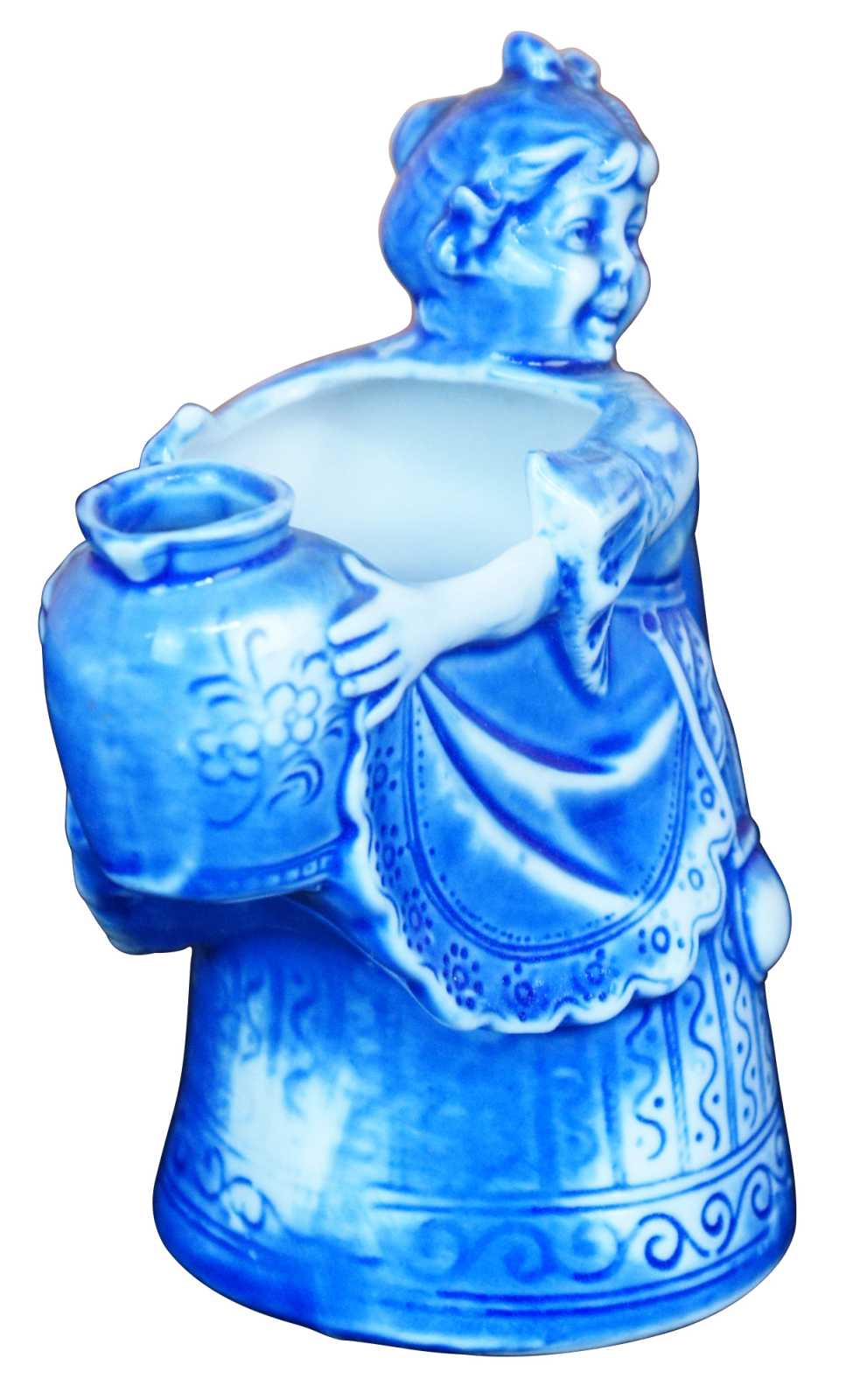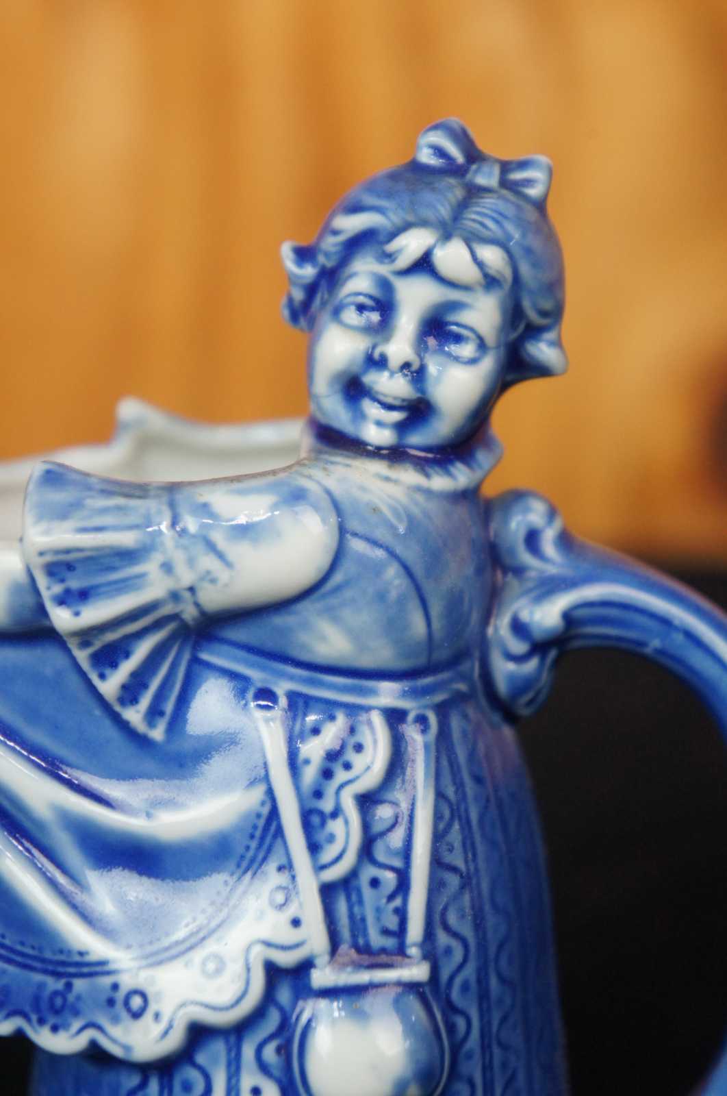 Vintage milk maiden pitcher in blue porcelain featuring a woman in a dress holding a jug.