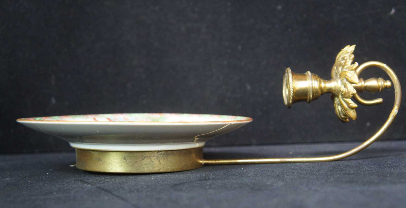 A lovely pair of brass wall hanging candle sconces with hand hand painted famille rose medallion salad plates. features flowers and geisha scenes. Each sconce holds one candle and has a floral drip pan.