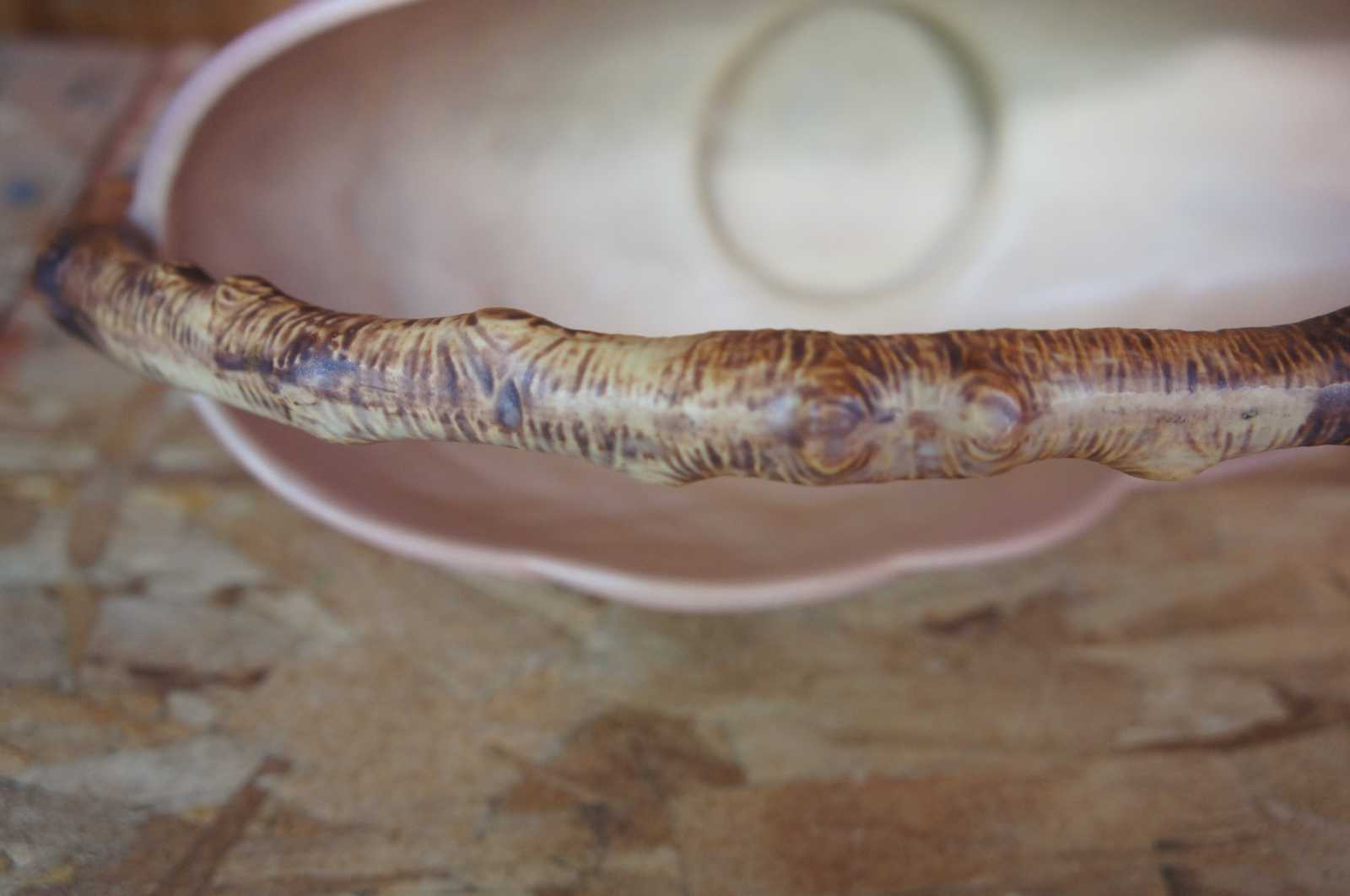 Vintage Roseville USA pottery scalloped footed basket featuring pink apple blossom pattern with twig handle and floral motif. 310-10.