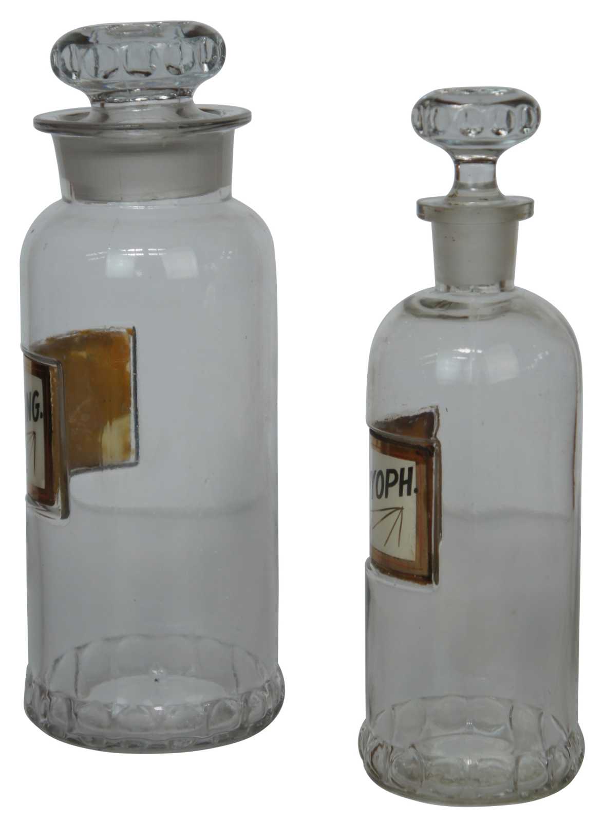 2 antique chemist bottle, marked March 1891. Features shaped base and matching topper. Each bares the orignal hand written label. Marked ""Syr. Stilling"" & ""OL Caryoph"" or Caryophyllene oxide