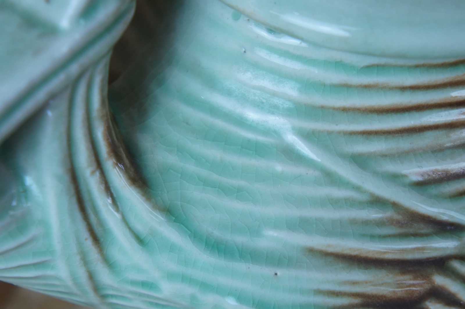 1940s McCoy Art Pottery Teapot, Cream and Sugar. Green with underlying tones of brown. Pinecone pattern.