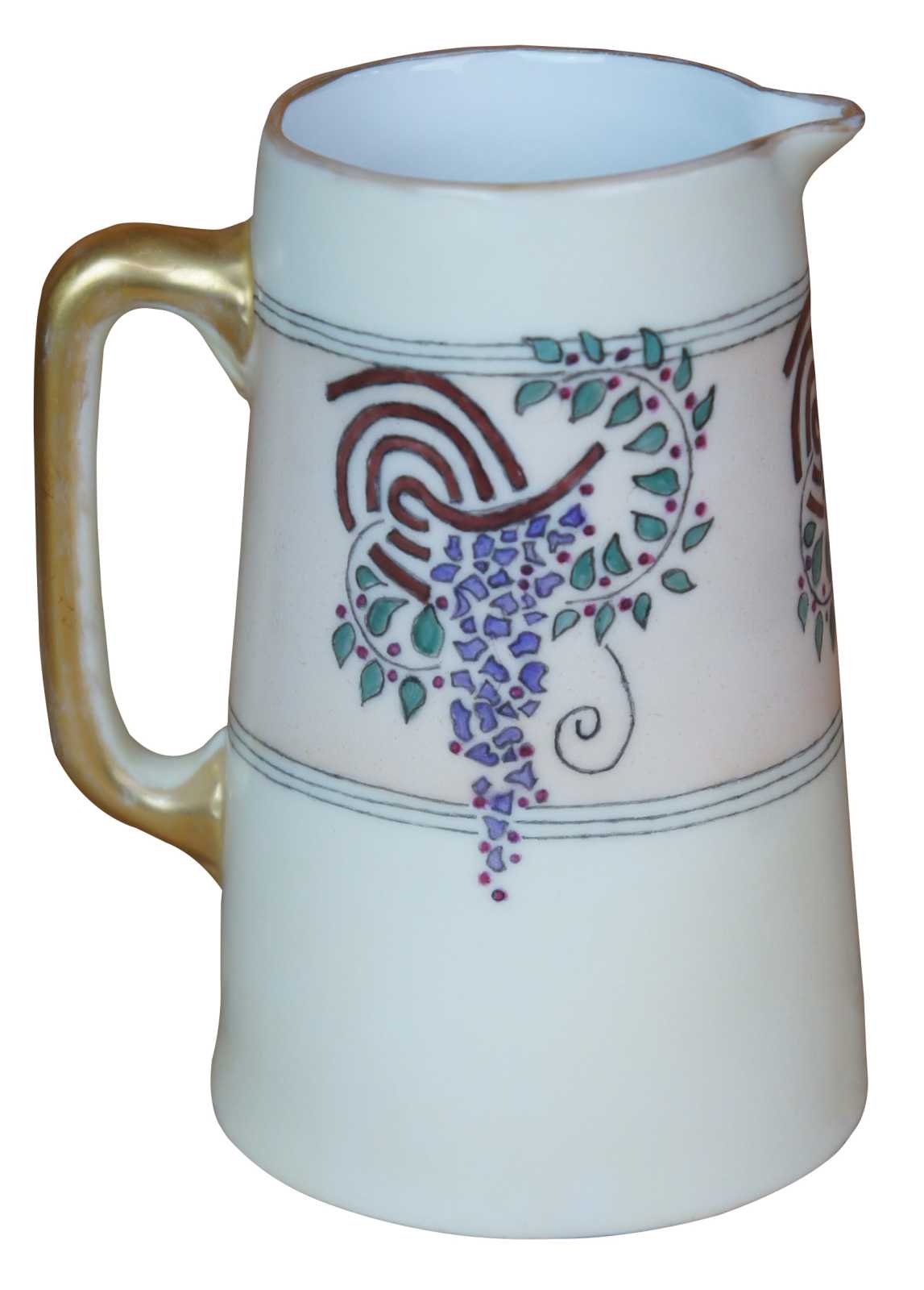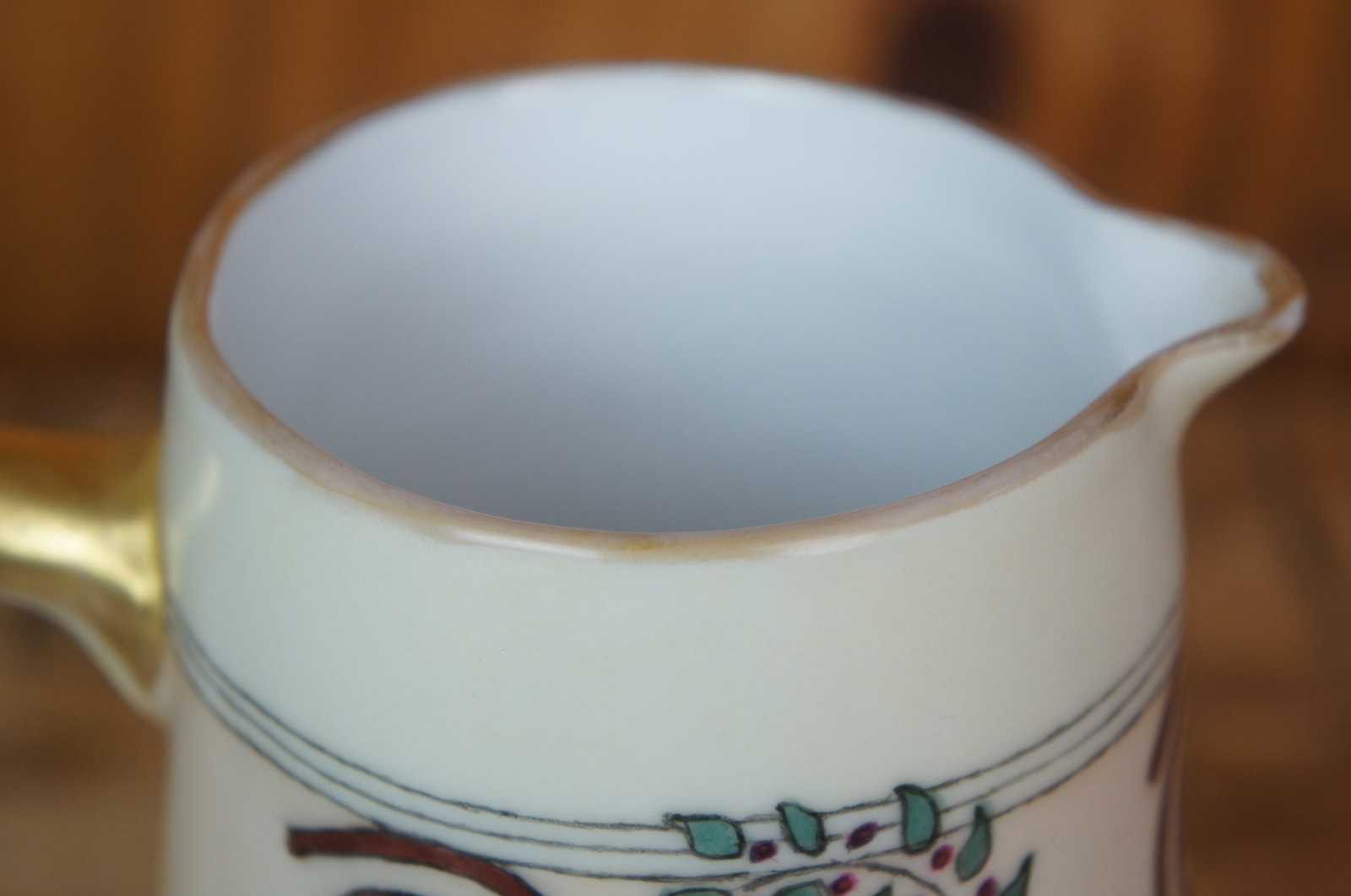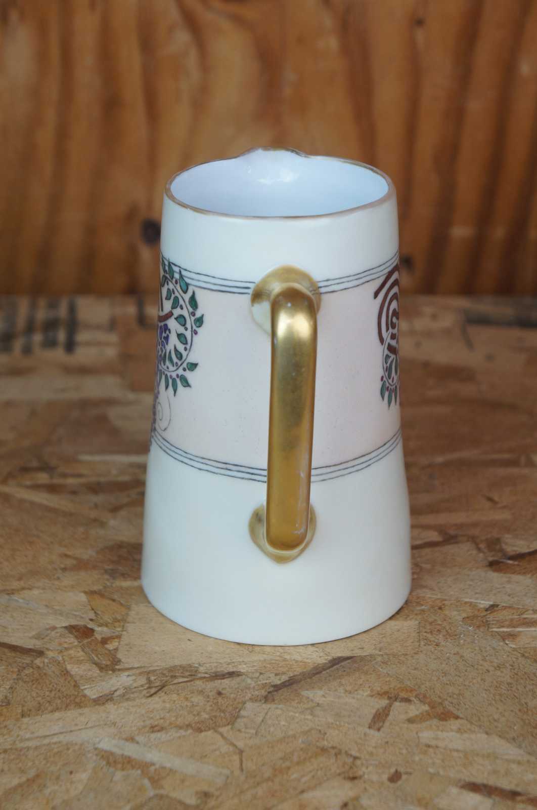 1939 B.H. Limoges Tankard Pitcher. Beautifully hand painted with a unique floral and grape pattern with gilding. Hand signed along base.