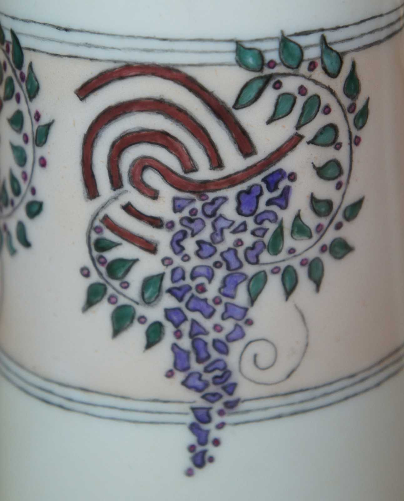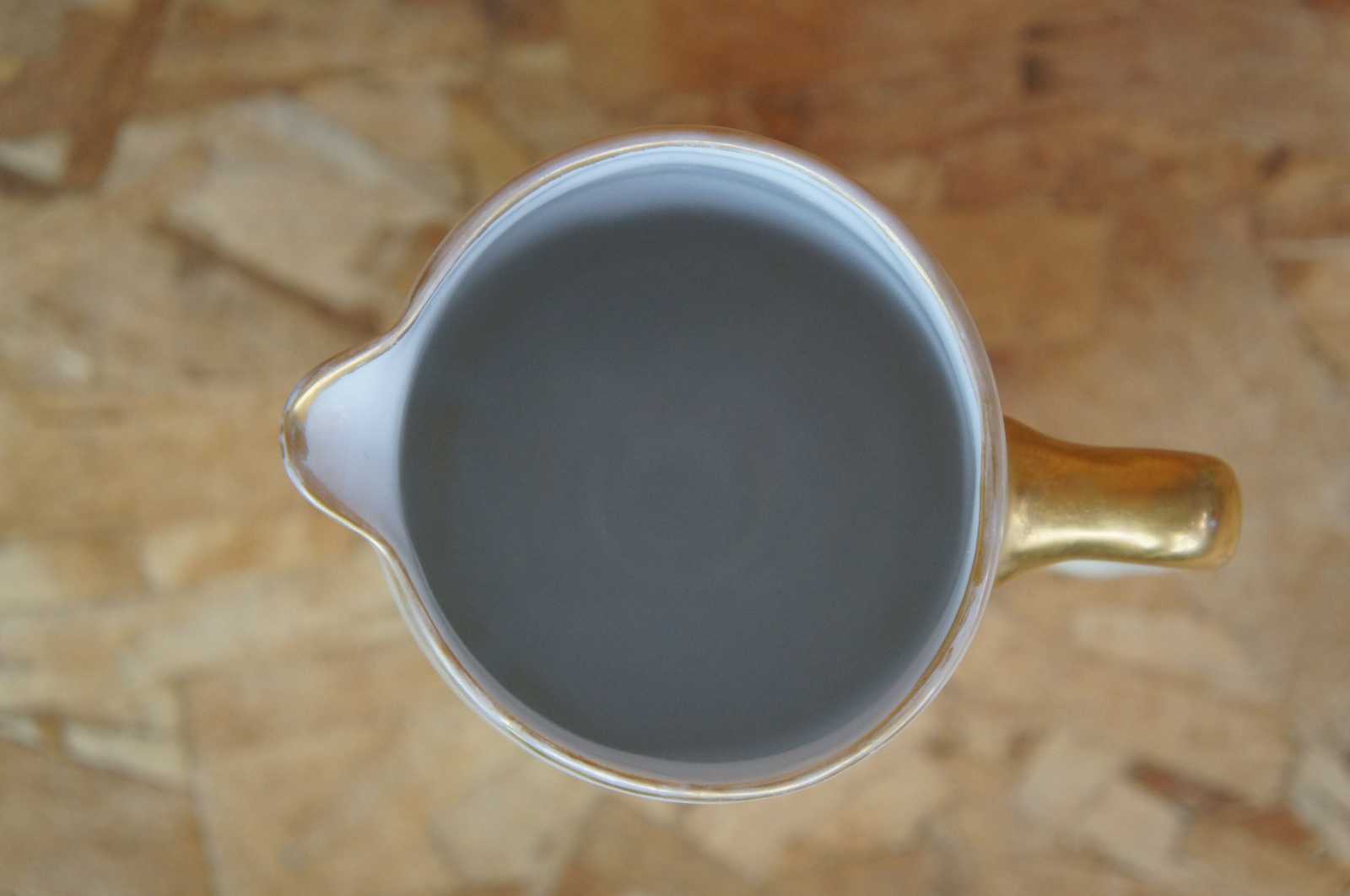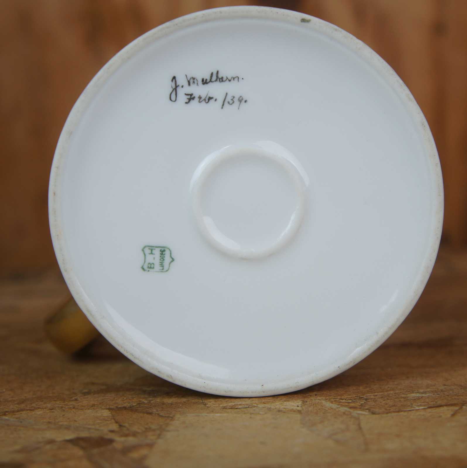 1939 B.H. Limoges Tankard Pitcher. Beautifully hand painted with a unique floral and grape pattern with gilding. Hand signed along base.