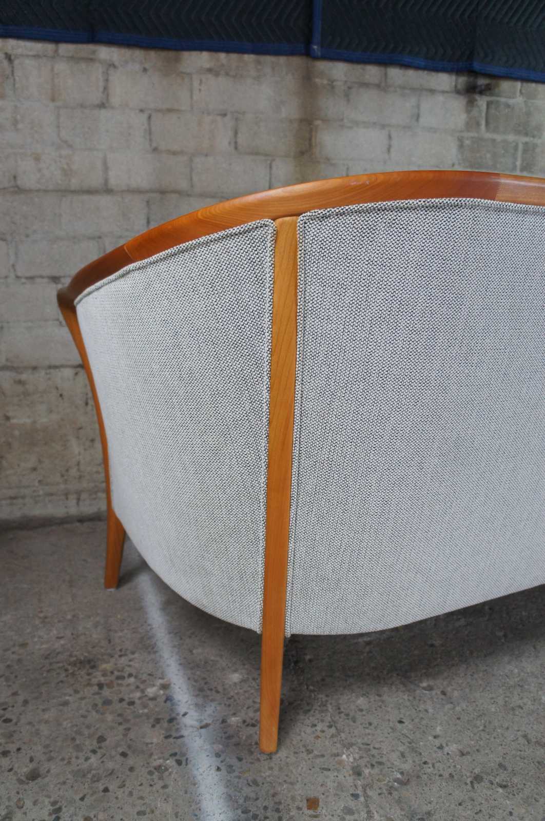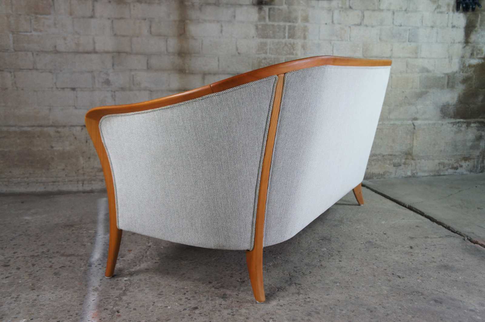 Mid Century Modern Skipper Mobler Furniture Co couch or Sofa. Made in Denmark featuring bentwood maple frame with rounded form a neutral upholstery.