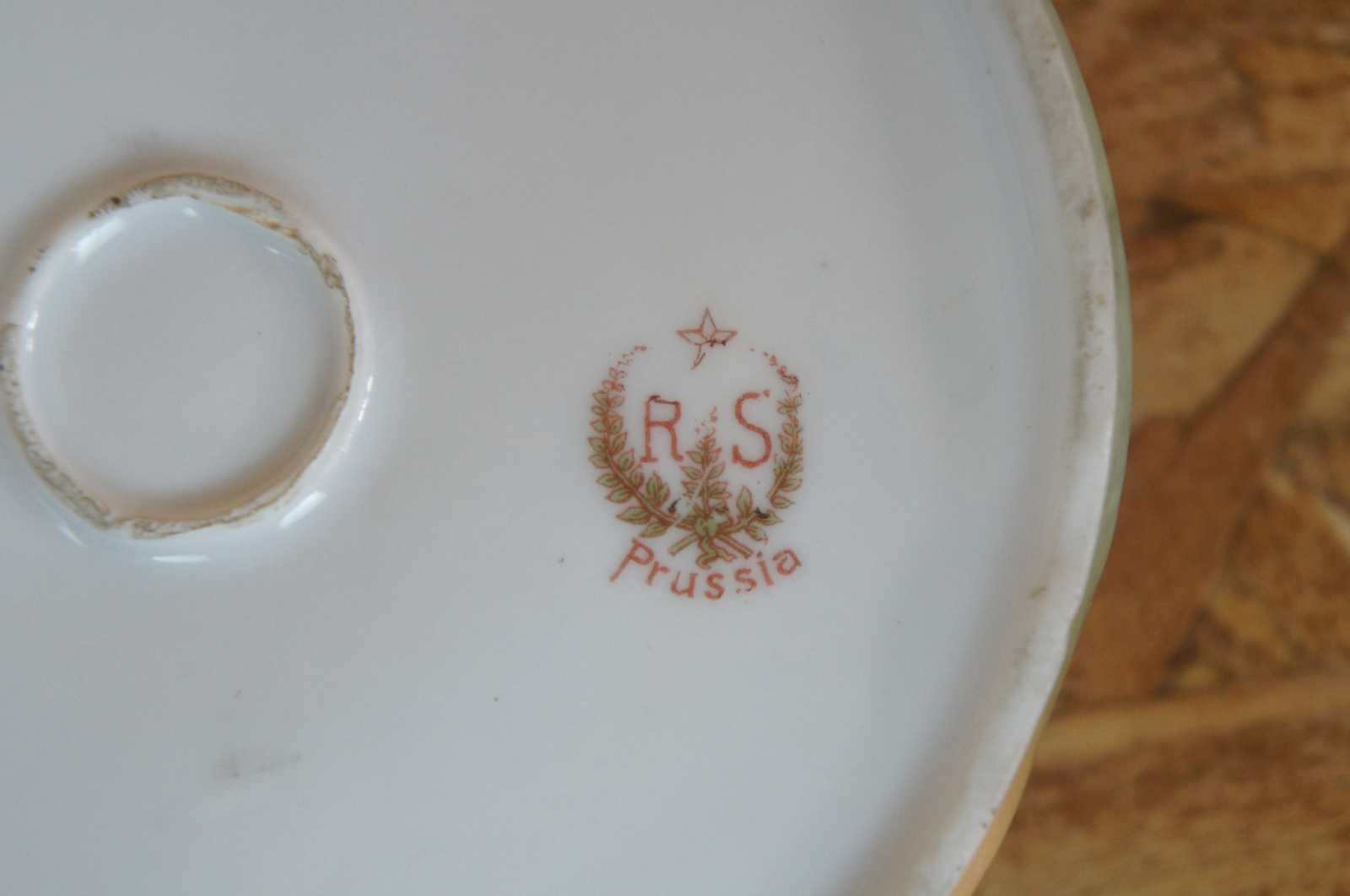 Antique hand painted scalloped porcelain floral RS Prussia hair reveiver jar or compote.