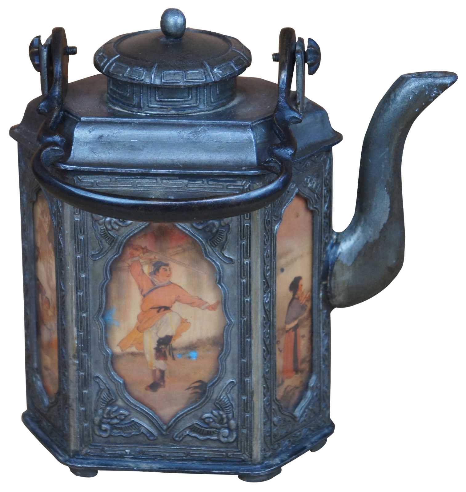 Antique Chinese Shantou pewter teapot or coffee kettle featuring hexagon form with footed base, lid, handle and reverse painted glass scene of geishas, warriors and a horse. Signed upper left on handle and stamped on base of teapot.