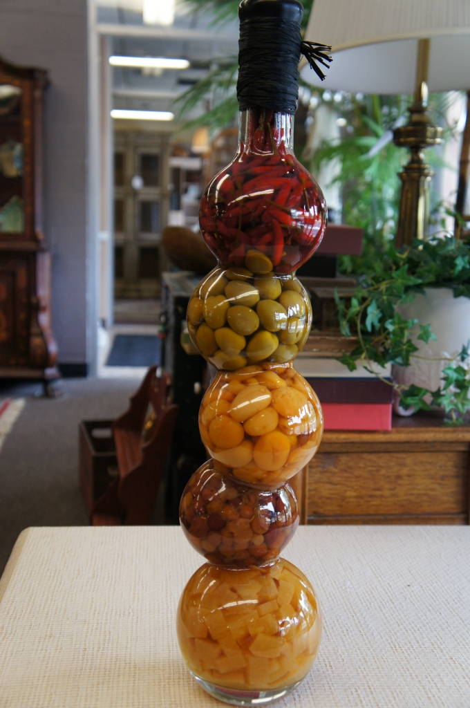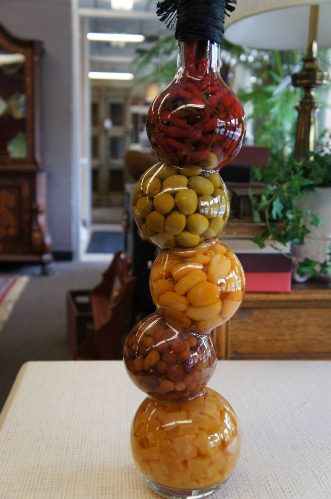 This is a great preserved fruit display jar. It has great scale and character, measuring approx. 2 feet tall! The fruit inside is preserved with oil or vinegar and it would add much color to any place you display it.