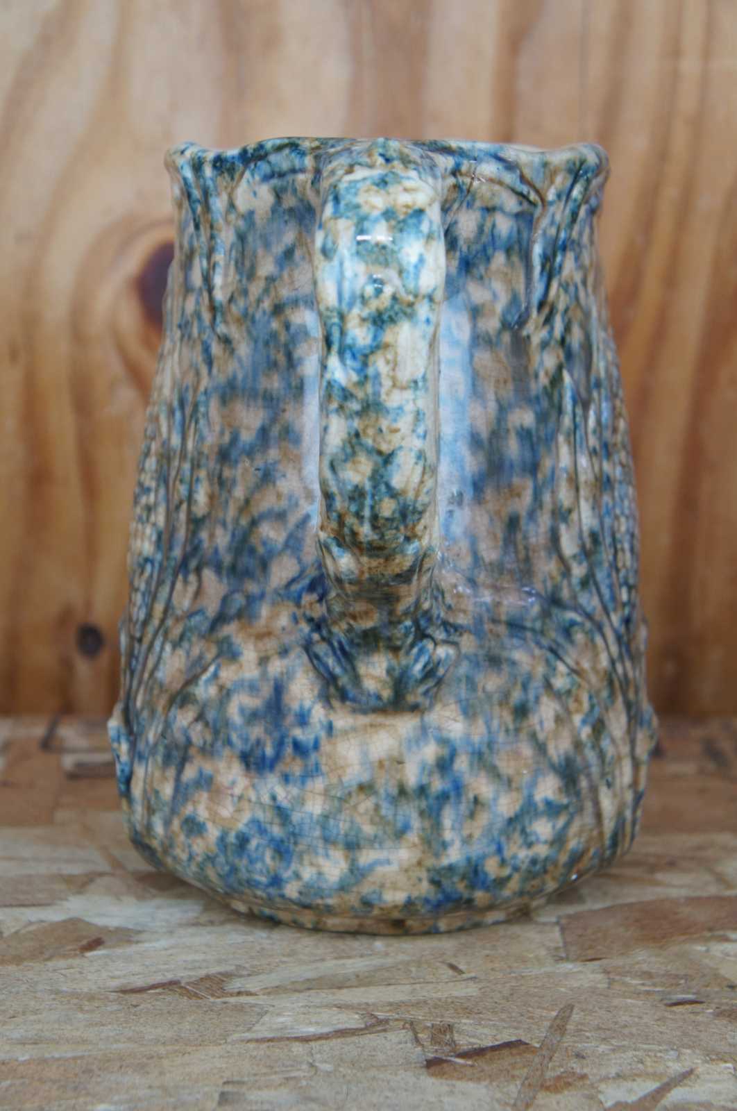 Roseville Cornelian blended majolica blue glaze pitcher with corn. Features an ear of corn design with cobalt blue / light blue / white mottled spoungeware / stoneware glaze with a hint of the factory gold gilt glaze. Circa 1900-1902. (Ref: Huxford, Second Series, pg. 39)