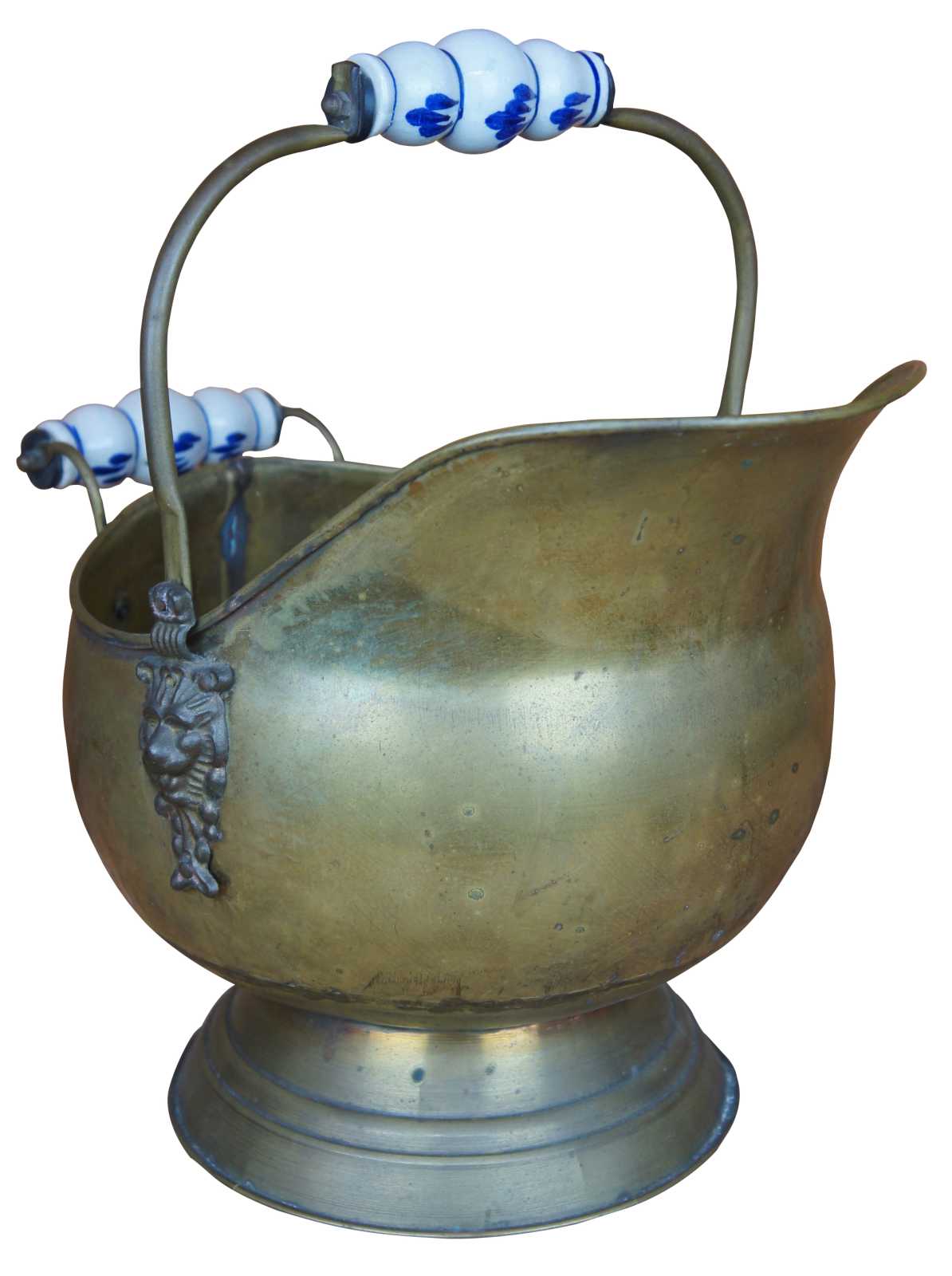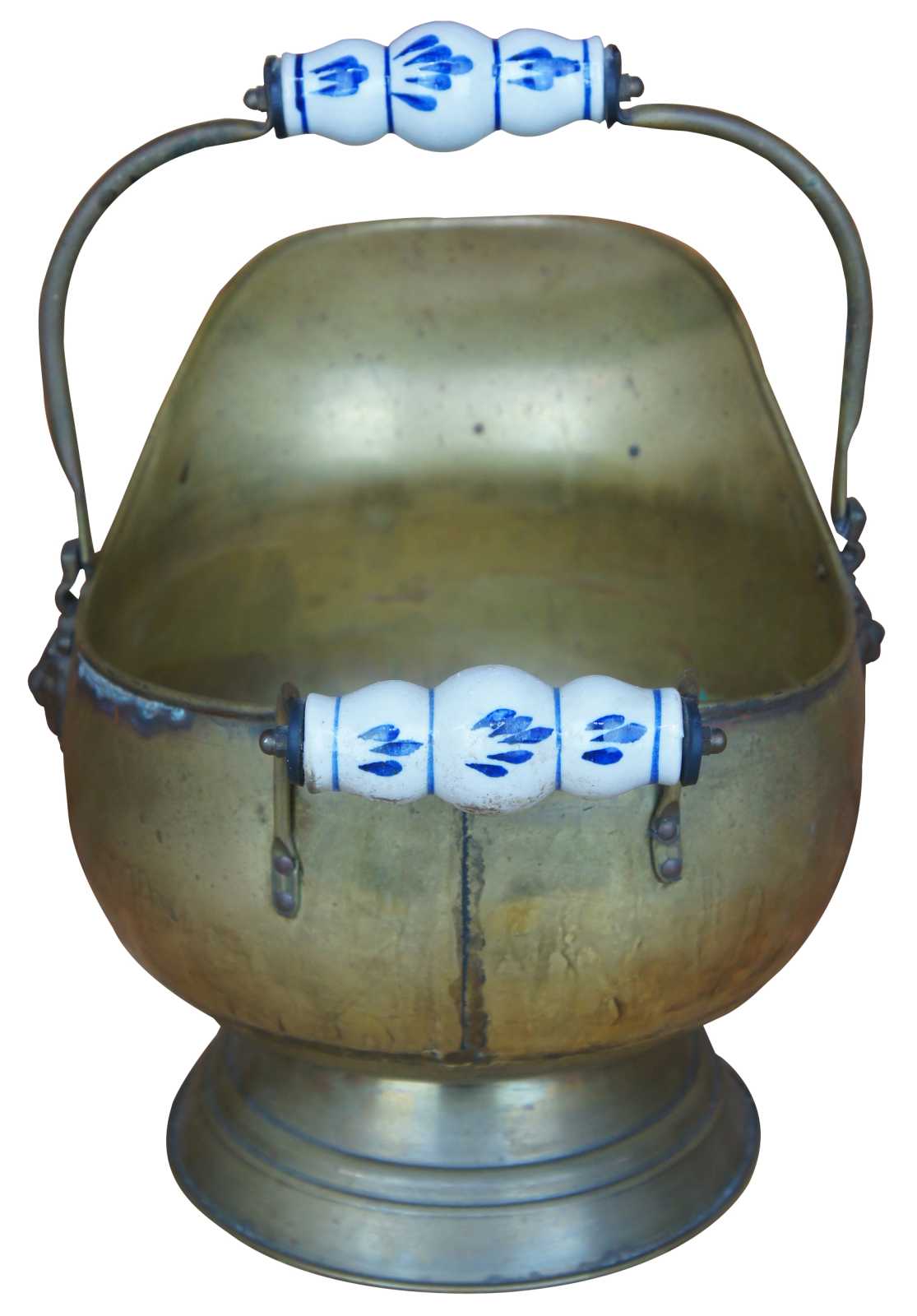 20th century brass scuttle bucket with porcelain handles and low relief lion head hinges.