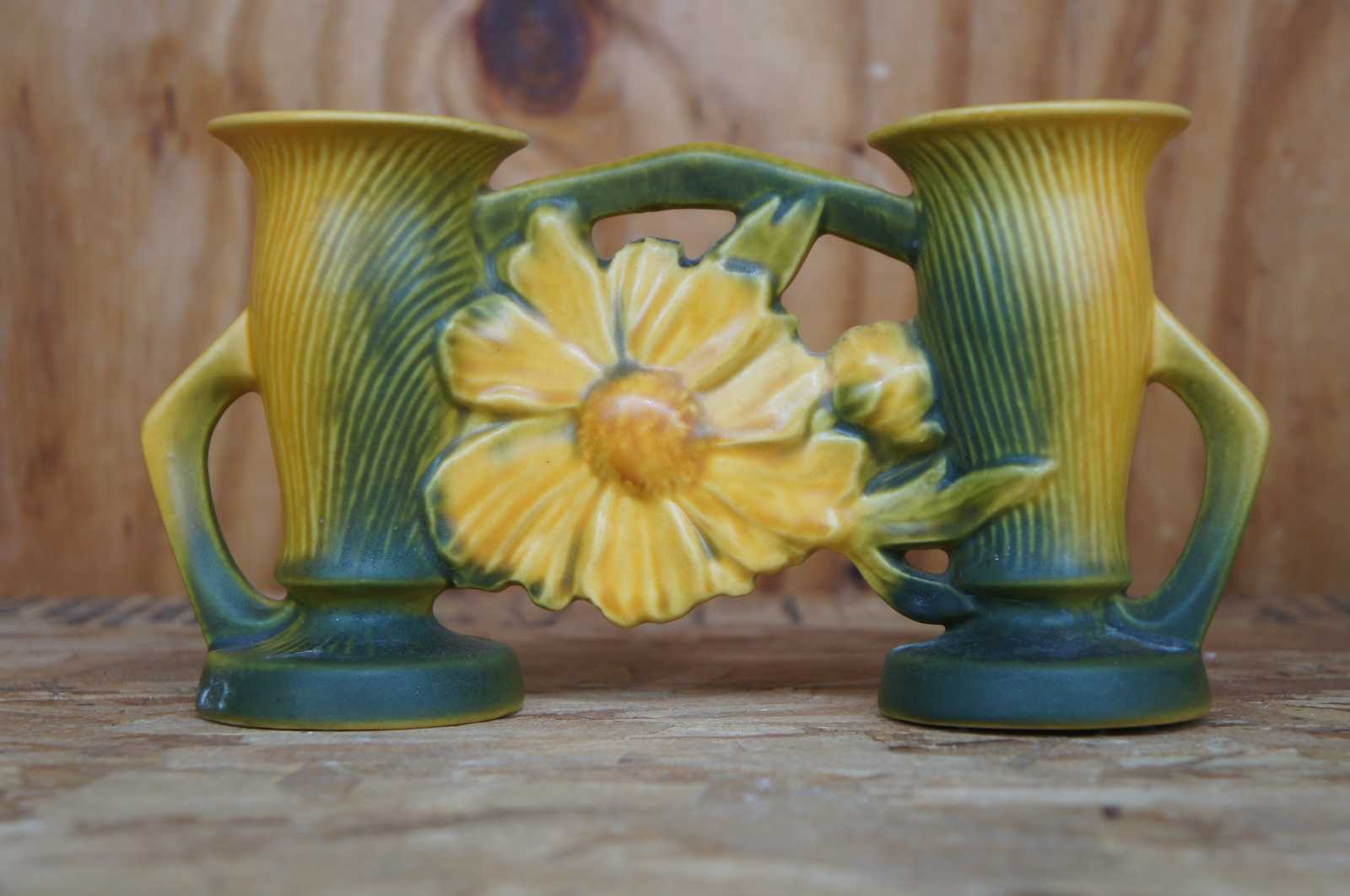 Antique 1942 Roseville pottery double peony bud vase featuring floral motif and art deco styling.
