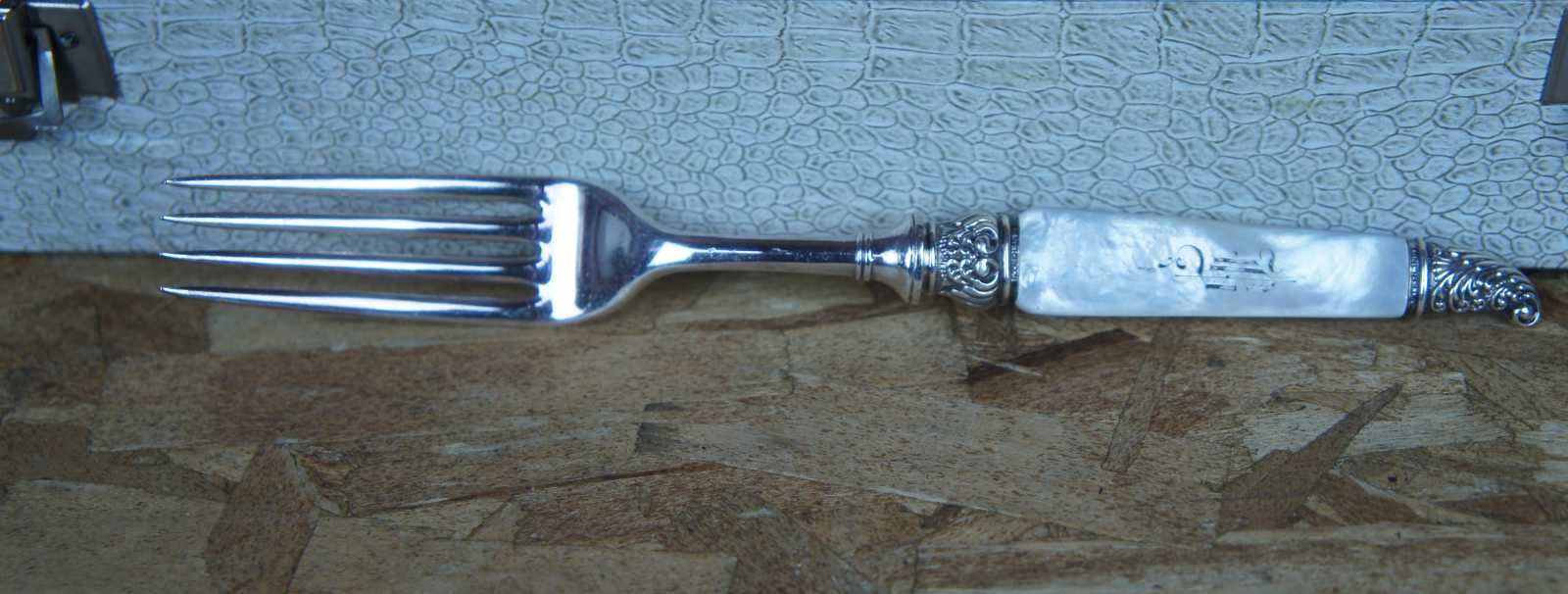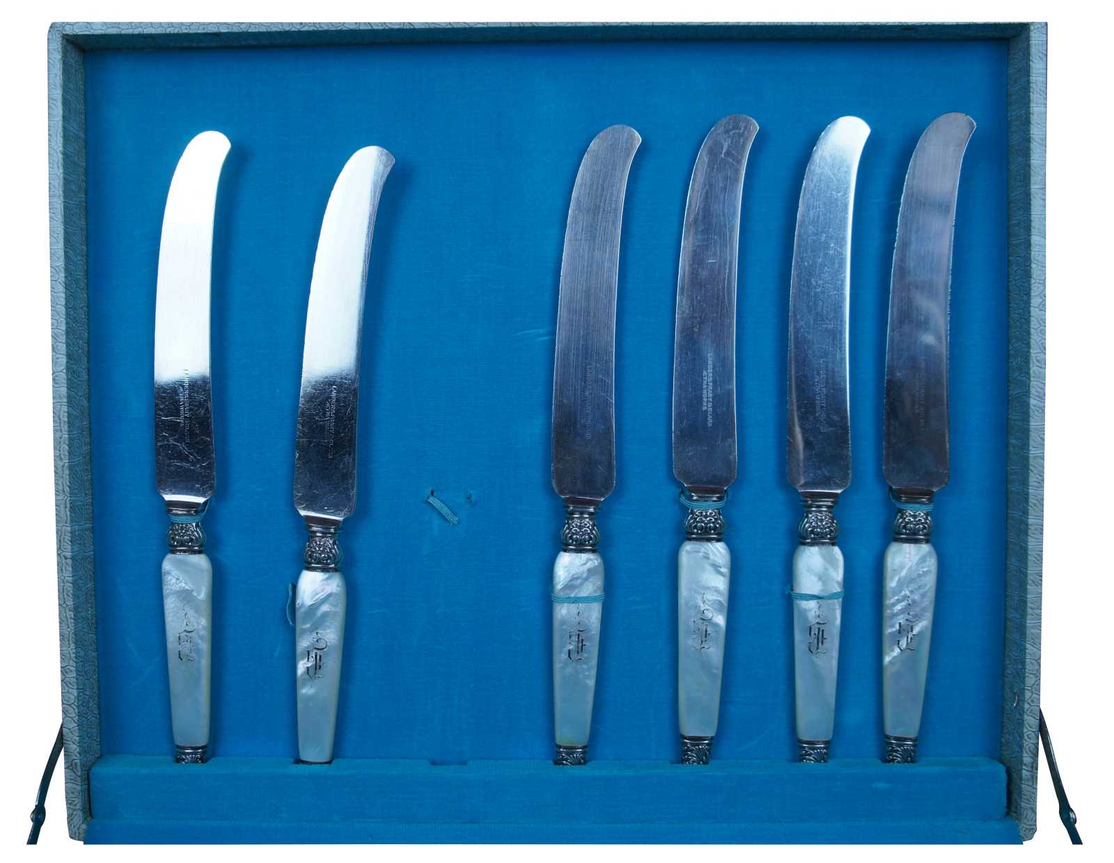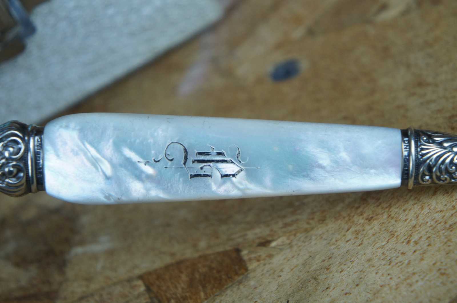 19 Antique Landers, Frary & Clark (LF&C) sterling silver 925 and mother of pearl (MOP) forks and knives featuring baroque styling. Case included.