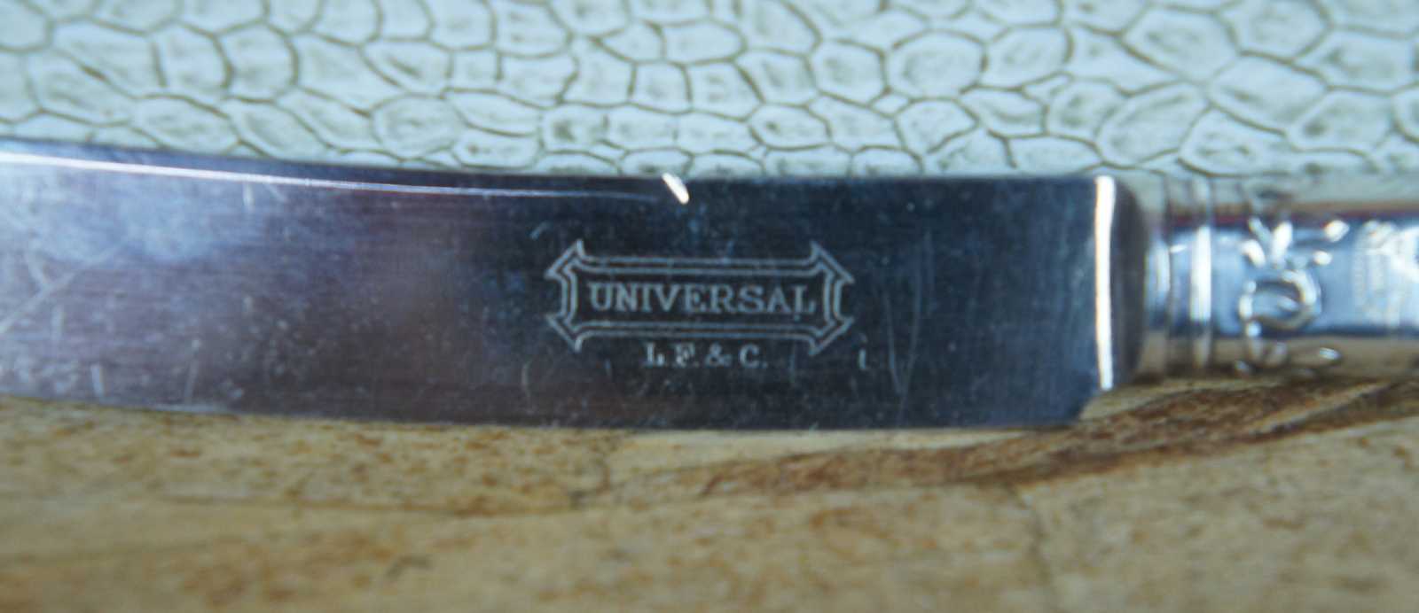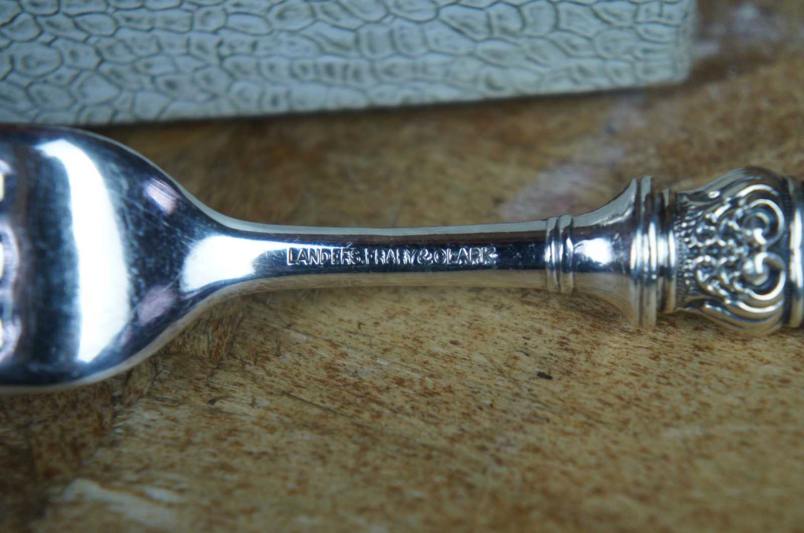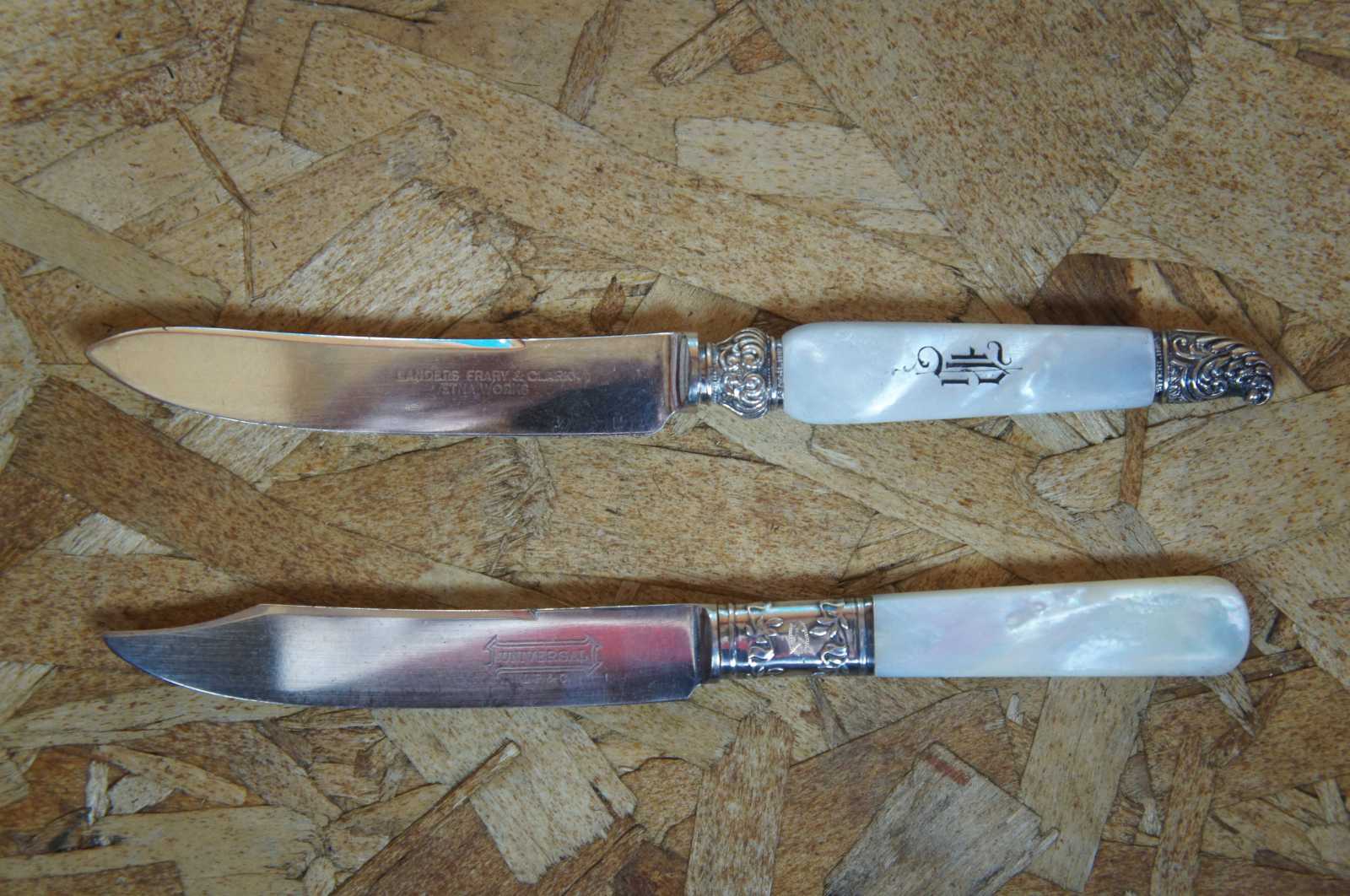 19 Antique Landers, Frary & Clark (LF&C) sterling silver 925 and mother of pearl (MOP) forks and knives featuring baroque styling. Case included.