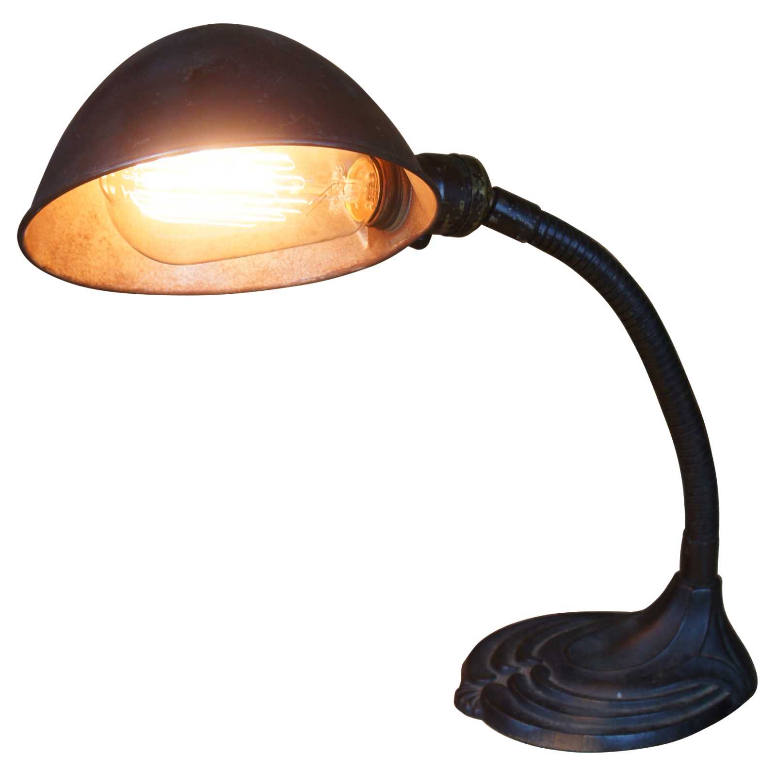 Antique Art Deco desk or table lamp featuring articulating gooseneck and iron base.