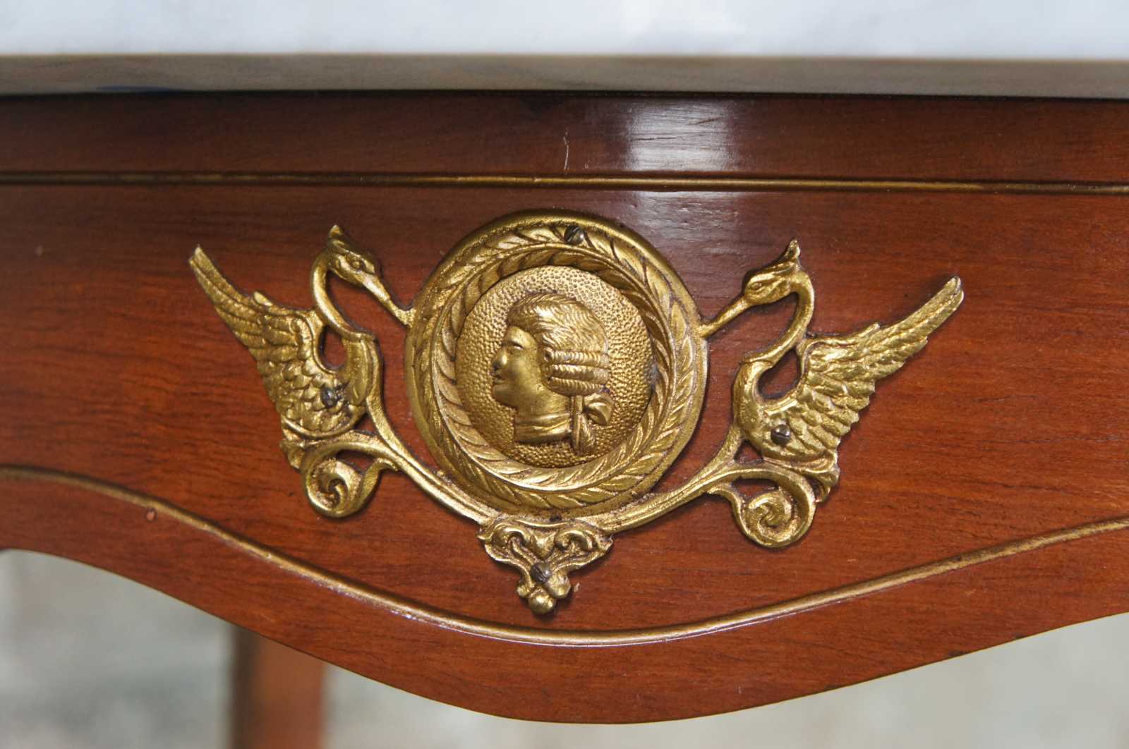 Two antique Italian Neoclassical Gueridon tables. Made of fruitwood with gold medallions that feature a bust of a mans head surrounded by a wreath flanked by swans / birds. Accanthus accents and feet caps adorn the serpentine legs. Original marble marked Wite Carrara 52, Made Italy.