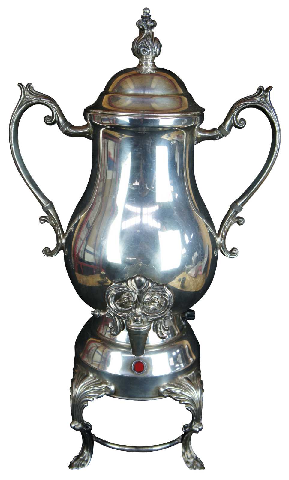 Vintage FB Rogers Silver co silver plated samovar or beverage warmer / heater / burner. Baroque styling with trophy shaped form featuring large scrolled handles and feet.