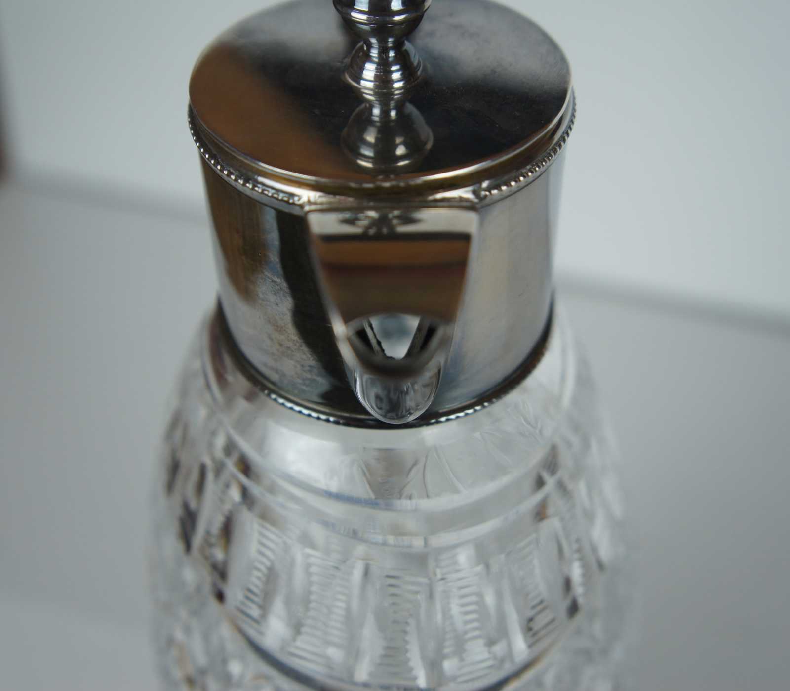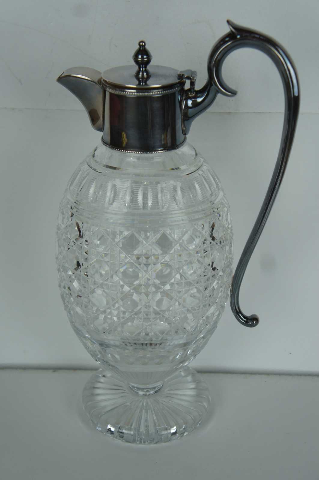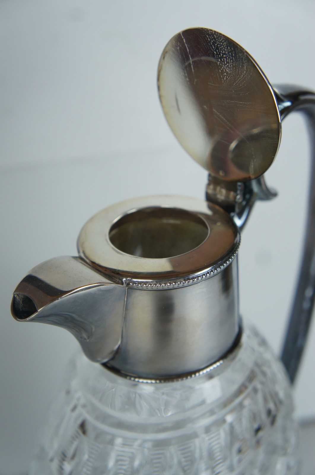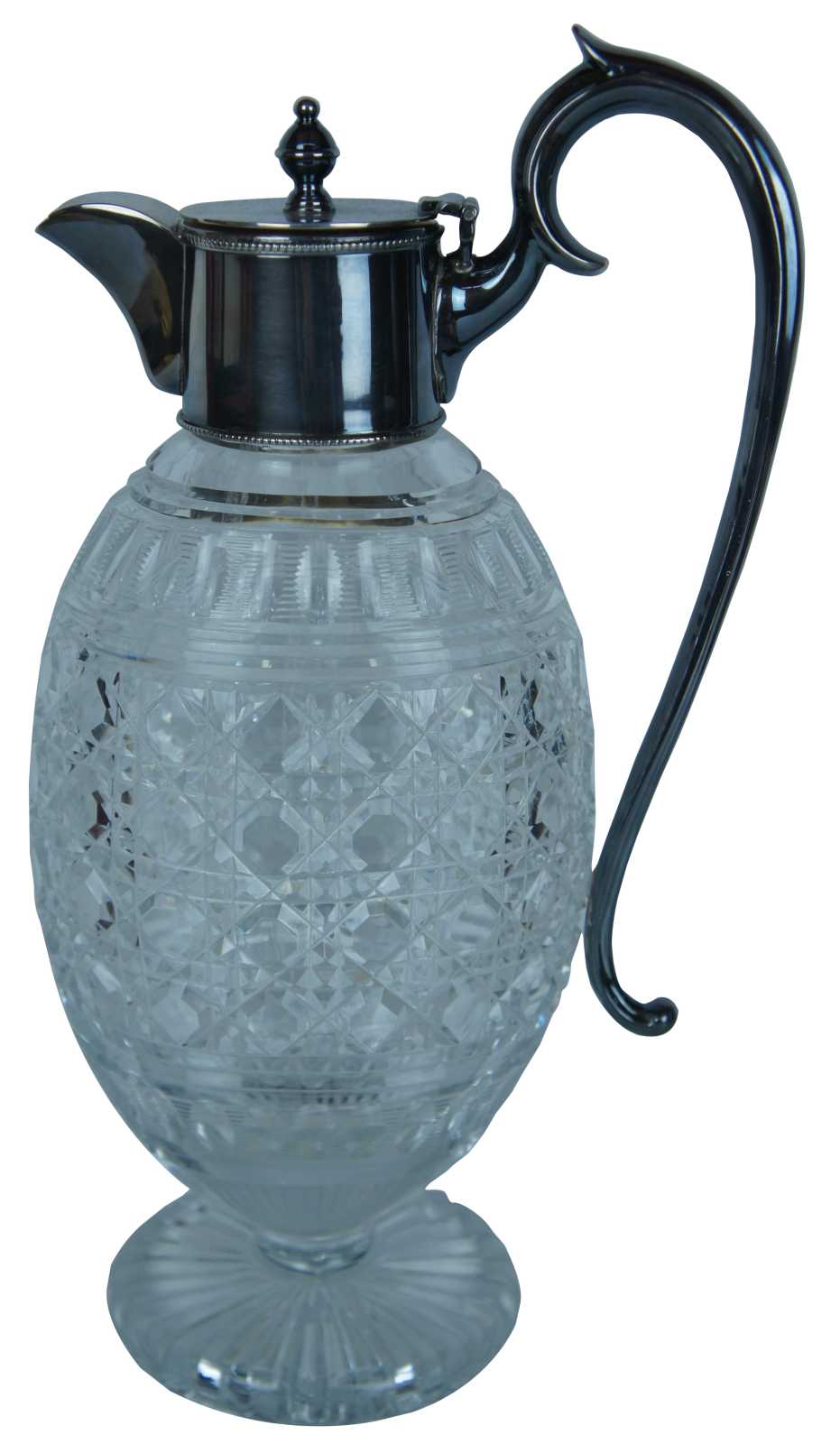 Antique Victorian Claret jug or pitcher. Made of crystal featuring a wheel cut pattern with silver plated handle, lid and spout. These jugs became popular in the 19th century for use to serve claret, a dry red wine produced in France's famous Bordeaux region.