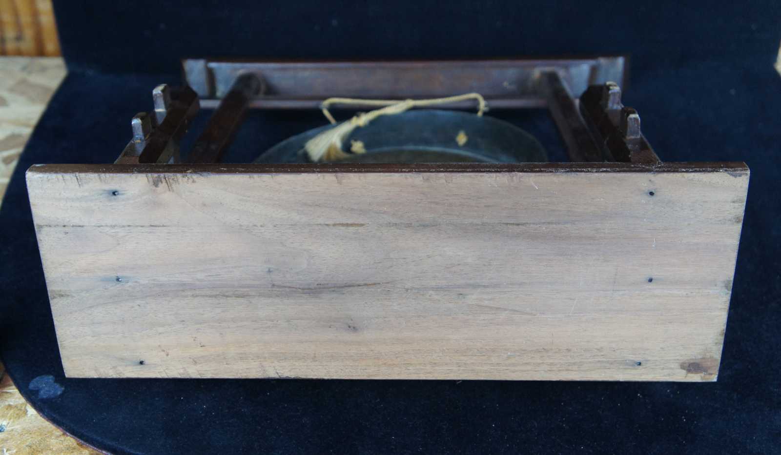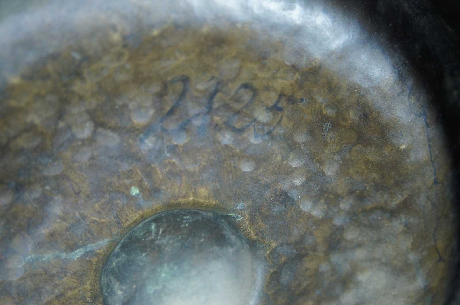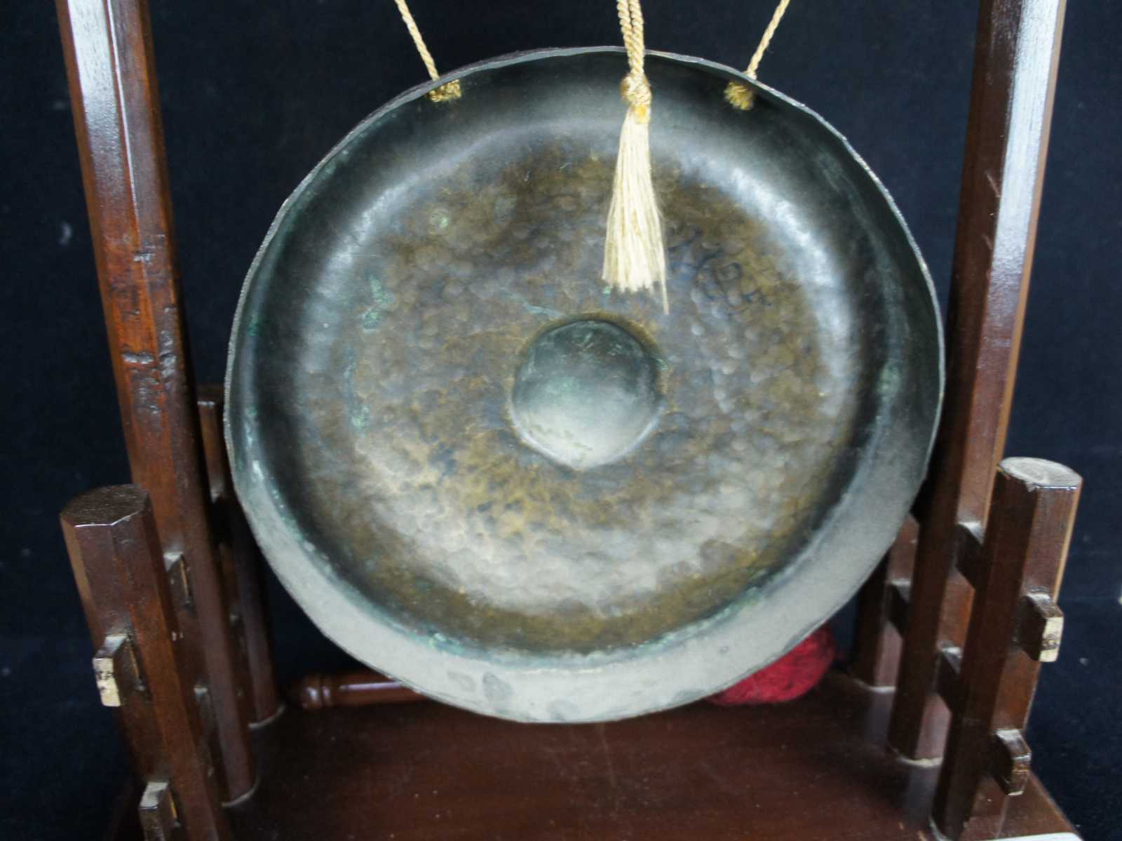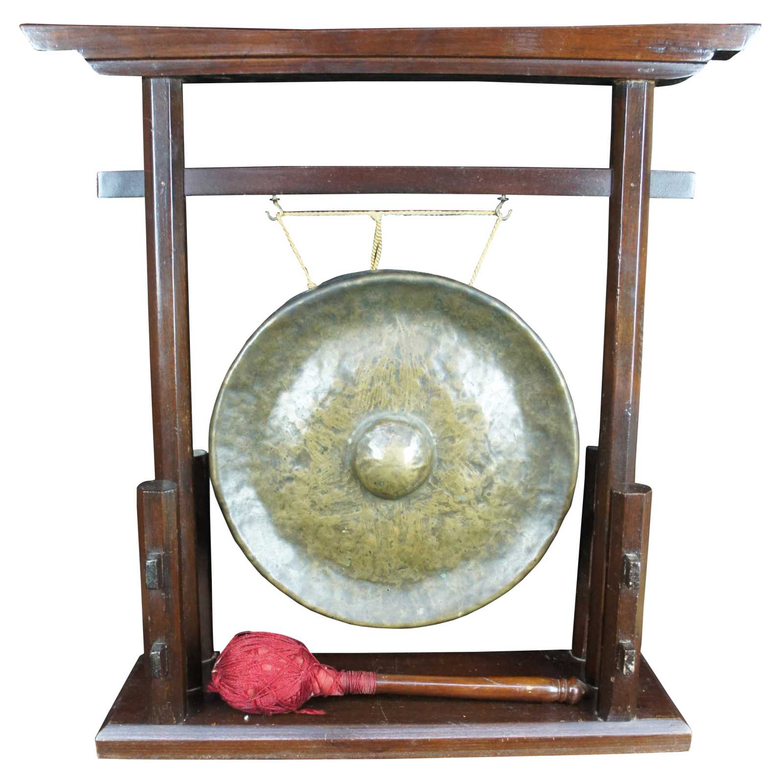 Vintage Chinese hammered bronze table gong with stand and mallet. Features deep heavy sound.