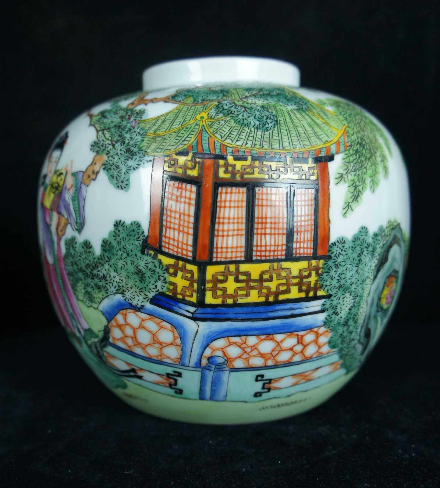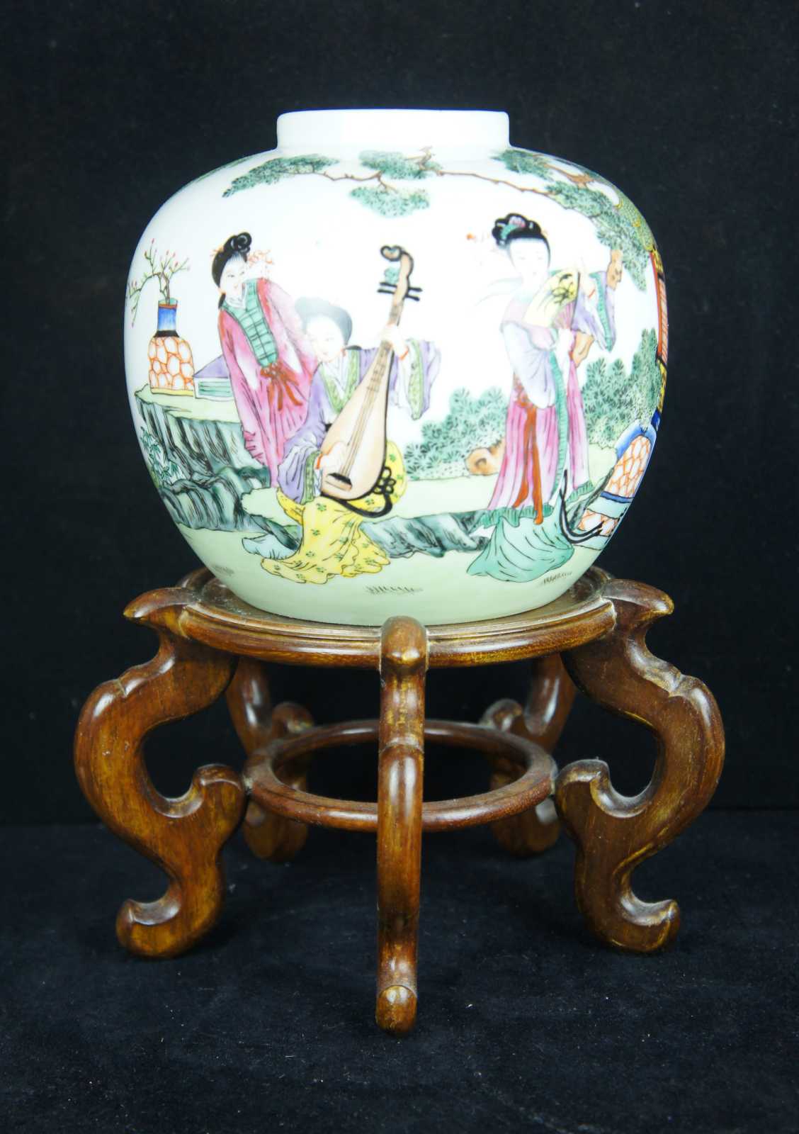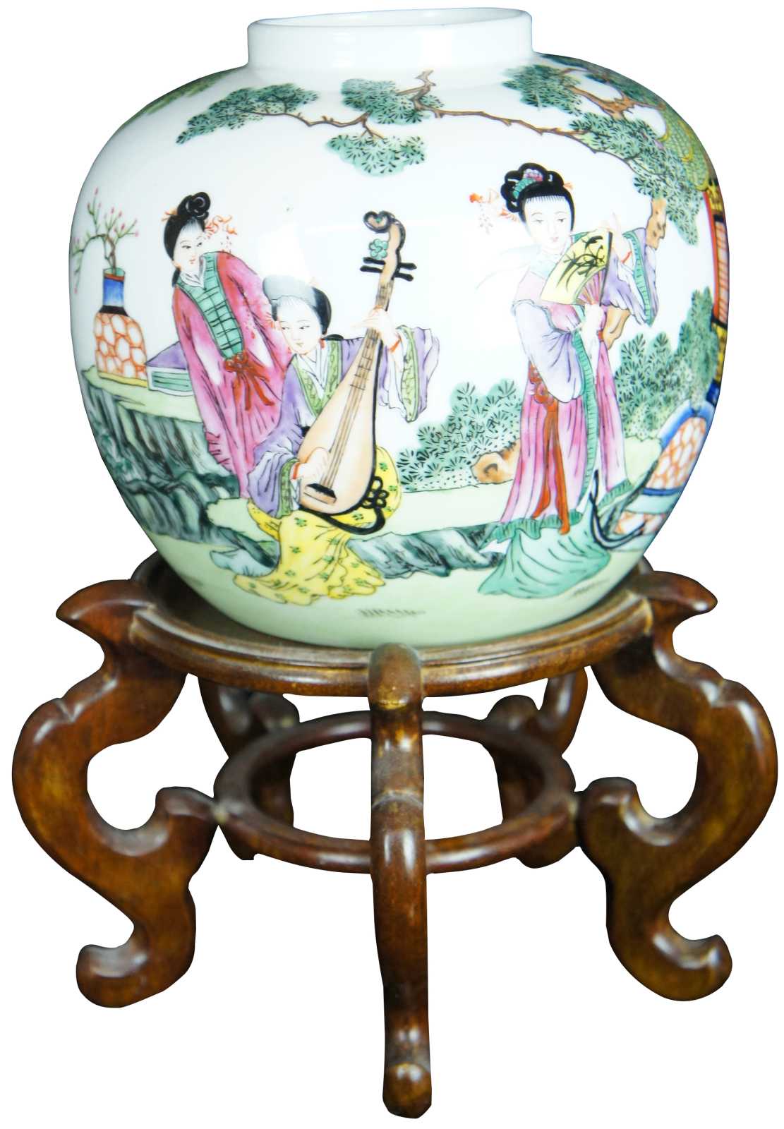 Vintage ISCO Japanese Hong Kong porcelain urn or vase with ornate hardwood base. Features hand painted floral landscape scene with geishas playing instruments outside of a pagoda.