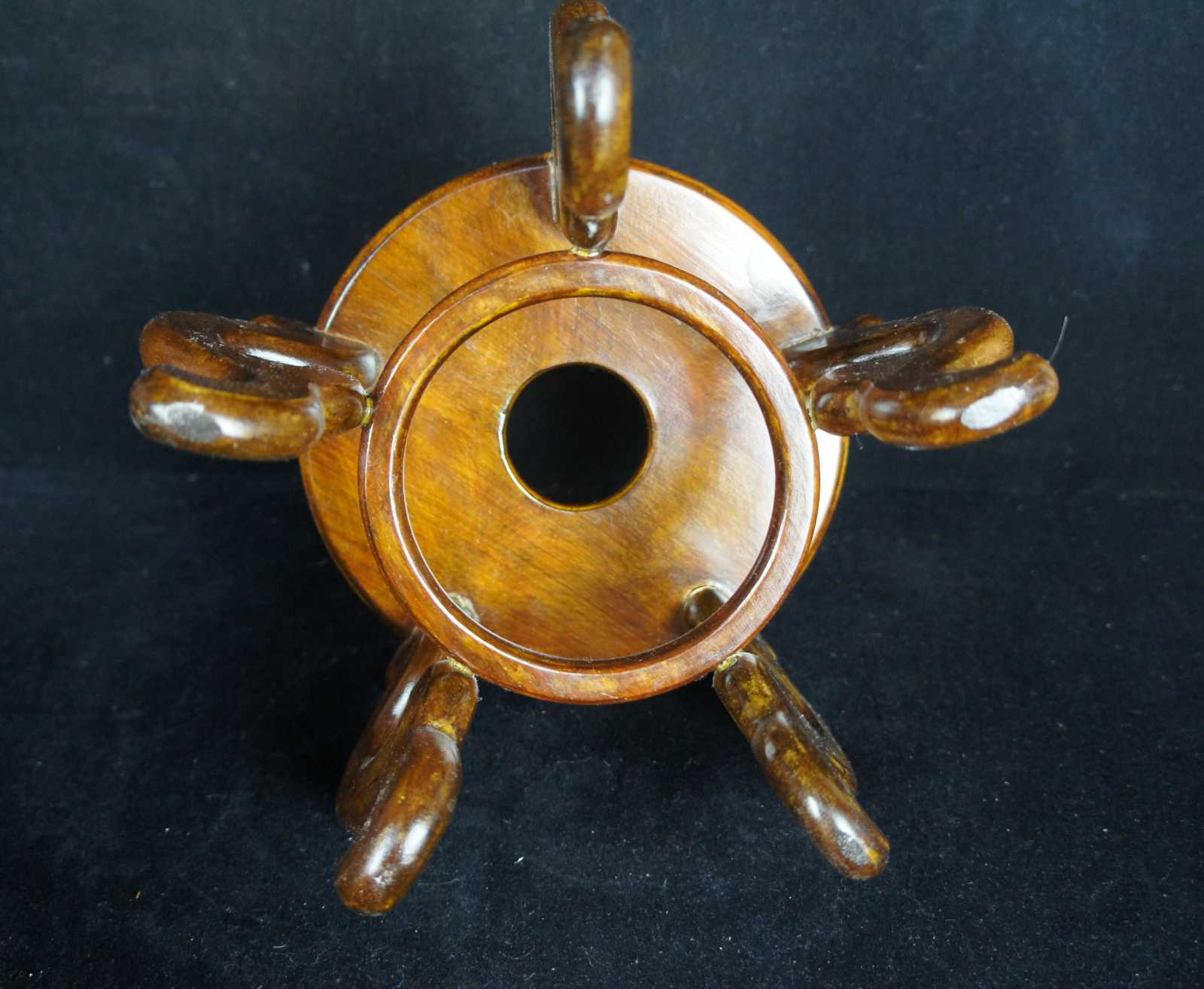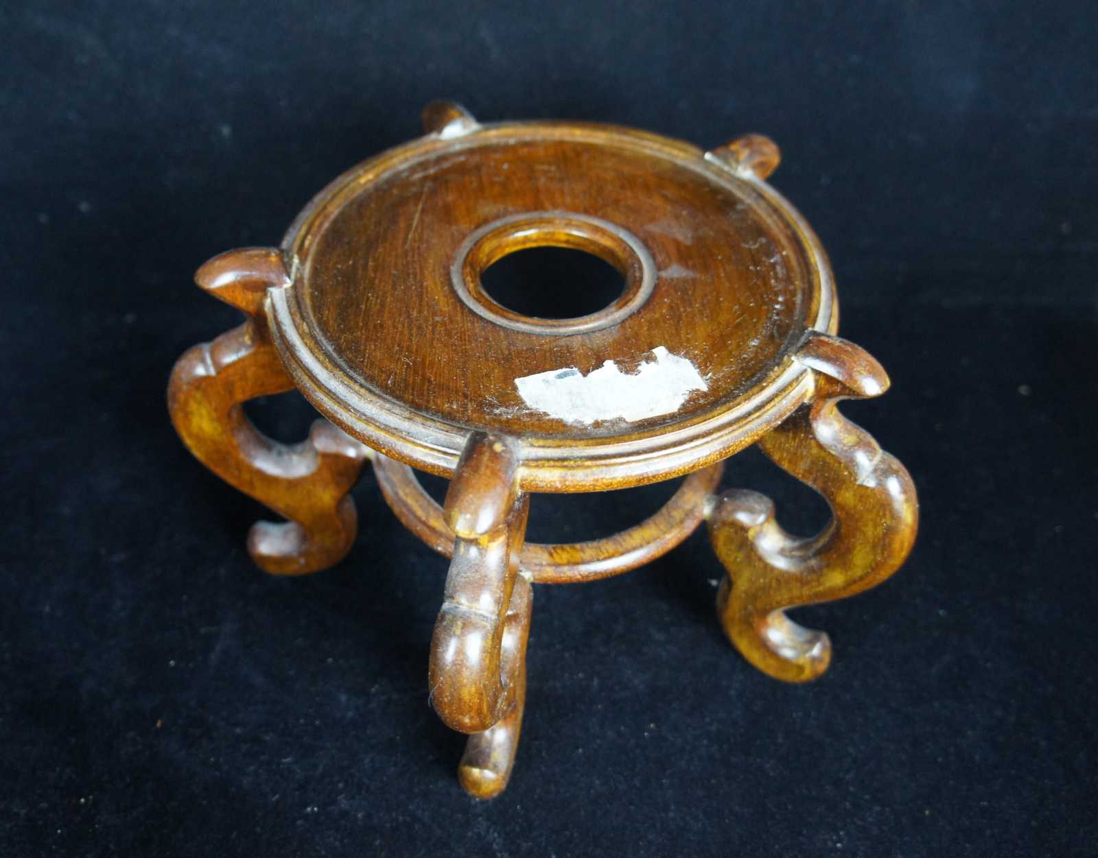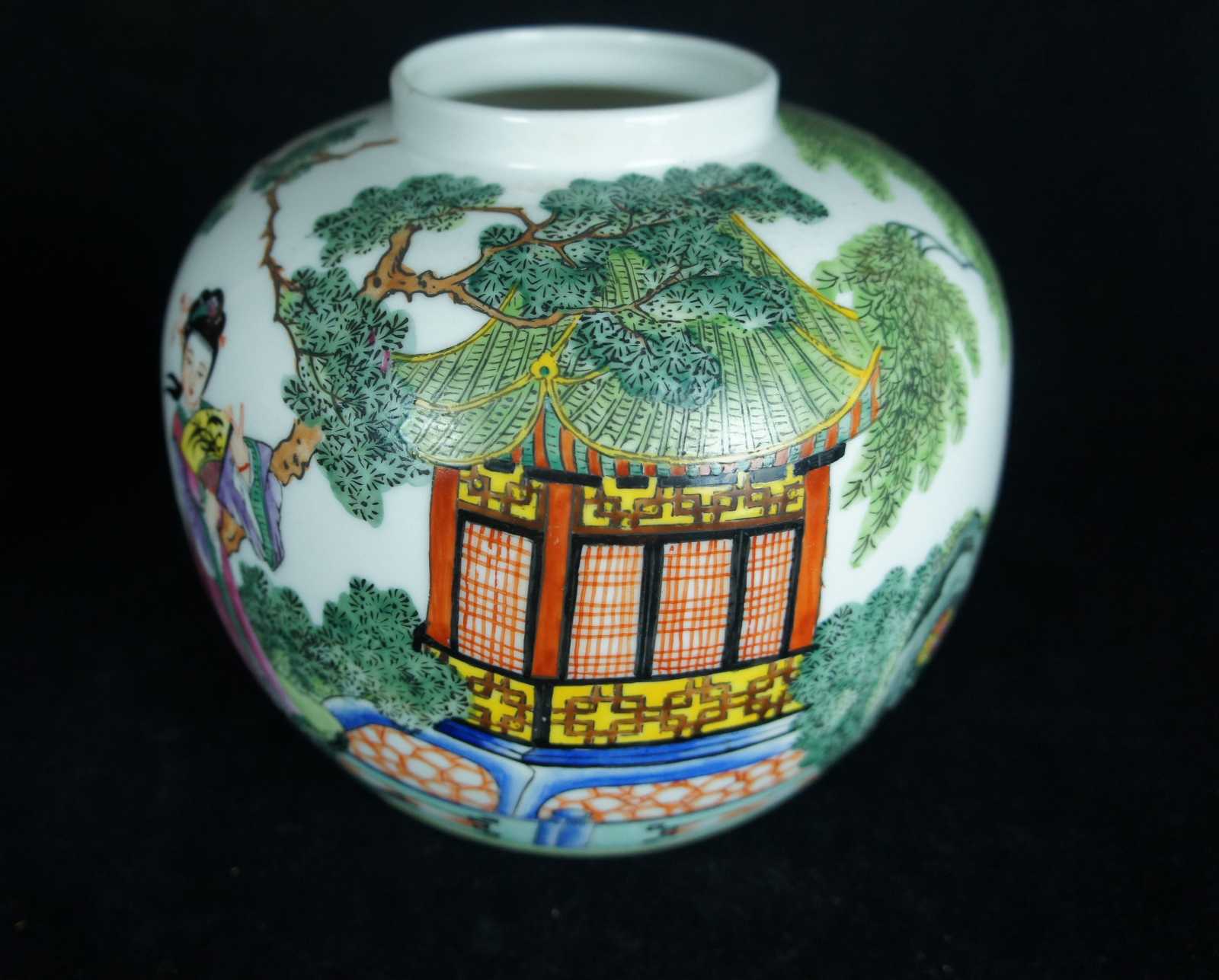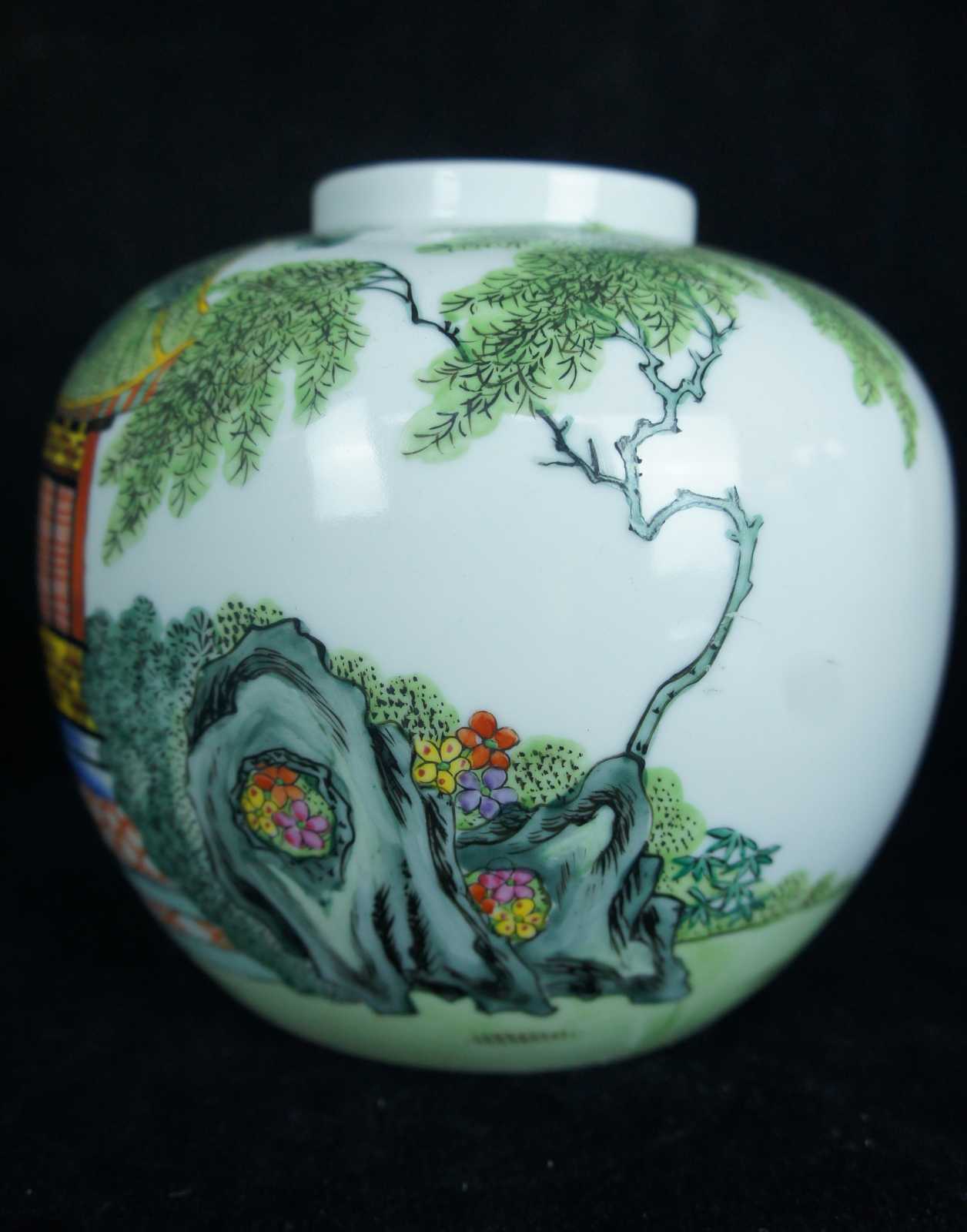 Vintage ISCO Japanese Hong Kong porcelain urn or vase with ornate hardwood base. Features hand painted floral landscape scene with geishas playing instruments outside of a pagoda.