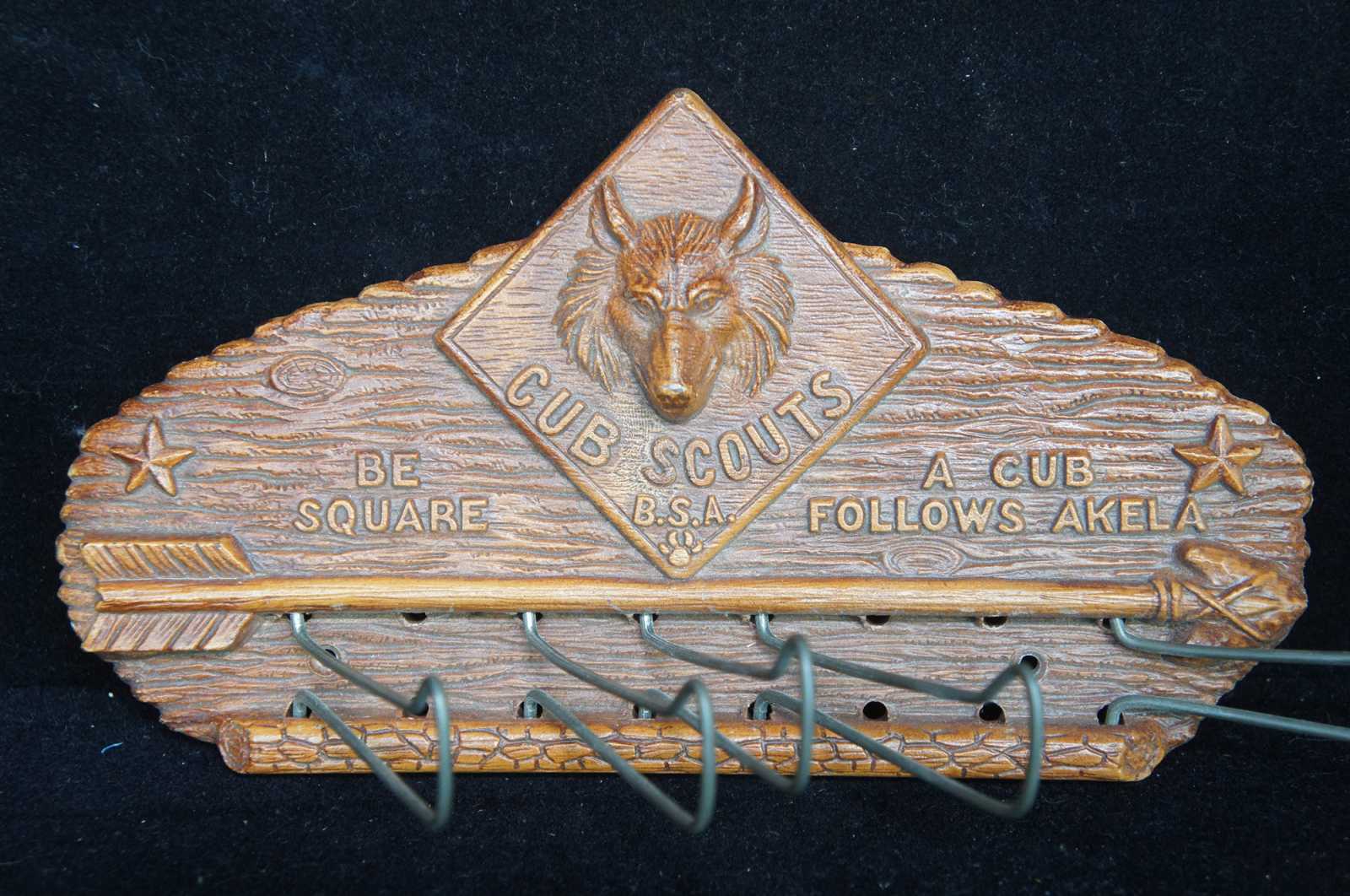 Mid century Syroco Cub Scouts BSA tie or belt rack. Made of resin featuring a wolf, arrow and the phrase Be Square, A Cub Follows Akela.