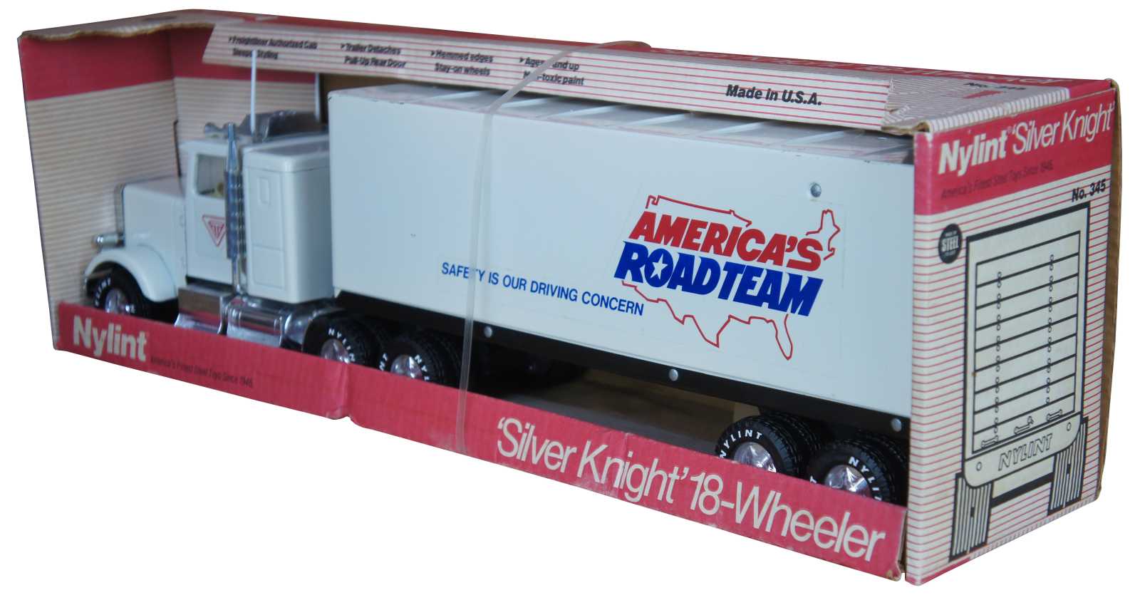 Vintage Nylint Silver Knight Americas Roadteam 18 wheeler toy tractor trailer or semi truck. No 345. Unopened, New in Box, NIB.
