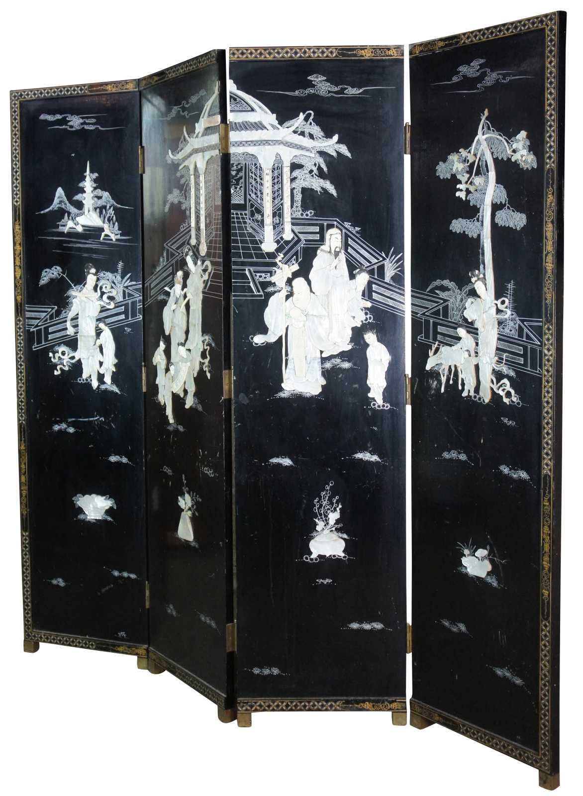 Mid 20th century Chinese four panel wall divider or screen. Made of wood featuring black lacquer with mother of pearl and soapstone landscape sceen of geishas with children and animals outside of a pagoda or temple. Accented with decorative gold border and reverse side depicting floral motif. Screen rest on lacquered brass block feet.