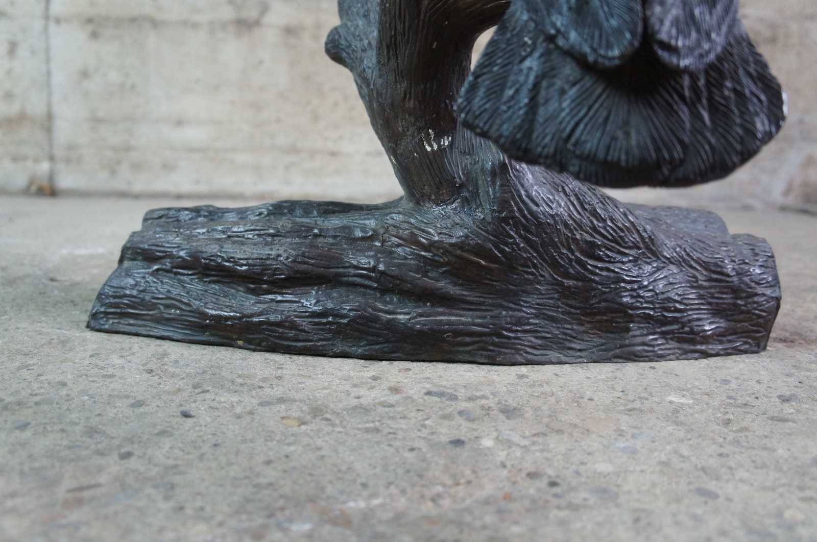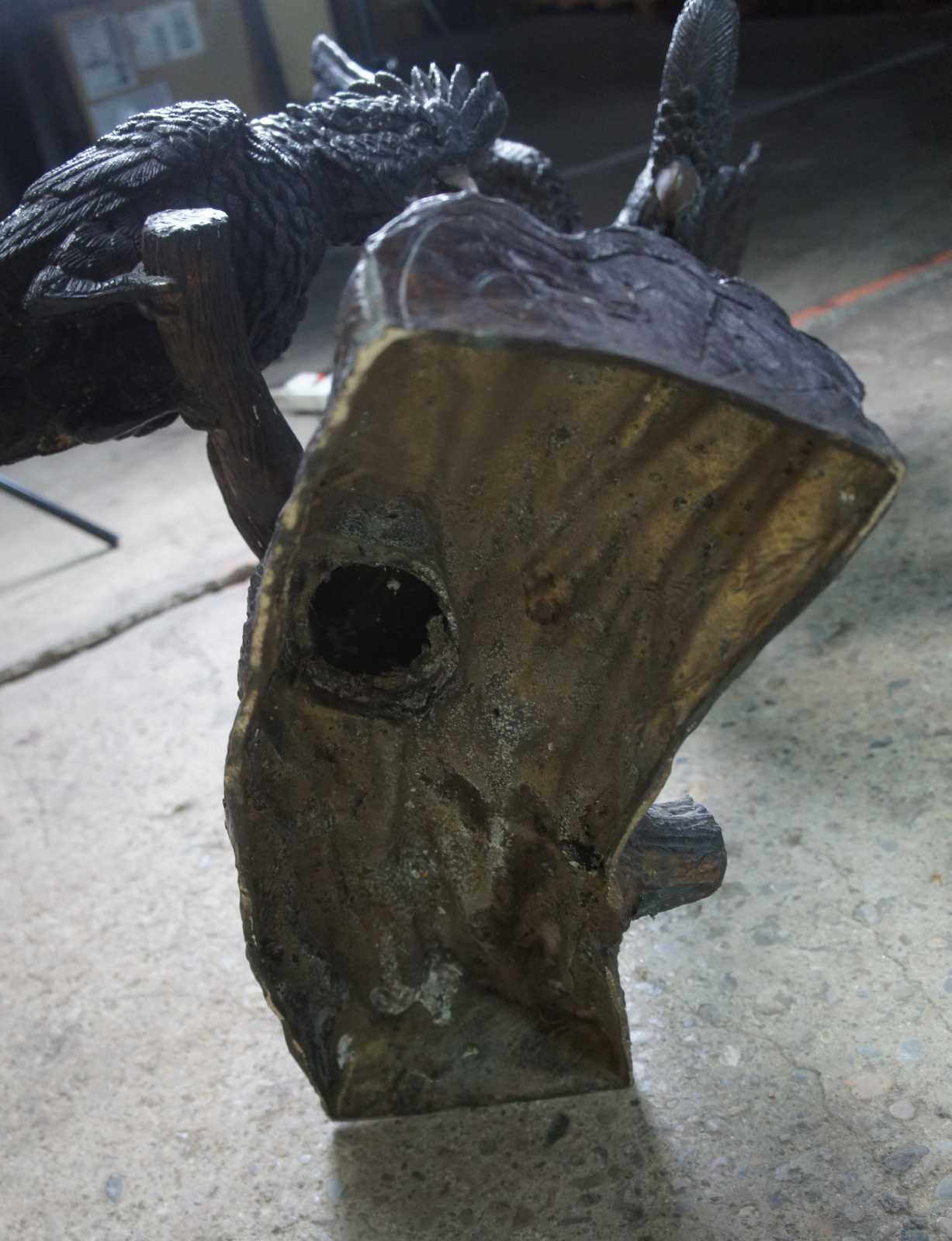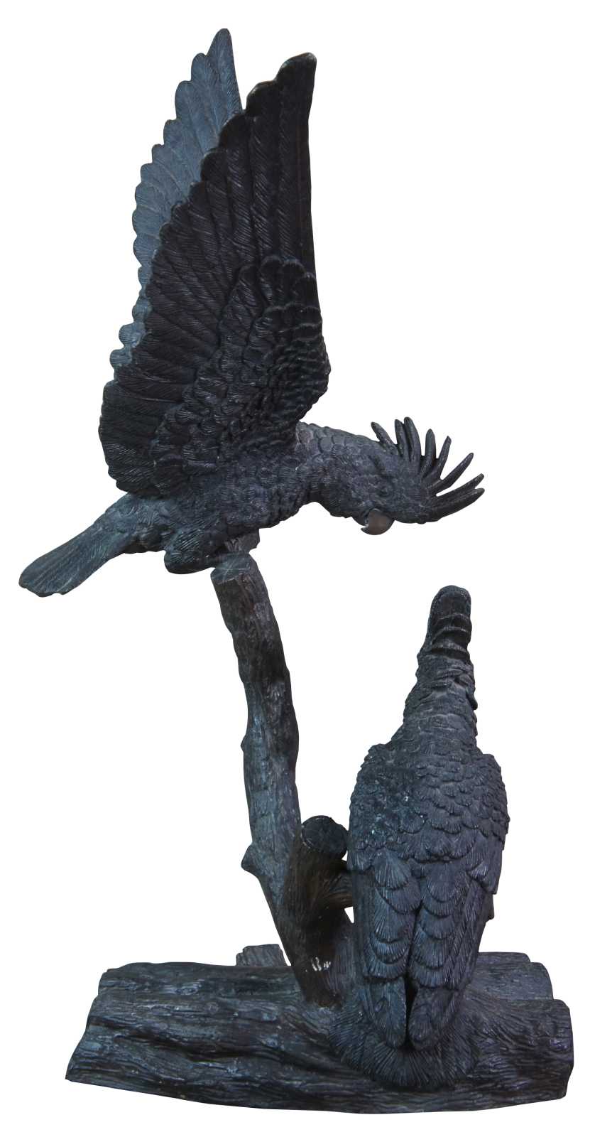 Mid 20th Century French bronze Cockatoos / Parrots or birds. This life size art sculpture features a mated pair perched on a tree branch or log with realistic feathers, beaks and eyes. Made from the "lost wax" casting method. Great for use indoor and outdoor.