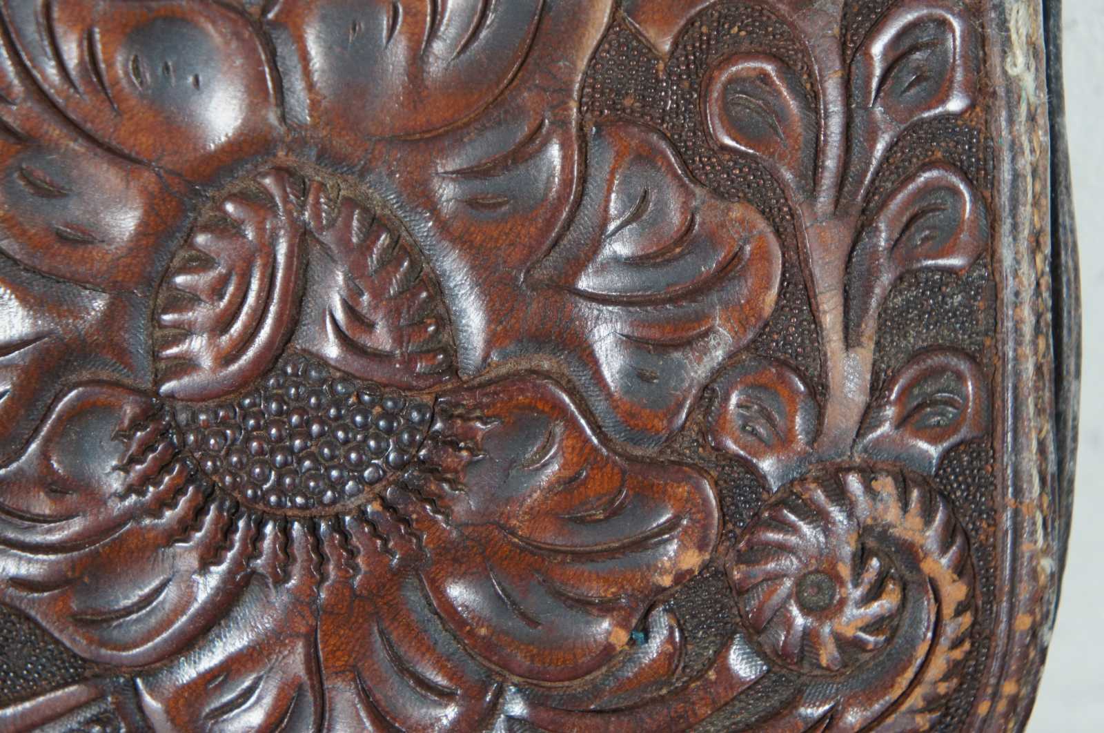 Antique brown leather pouch, wallet or purse with tooled floral design on the back and the initials SIH on the front; contains one interior pocket; snap closure.