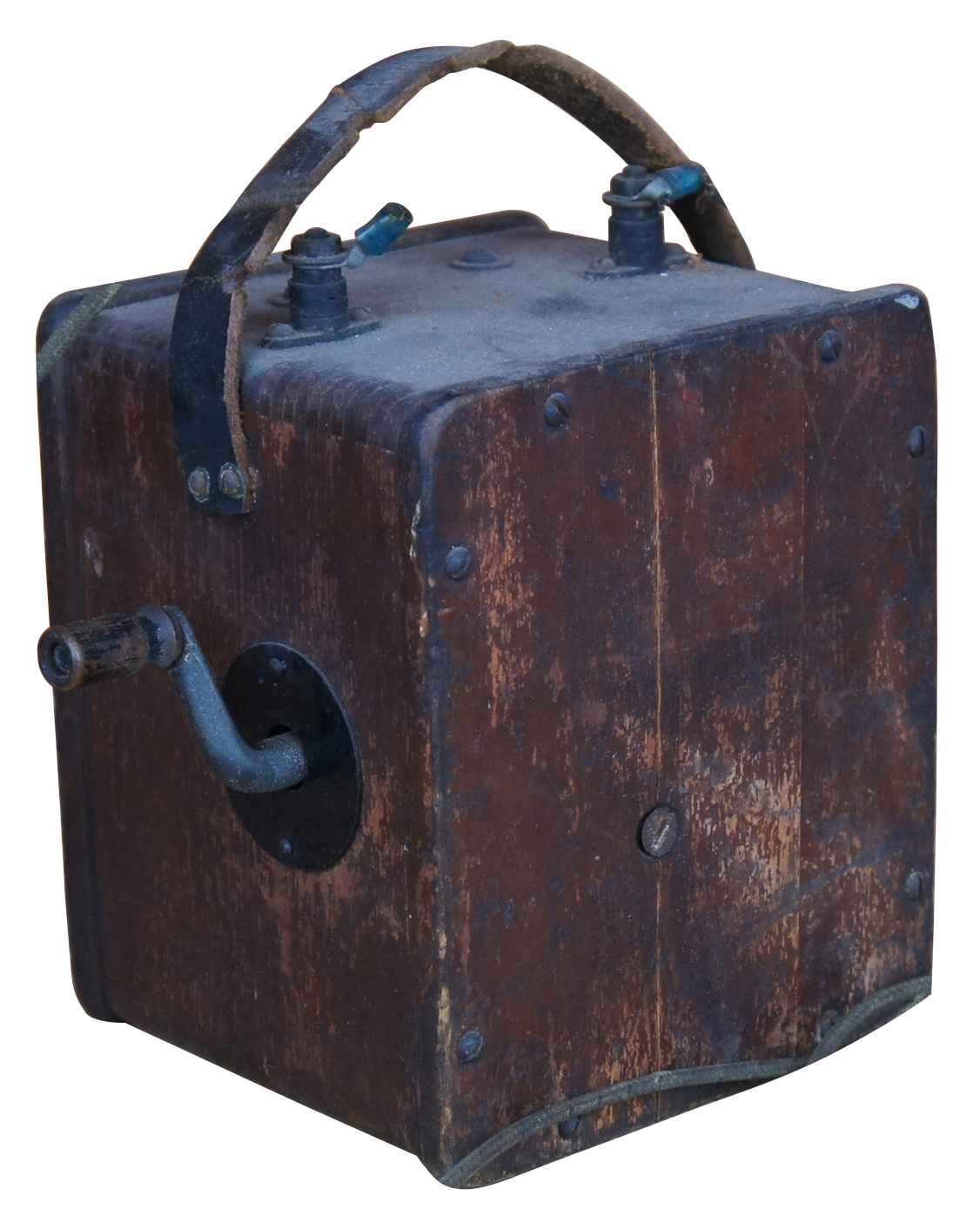 Antique Western Electric Magneto. Features an oak case with fingertailed dovetailing, hand crank and wires.