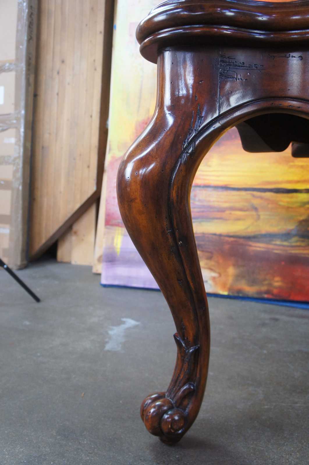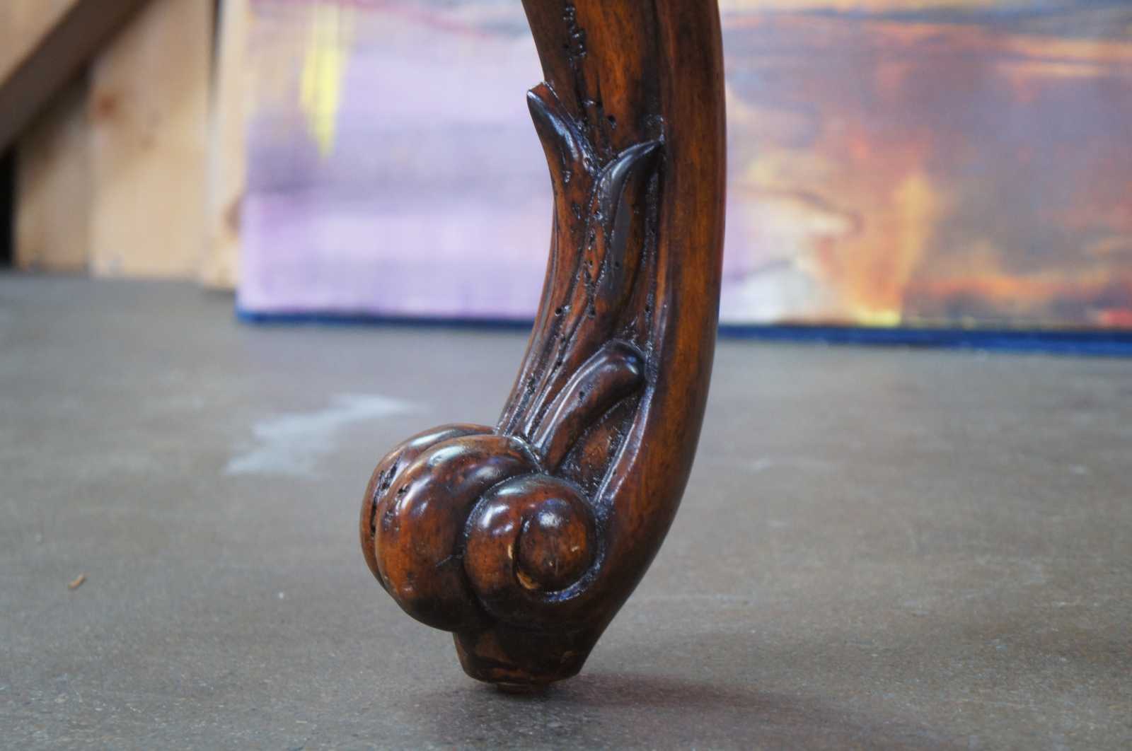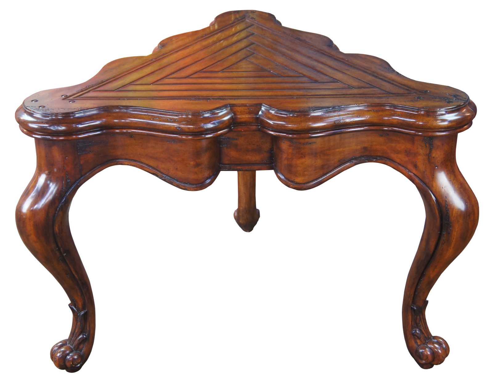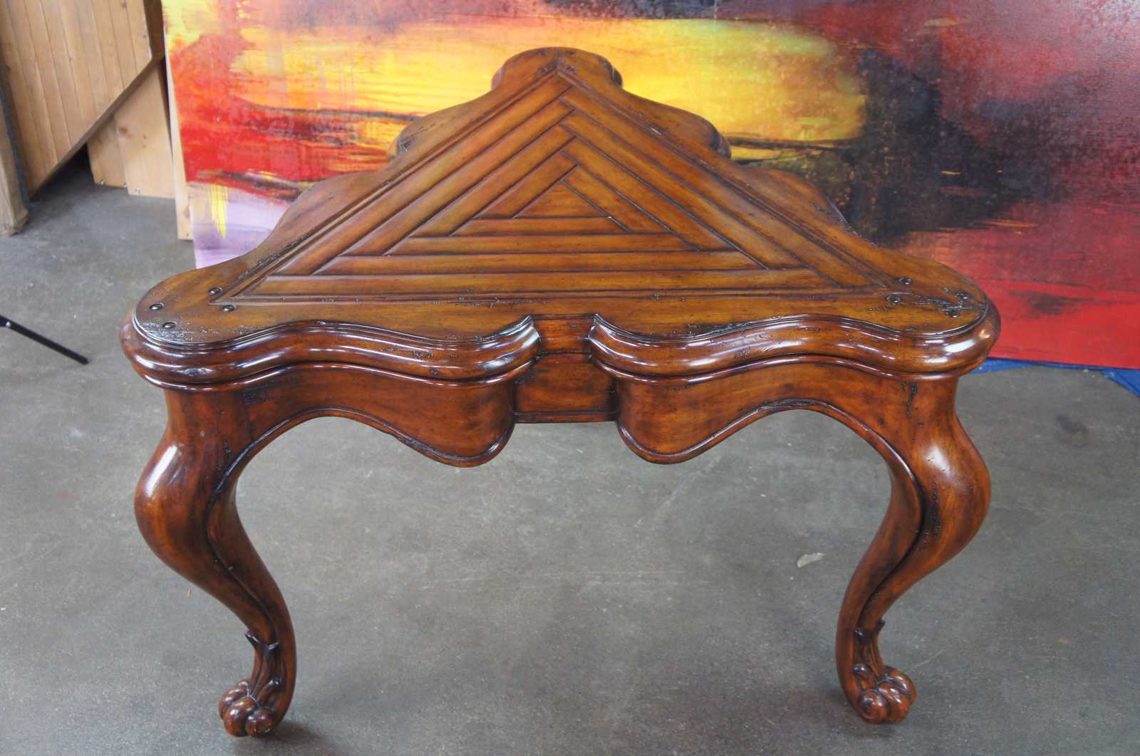 Vintage Marge Carson Liore Triangular center table. Made of mahogany featuring a sculpted triangle form with serpentine apron, cabriole legs and acanthus scrolled feet.