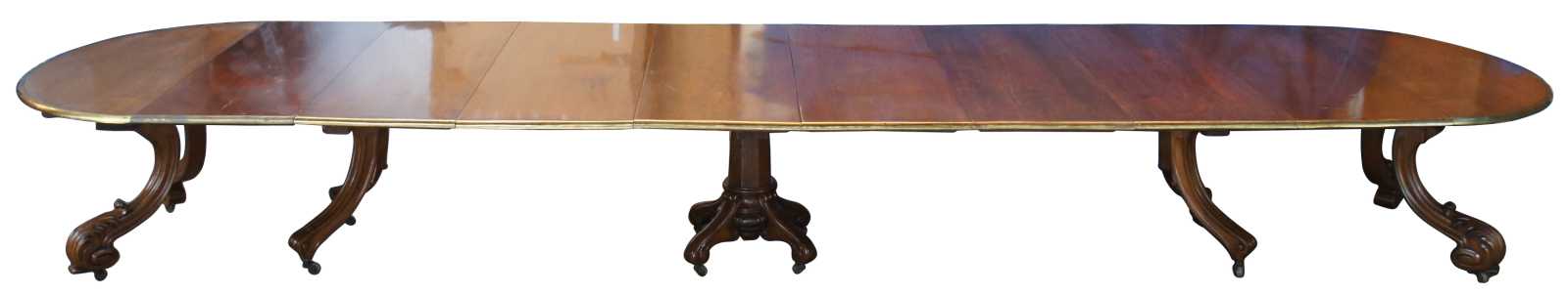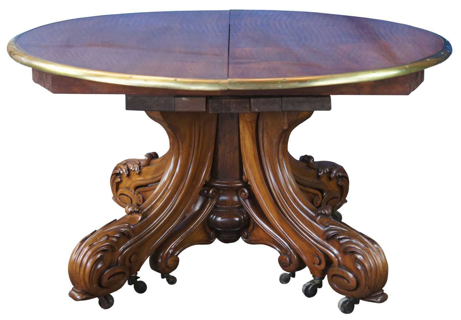 A fine and impressive round extendable museum quality conference or dining table, circa 1850s. Made from solid walnut with 3 stage extendable brass banded top Features acanthus scrolled and carved legs as well as casters for ease of opening. The 8 leaves allow it to be used at just about any length between 4.25' and 18.5 feet.