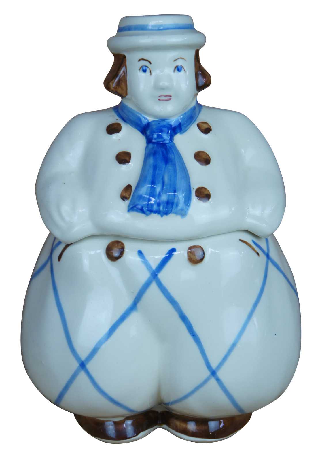 Vintage Dutch boy cookie jar made by Shawnee Pottery of Zanesville, Ohio, and is circa the 1940s. He is also known as “Happy Jack” and he is wearing a flat topped hat, a blue necktie and features a blue lattice pattern on his over-sized pants / breeches. He has brown hair, brown buttons and brown shoes