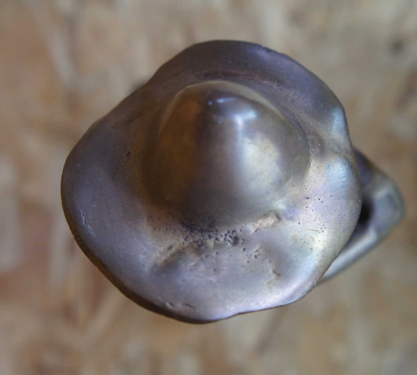 Vintage mid century bronze statue of a young boy or fisherman remeniscent of Huckleberry Finn. Features a boy standing on the rocks wearing makeshift clothing with a straw hat, inspecting his catch.