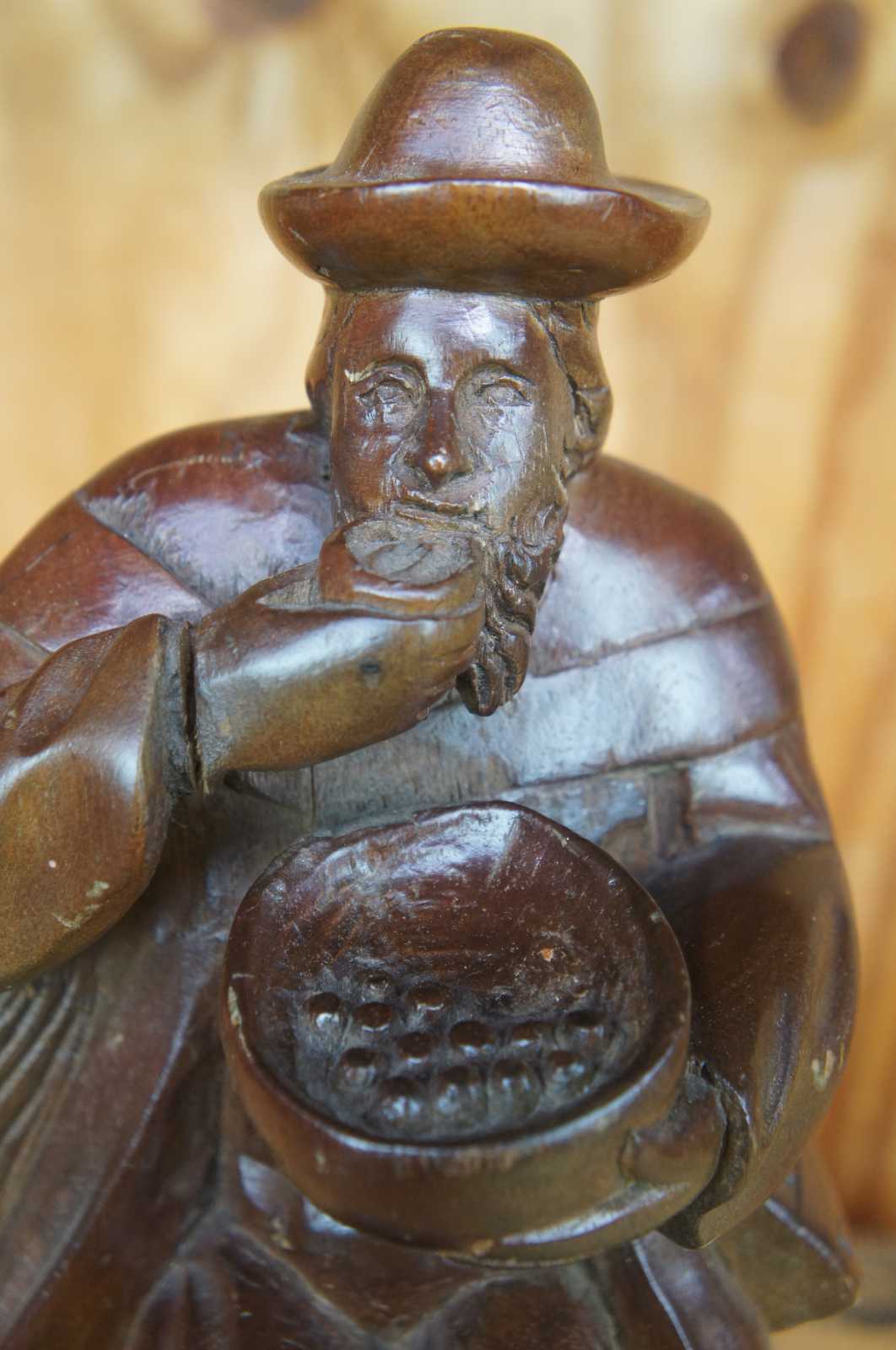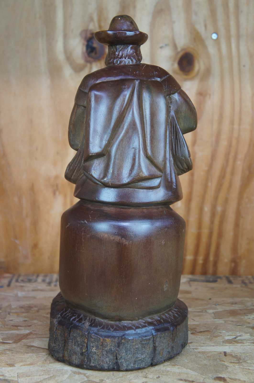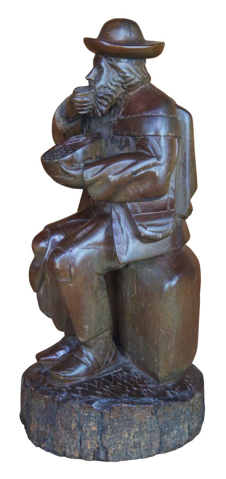 Vintage folk art carved sculpture of an old man eating a pie. Features live edge base that leads up to mountaineer carving.