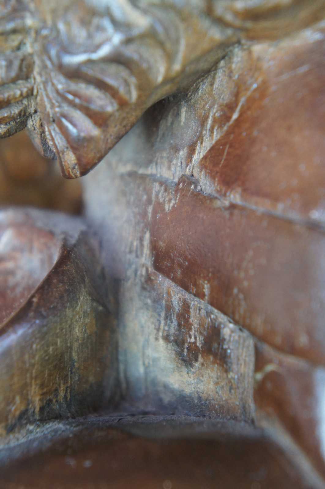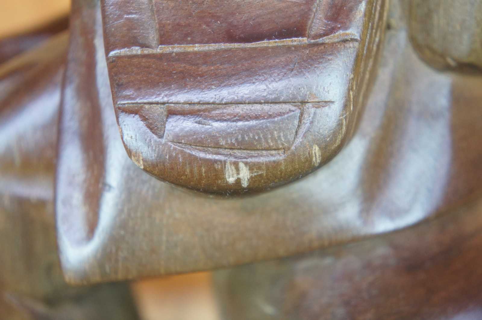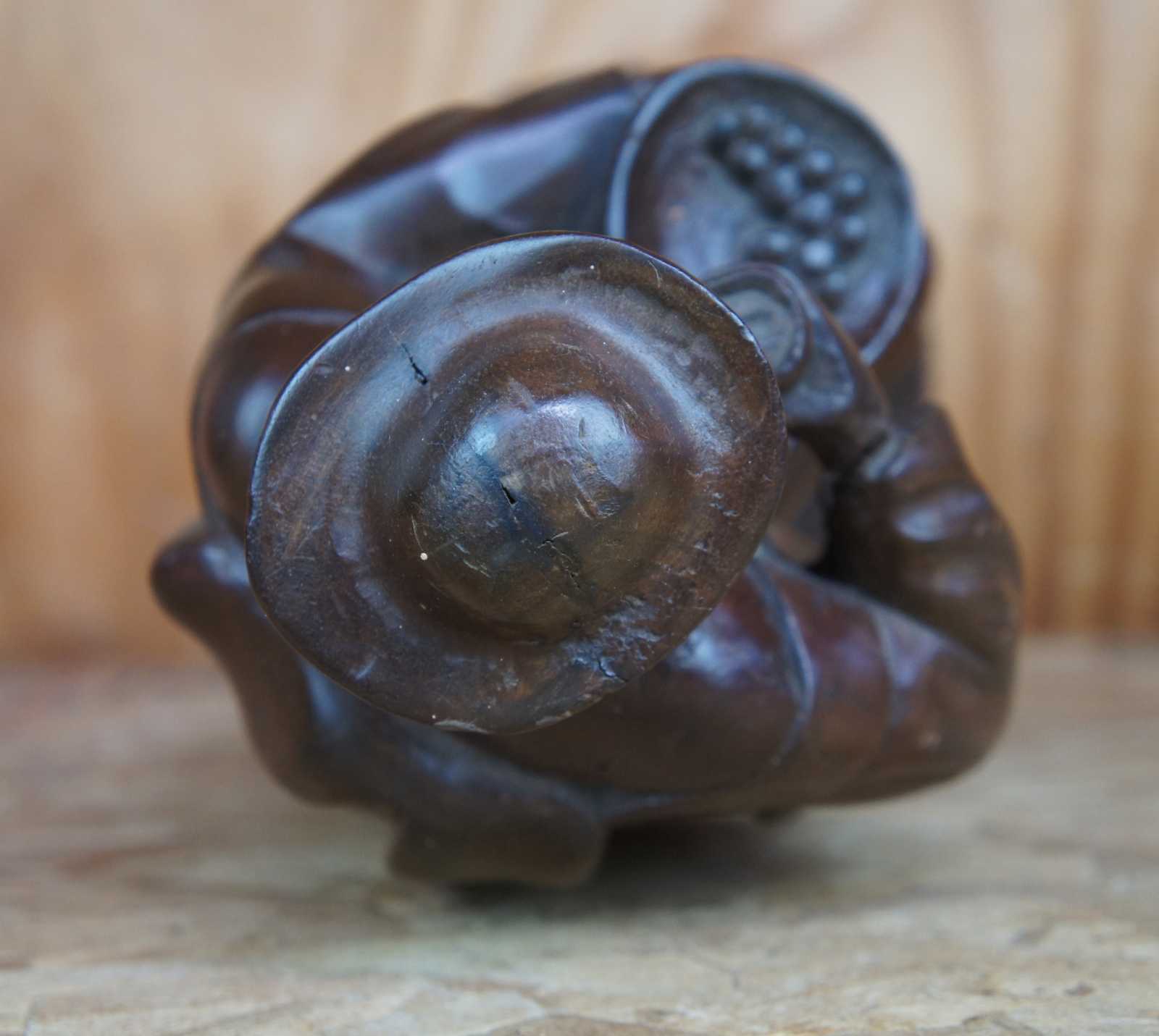 Vintage folk art carved sculpture of an old man eating a pie. Features live edge base that leads up to mountaineer carving.